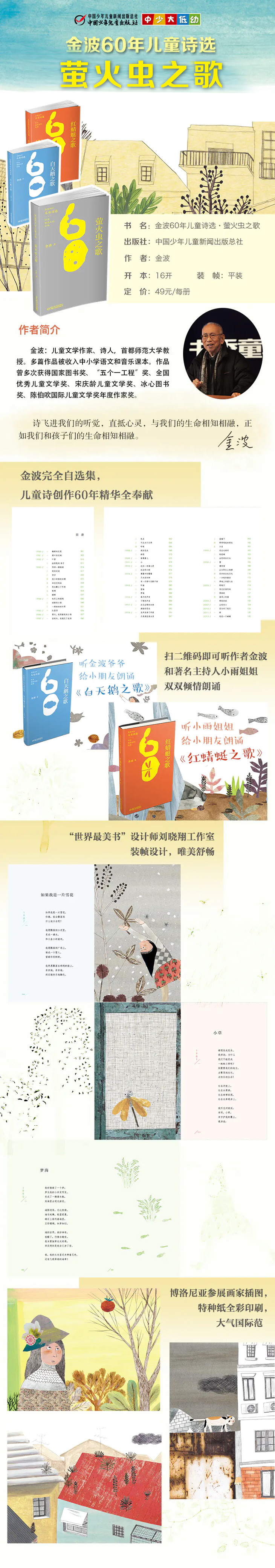 《萤火虫之歌》为“金波60年儿童诗选”系列第2册,收录金波先生近60年经典诗作60首,内容略深一层,侧重叙事,包含丰富的情节,其中包括《呼唤》、《我的足迹》、《那样一棵榕树》、《薄暮中的鹭鸶》等知名篇目。作者站在孩童的视角去看世界,于日常之中见新奇,通过细腻的叙事和流畅的情节,将所见、所思、所感糅进轻松明快的诗歌里,为读者展现一片至纯至美的天地。