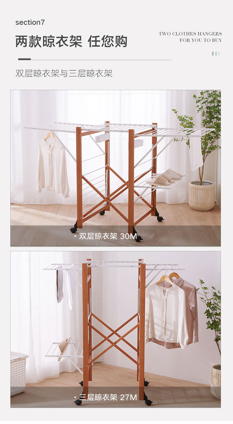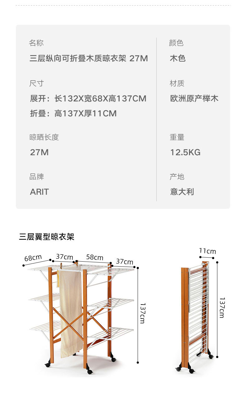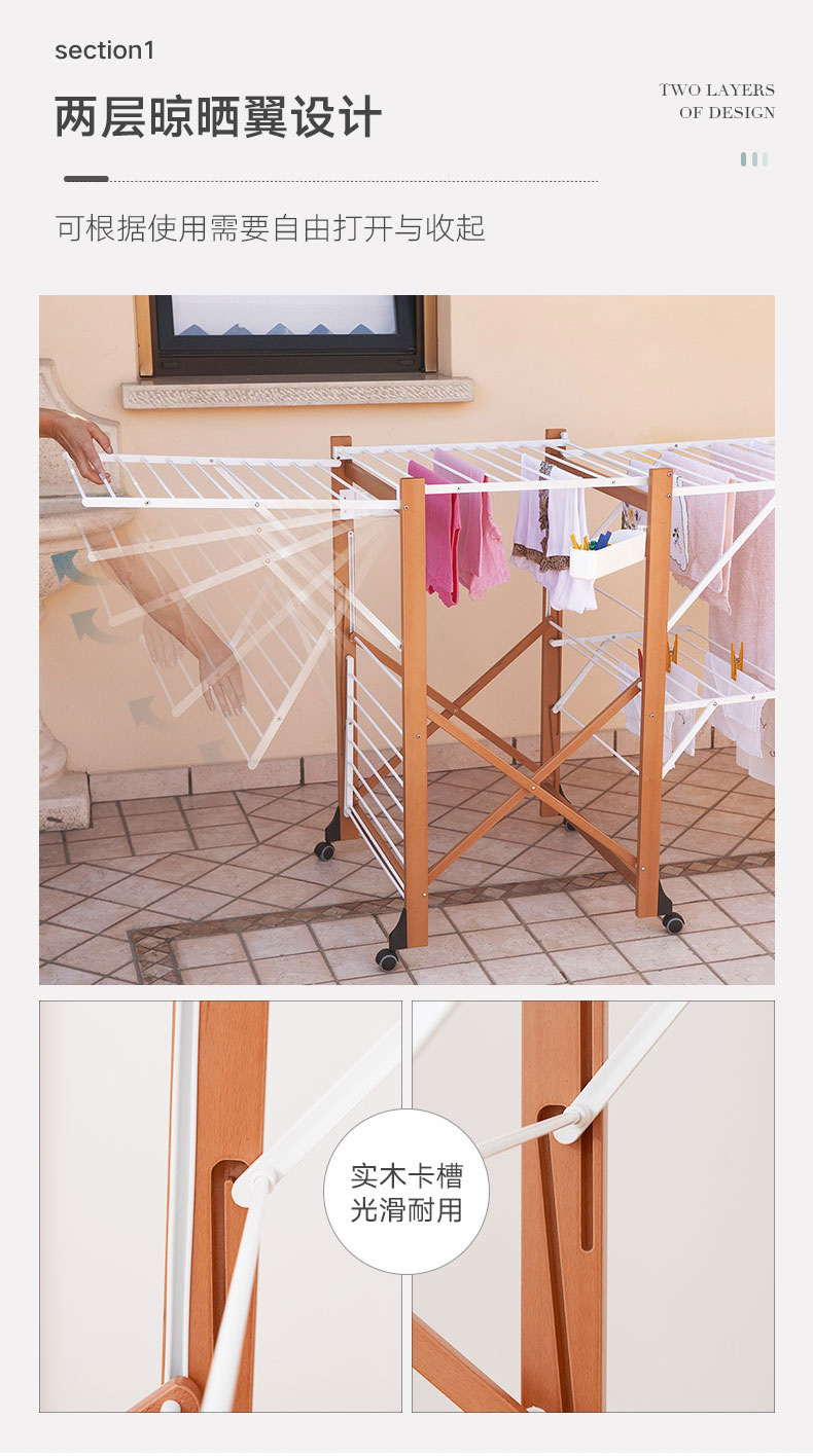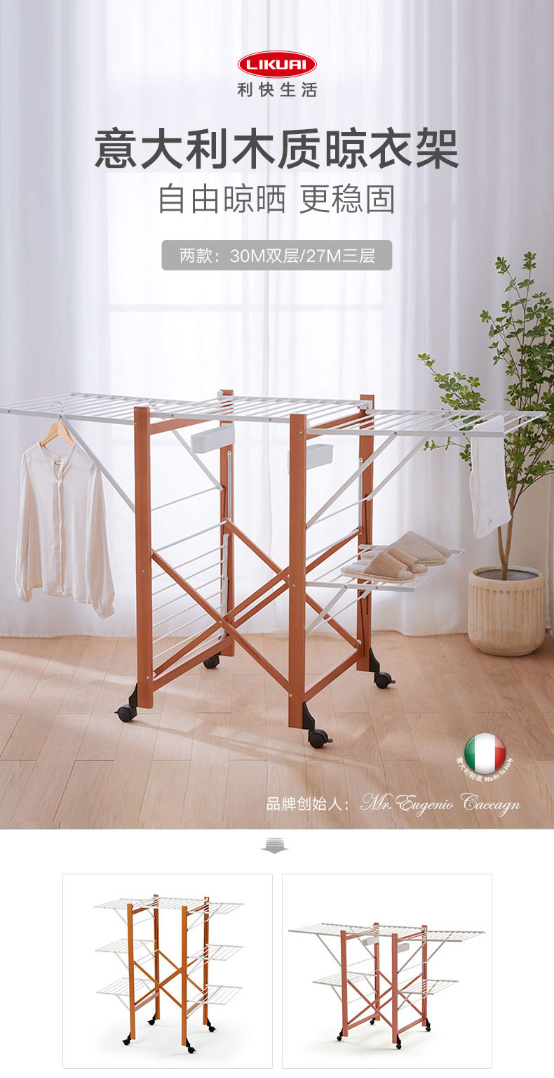 【6F】利快意大利进口三层晾衣架实木可移动折叠阳台落地伸缩衣杆晒衣架 三层晾衣架 27M