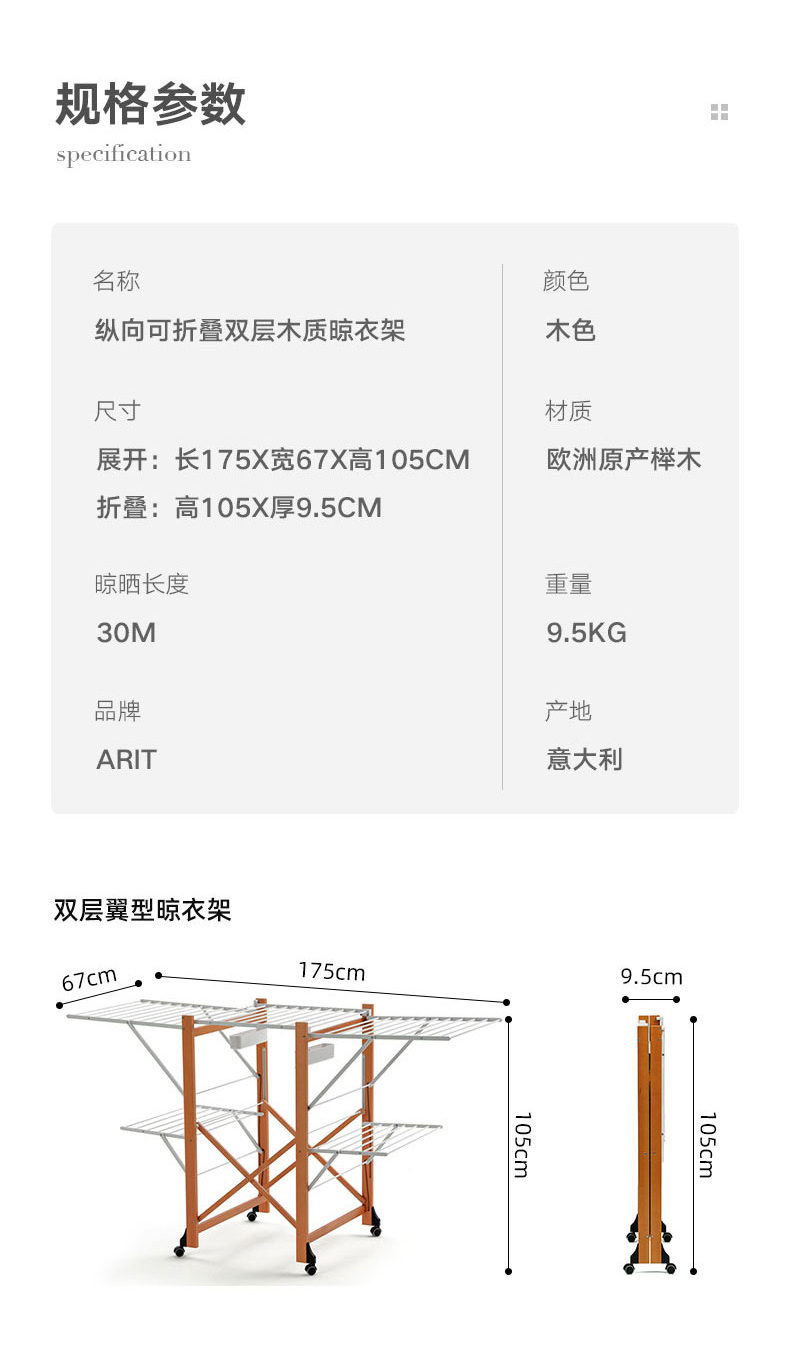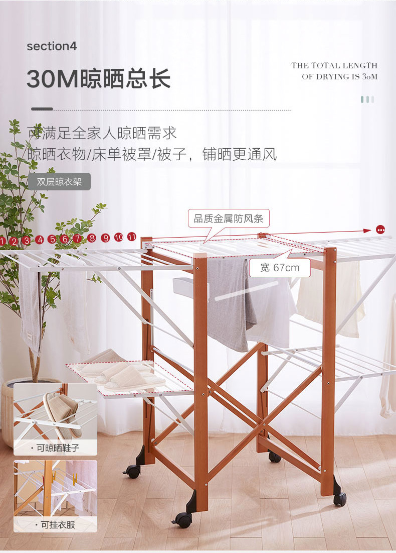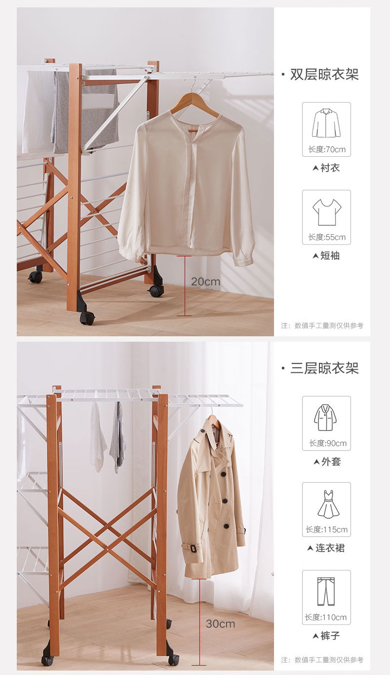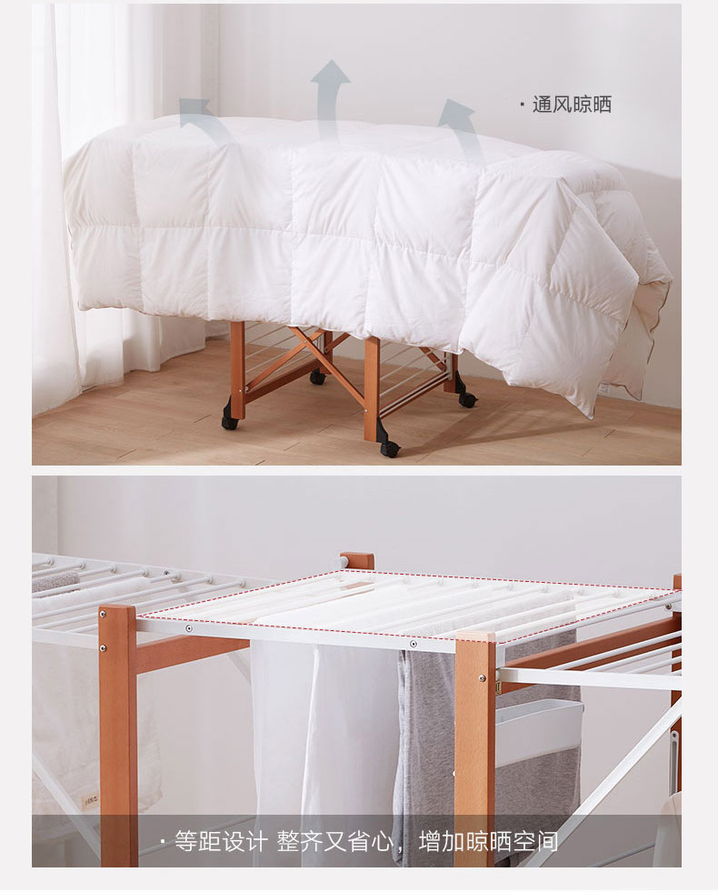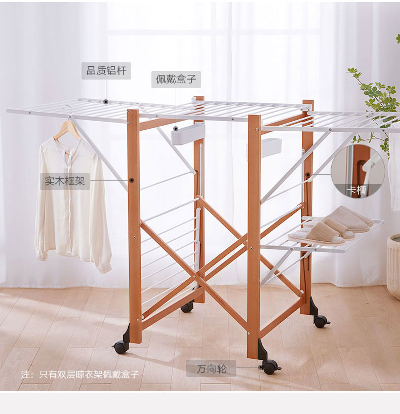 【6F】利快意大利进口三层晾衣架实木可移动折叠阳台落地伸缩衣杆晒衣架 三层晾衣架 27M