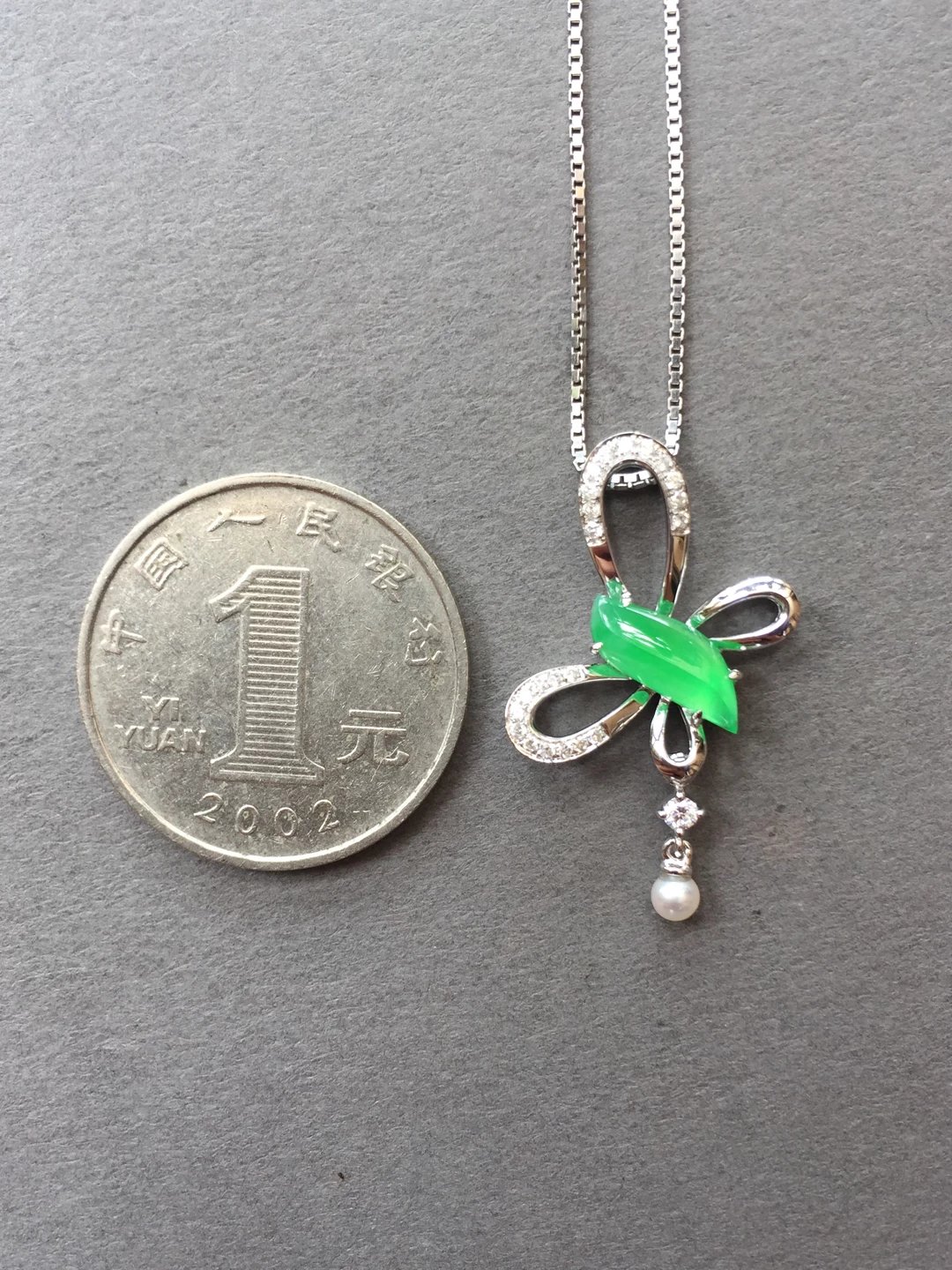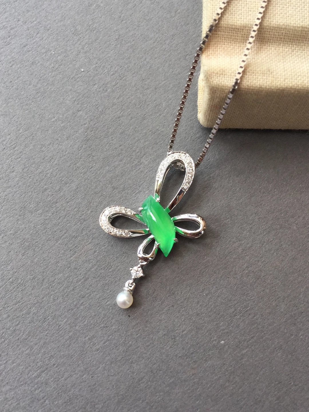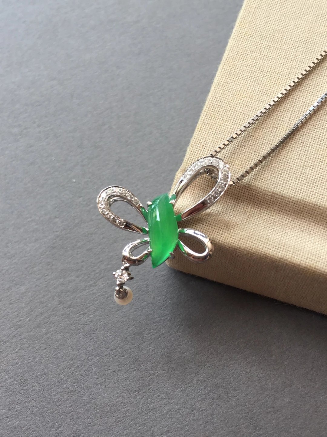 设计师款,翩翩起舞的蝴蝶,冰种阳绿翡翠主石长11.8mm,木那的种色,荧光四射,色泽艳丽,镶嵌后20.2×22.8×5mm。非对称设计的蝴蝶造型活泼靓丽,18k白金钻石镶嵌,点缀珍珠,上身翩翩起舞