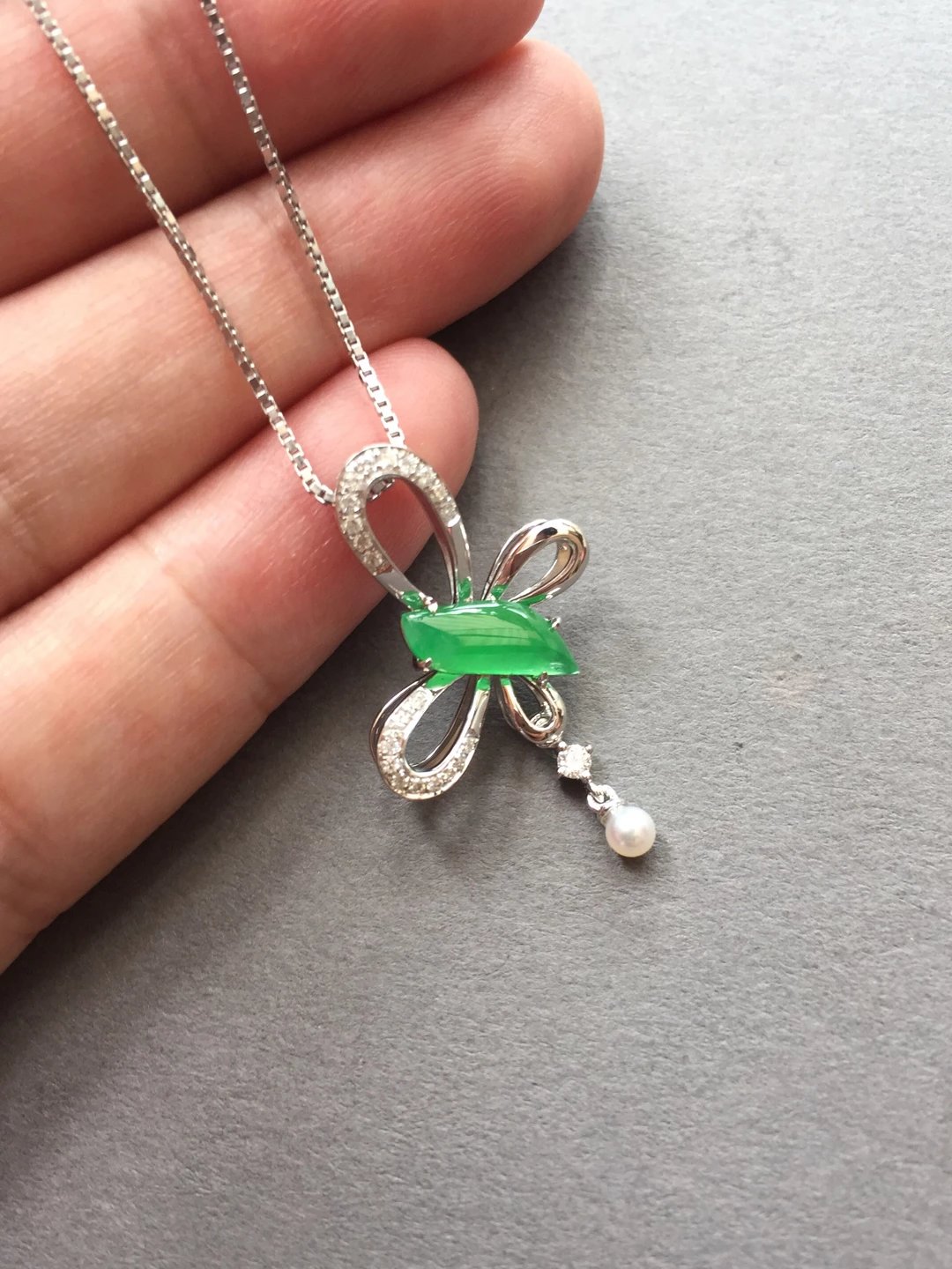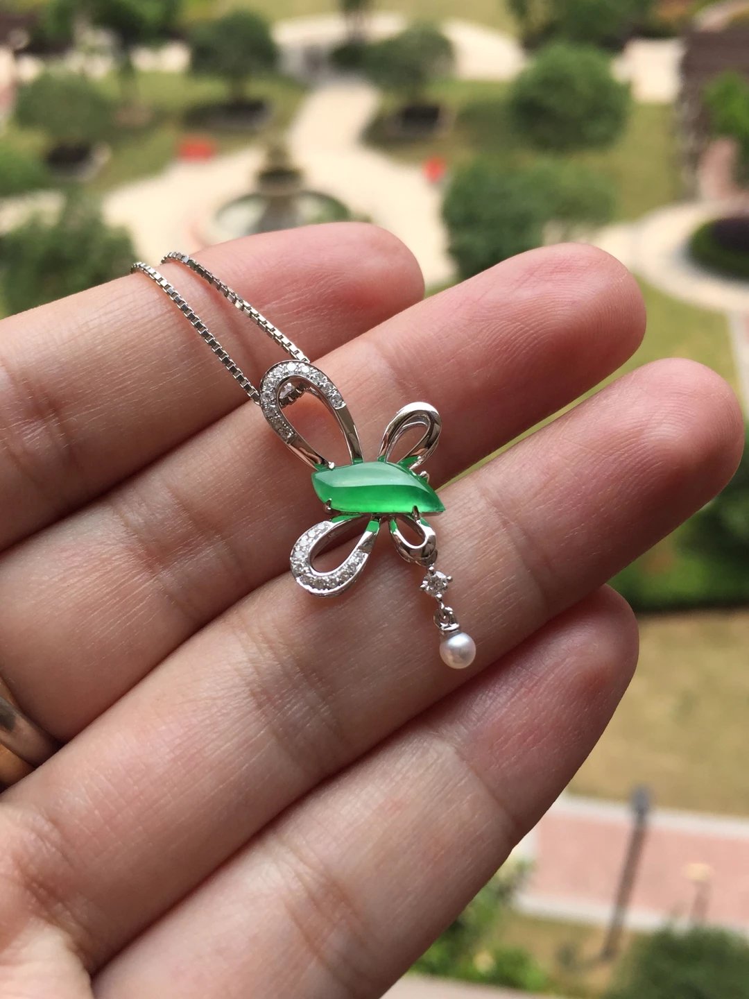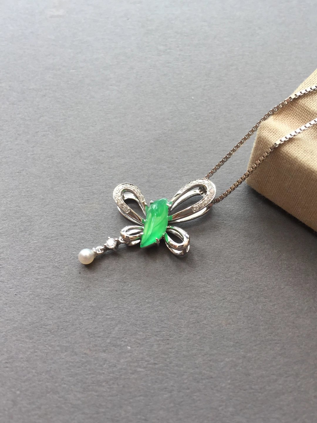 设计师款,翩翩起舞的蝴蝶,冰种阳绿翡翠主石长11.8mm,木那的种色,荧光四射,色泽艳丽,镶嵌后20.2×22.8×5mm。非对称设计的蝴蝶造型活泼靓丽,18k白金钻石镶嵌,点缀珍珠,上身翩翩起舞