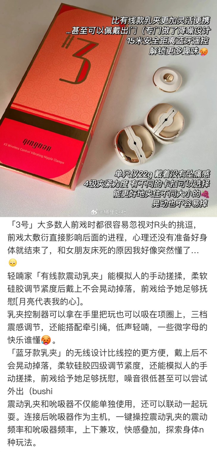 轻喃3号震动乳夹:口味就更重了,我个人觉得更适合双人,自己夹没那氛围,一定得把摇控器掌握在对方手中,有那么点点受虐倾向了,才能更投入!