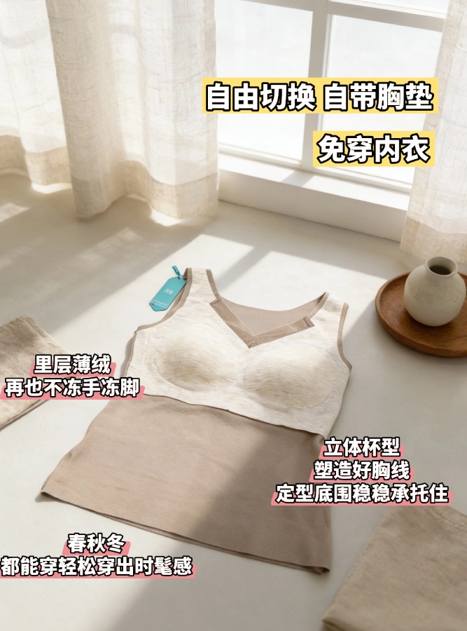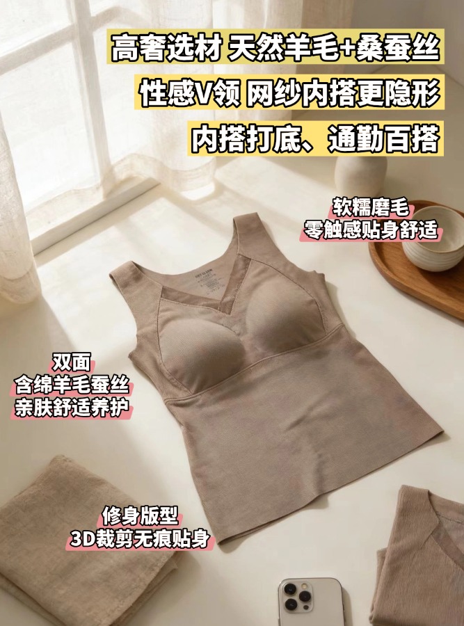C1-【2件装】【含绵羊毛桑蚕丝】润微带胸垫保暖背心女秋冬打底高弹力修身舒适百搭可外穿背心内衣 雾纱思语