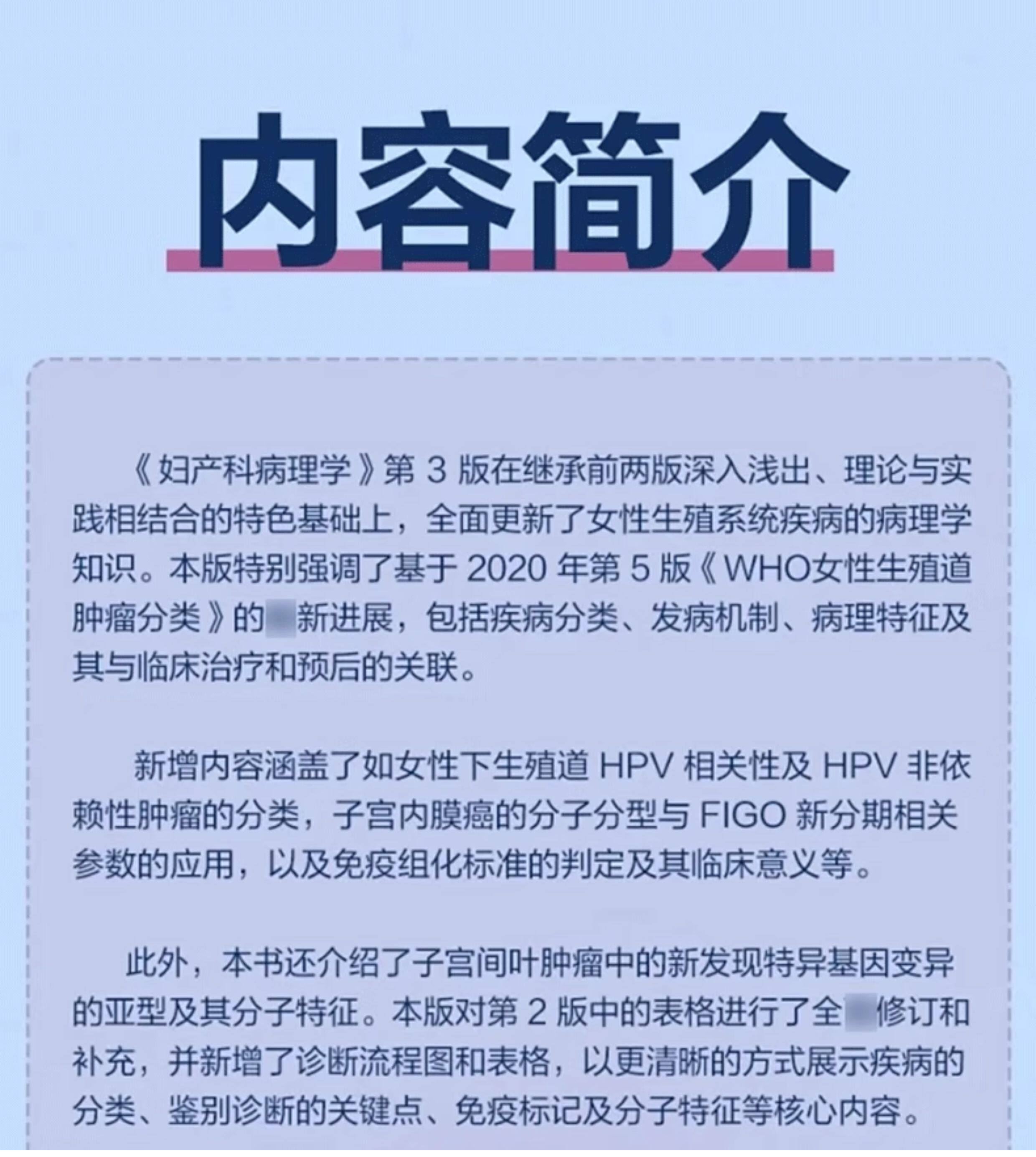 《妇产科病理学》第3版在继承前两版深入浅出、理论 与实践相结合的特色基础上,全*更新了女性生殖系统 疾病的病理学知识。本版特别强调了基于2020年第 5 版 《WHO女性生殖道肿瘤分类》的*新进展,包括 疾病分类、发病机制、病理特征及其与临床治疗和预后 的关联。新增内容涵盖了如女性下生殖道HPV 相关性 及 HPV 非依赖性肿瘤的分类,子宫内膜癌的分子分型 与 FIGO 新分期相关参数的应用,以及免疫组化标准的 判定及其临床意义等。此外,本书还介绍了子宫间叶肿 瘤中的新发现特异基因变异的亚型及其分子特征。本版 对第2版中的表格进行了全面修订和补充,并新增了诊 断流程图和表格,以更清晰的方式展示疾病的分类、鉴 别诊断的关键点、免疫标记及分子特征等核心内容。同 时,在保留原有的近3000 幅精美的妇产科疾病与肿瘤 大体标本及显微病理形态图的基础上,增加了650余幅 更新图。
