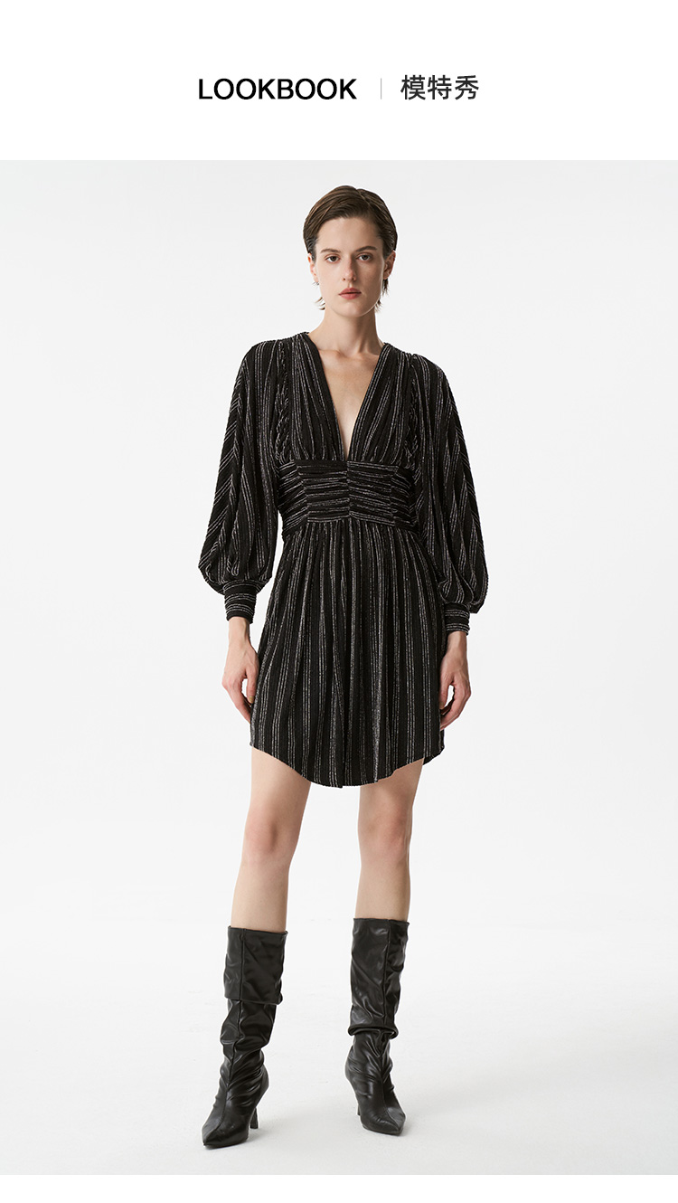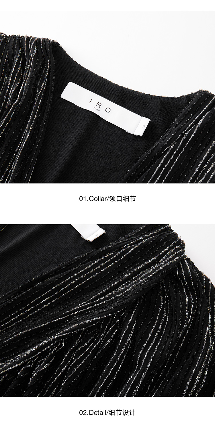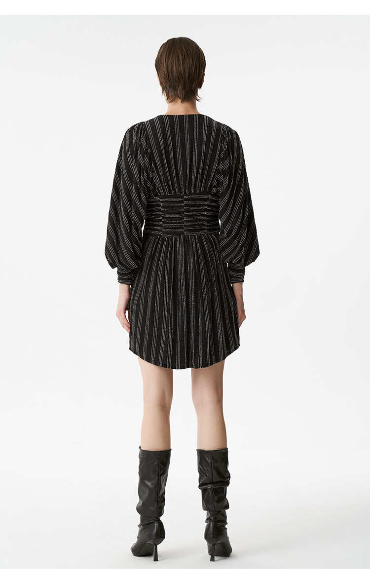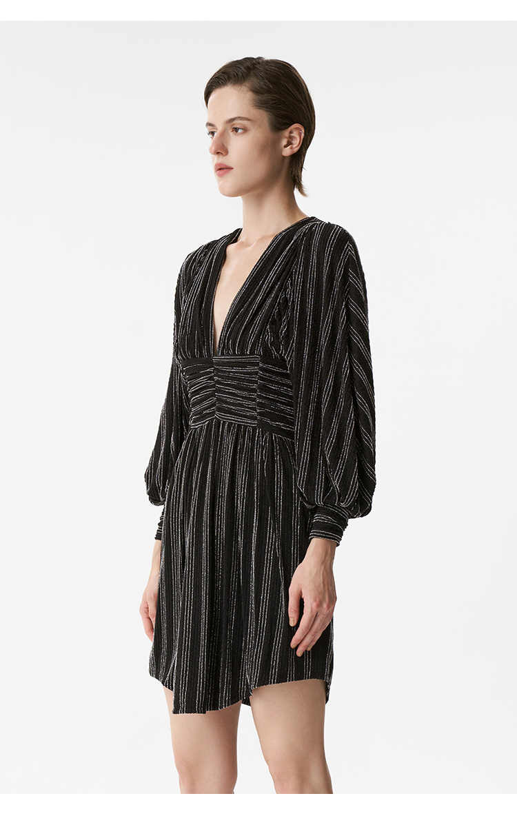 【2F】IRO春季新款法式轻奢女装气质裹腰银丝条纹短款灯笼袖连衣裙