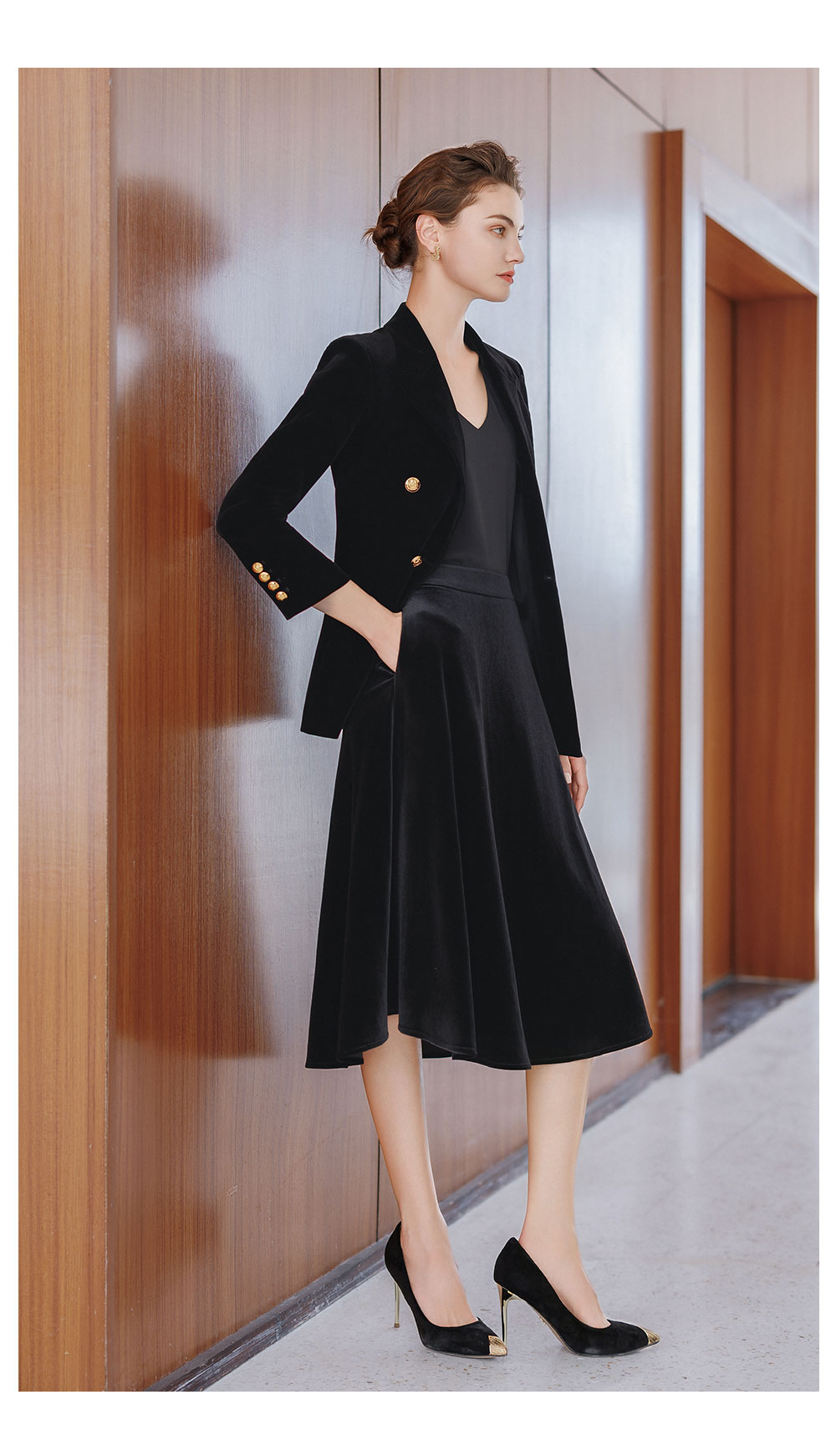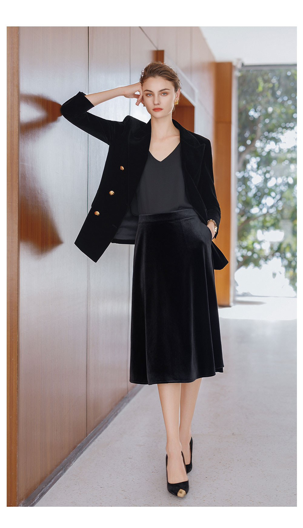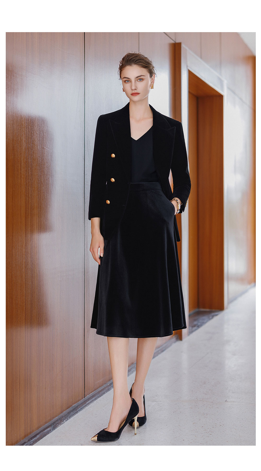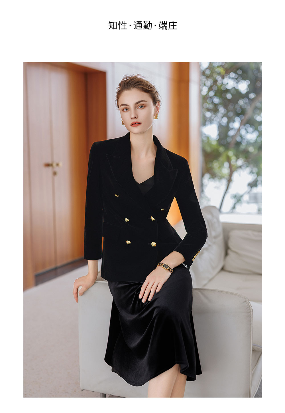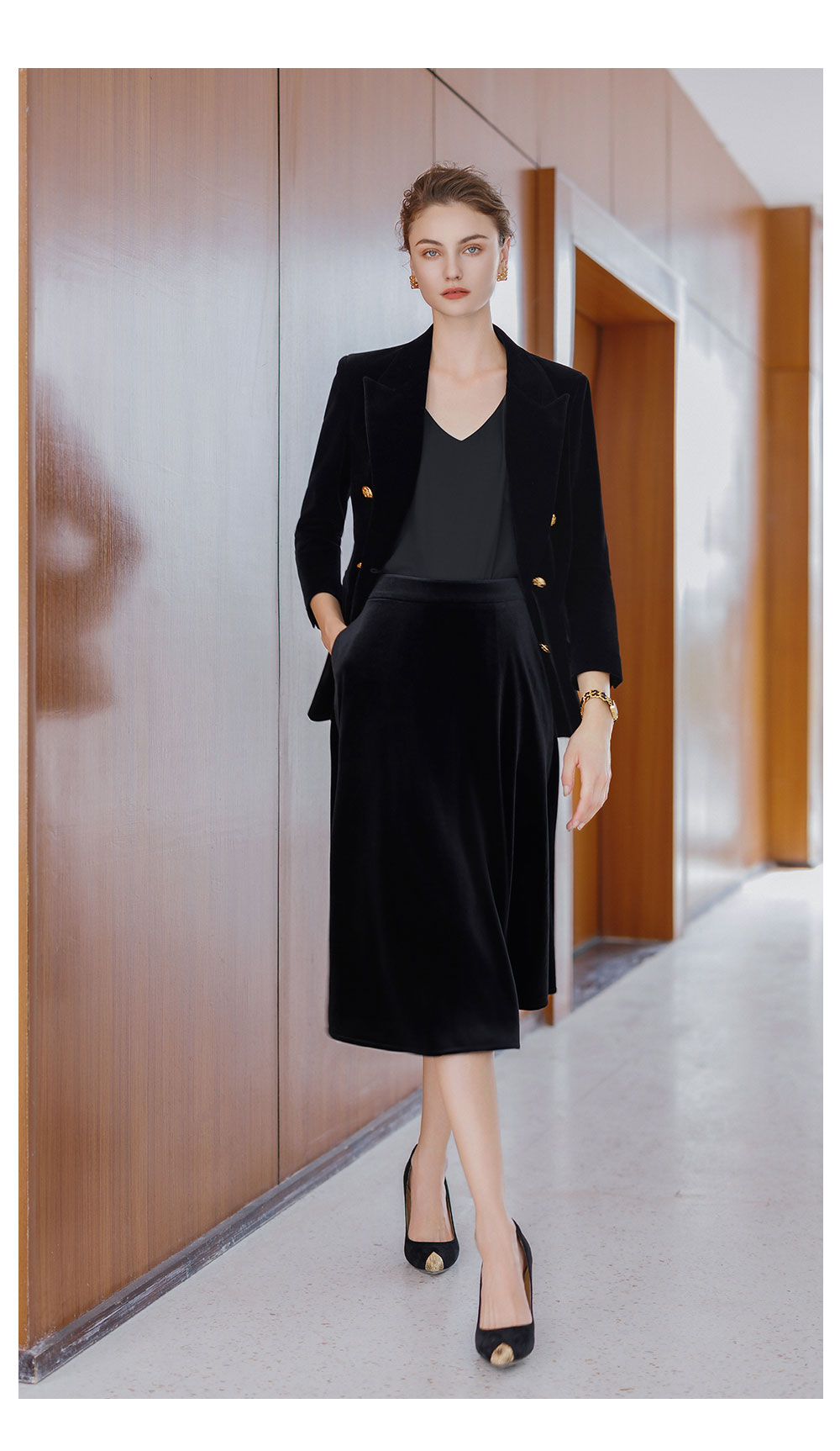 AD法式双排扣西装外套女2025新款秋冬高级感丝绒伞裙套装中长款