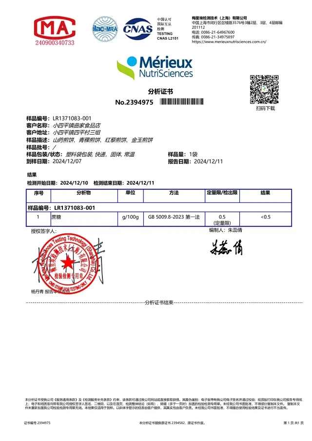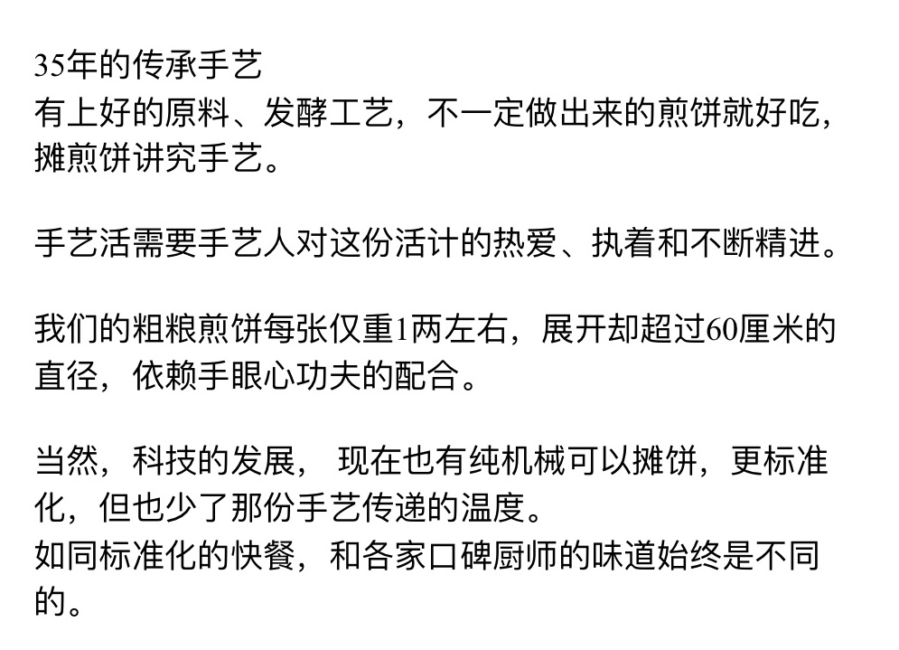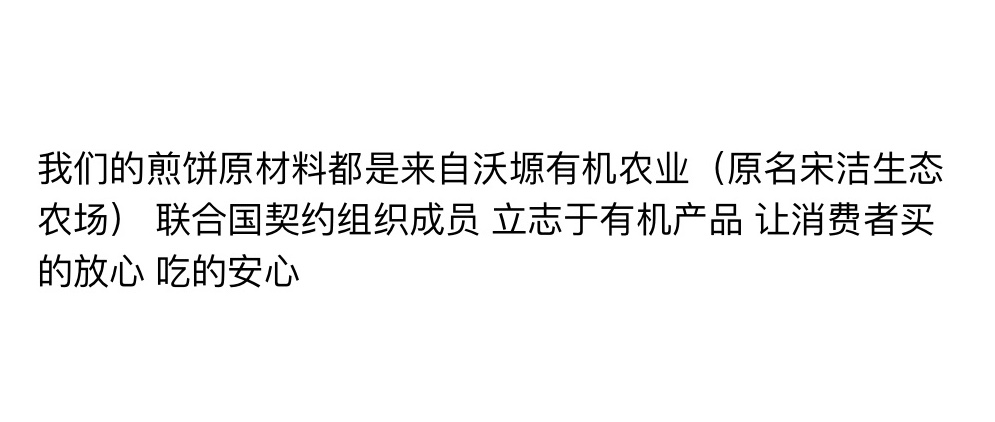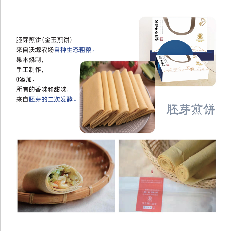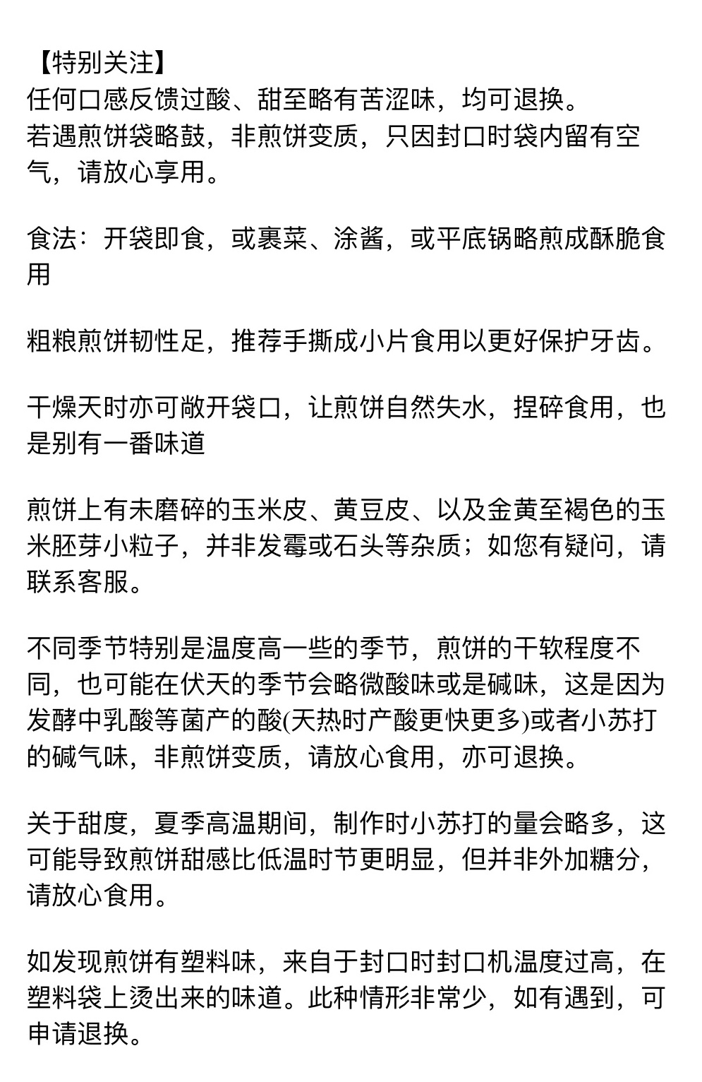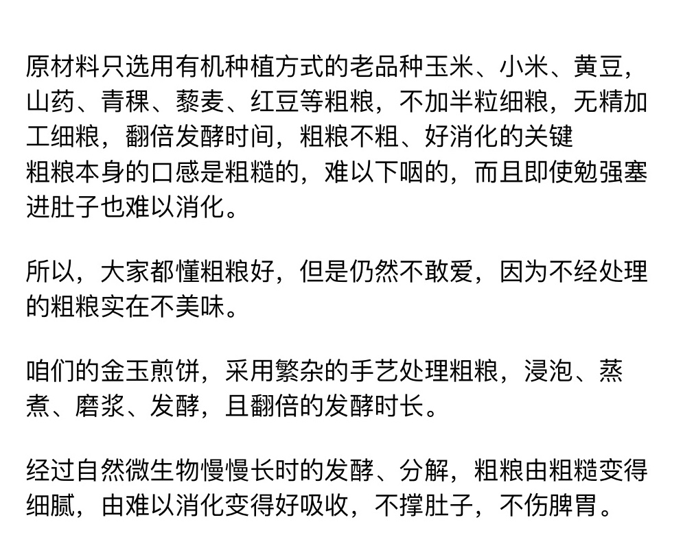 65%左右玉米,其余为非转基因黄豆、小米、小苏打0.25%左右(夏季高温天,小苏打用量会做调整,大约在0.4%左右),非转基因大豆油(用量非常少,摊煎饼时鏊子上隔一段时间会擦抹一次,以方便揭起煎饼)