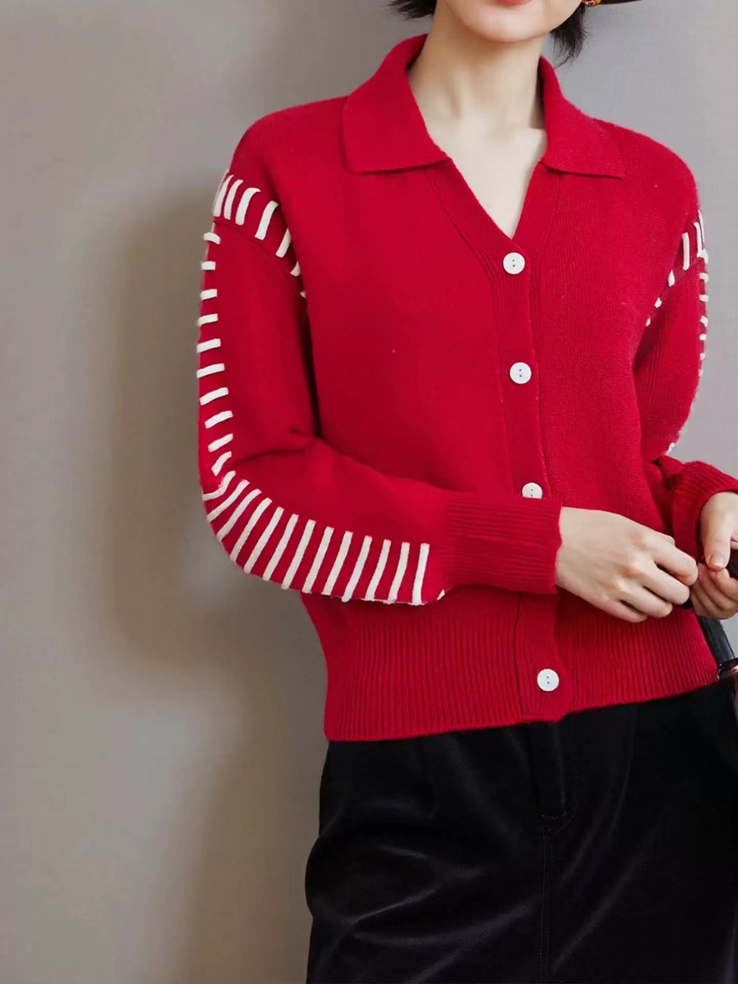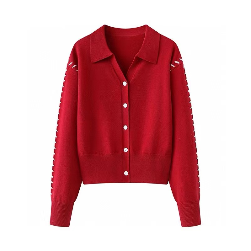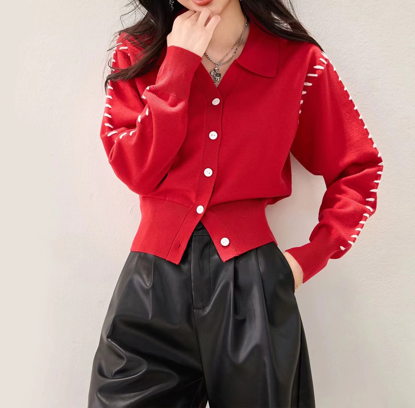 法式红色设计感翻领针织开衫女2025新款新年软糯毛衣上衣,这件酒红针织开衫,是把“复古甜酷”捏明白了!精典翻领+白色排扣,是美式复古那味儿~醉绝的是袖子的白色缝线设计,像给胳膊“打了个甜酷补丁”,红+白撞色又亮眼又不浮夸,短款版型刚好卡在腰线,显高显瘦一把子拿捏。单穿是甜飒小外套,内搭白T恤/高领衫都好看;扣上扣子当上衣,配牛仔裤是街头甜妹,搭半裙又秒变复古大小姐~软乎乎的针织贴肤不扎,秋冬当内搭也暖得刚刚好。节日穿它直接赢麻,日常穿又够特别,是衣柜里缺的那件“不撞款的红”!