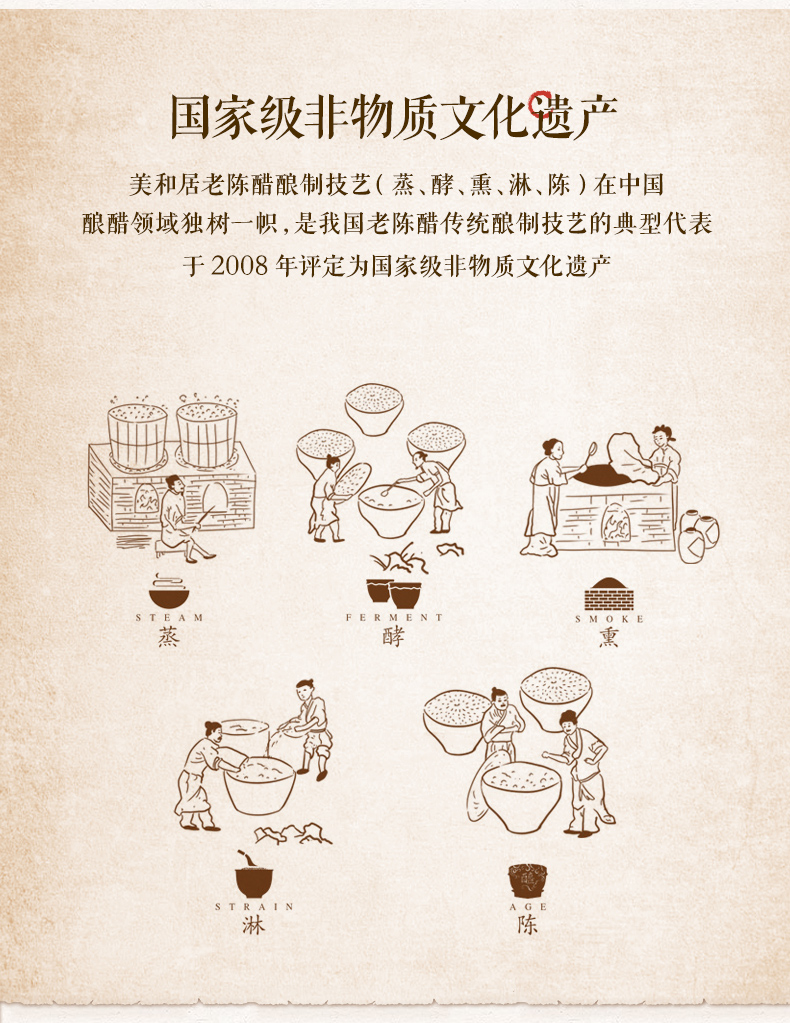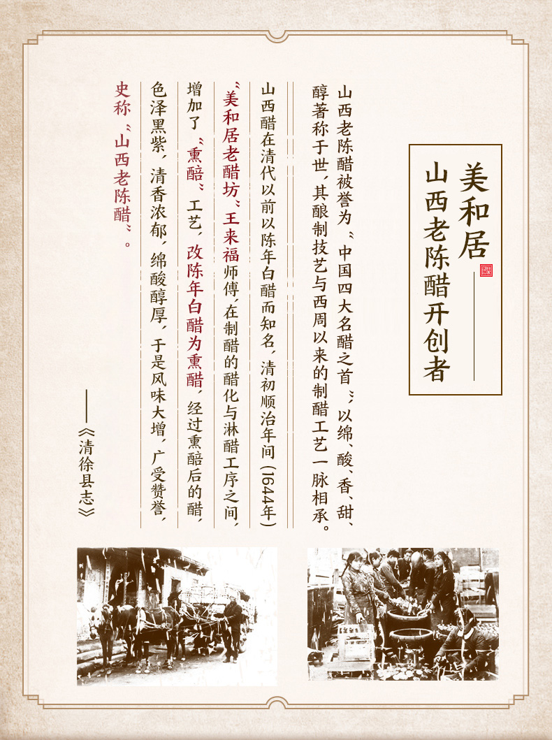 - 美和居始创于1368年,为山西老陈醋开创者,国家级非物质文化遗产酿制技艺,国家地理标志保护产品!