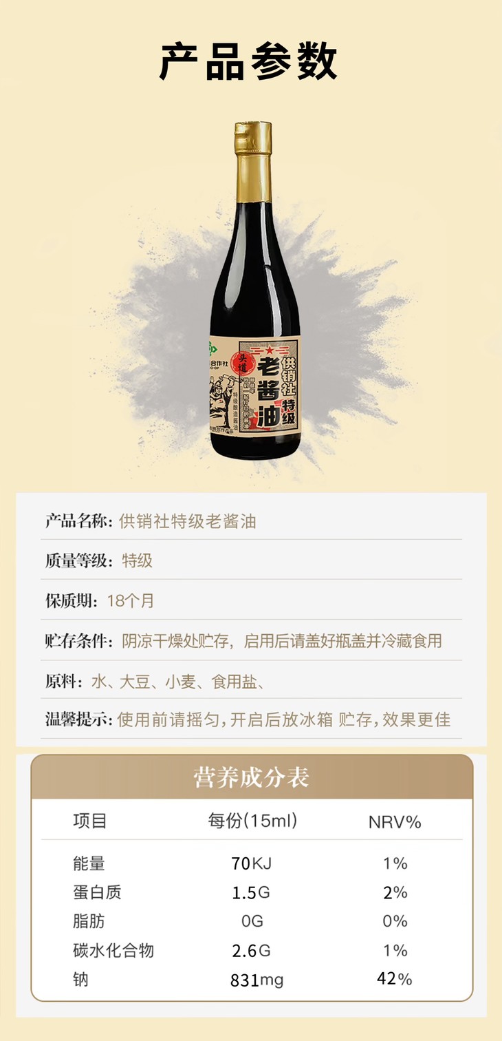 温馨小提示:收到后请置于阴凉干燥处保存,开封后建议0-4度冷藏保存,确保每一滴酱油都新鲜如初。发酵产品,若有少量沉淀属正常现象,请放心食用。