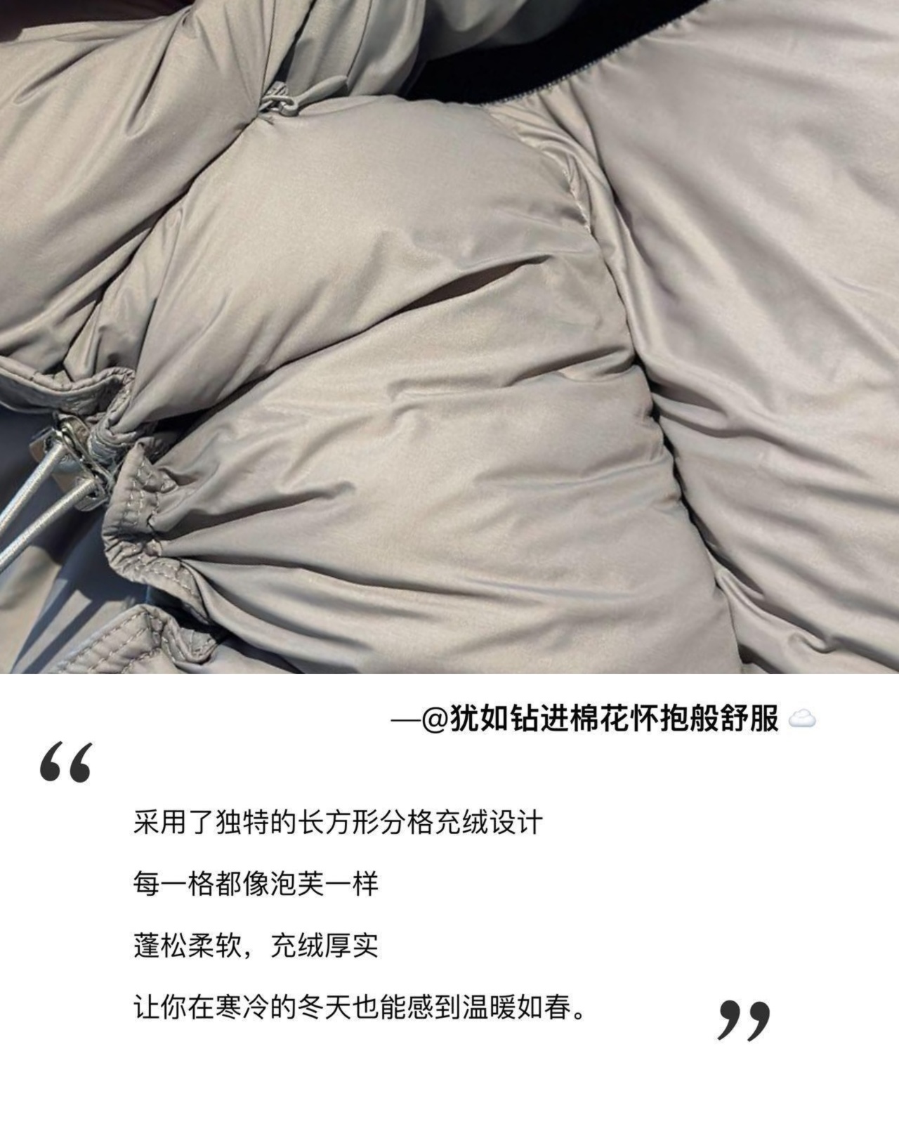 为解决钻绒痛点,工厂用了高密锁绒科技搭配防跑绒内胆,再辅以不沾绒缝制线与进口设备,针眼更细、走线更密,每一格都像饱满的泡芙般柔软挺括。既避免了绒朵卡在车线缝隙,又让保暖均匀持久,真正做到不跑绒、不钻绒、不结团。外层定制高密度面料,细腻顺滑且自带柔和光泽,抗皱保形又亲肤,触感绵柔,同时兼具防水防污特性,日常打理超省心!