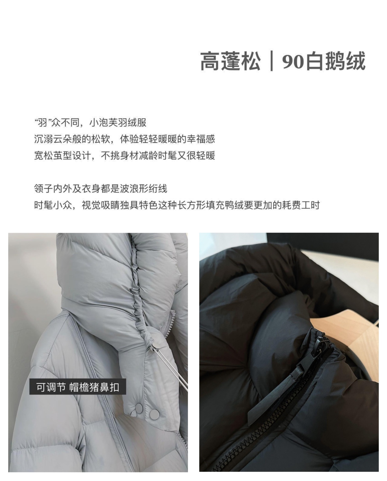 云朵泡芙羽绒服,内里填充90%高纯度白鸭绒,绝不是普通羽绒可比哦,是大厂精选全球32国认证的安心羽绒,绒朵硕大蓬松、洁净无异味,无梗触感软乎乎,蓬松度也肉眼可见的出色,轻轻一拍就会迅速蓬起。保暖力更是翻倍升级,是普通羽绒服的两倍以上,3倍锁温力让暖意360°包裹,即便北方寒冬也能从容应对!