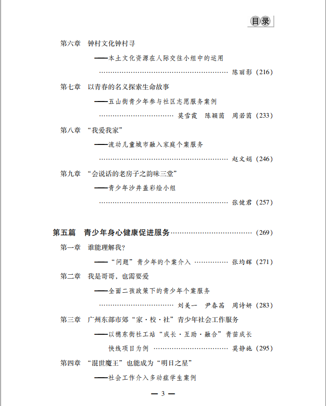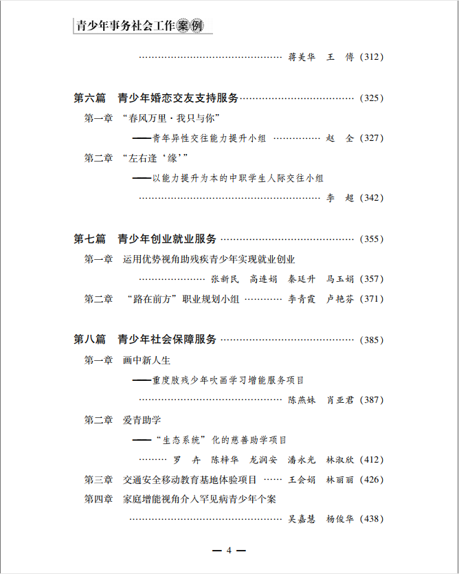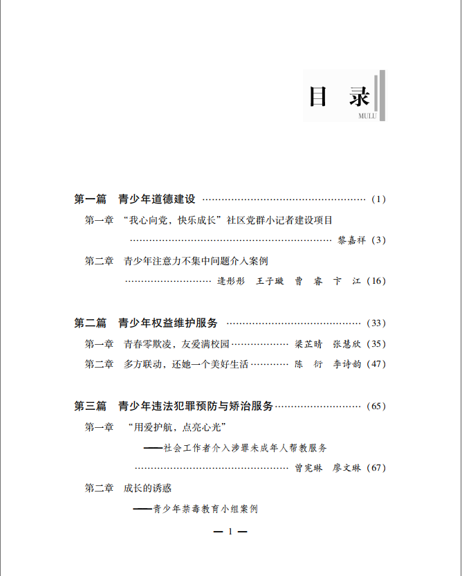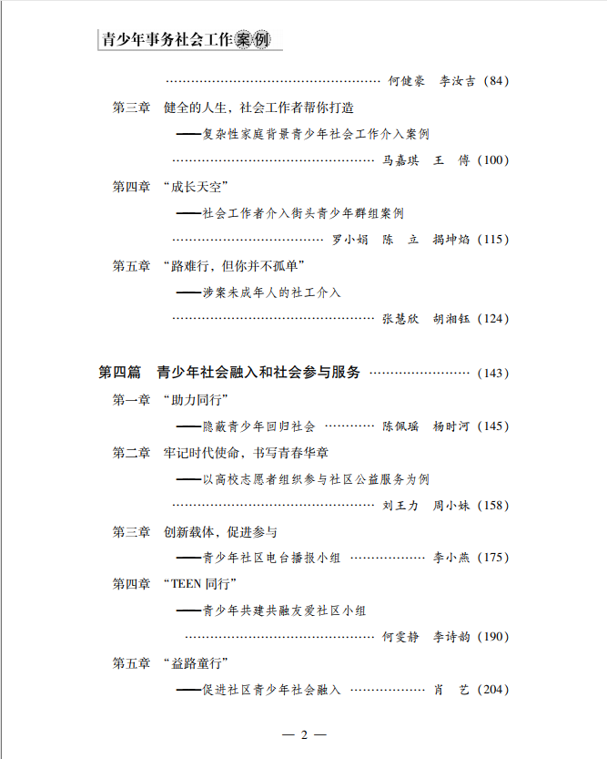 本书案例比较全面地反映了青少年事务社会工作的主要领域,体现了青少年事务社会工作实务经验的丰富性。本书案例所涉及的青少年事务社会工作领域有九个:青少年道德建设、青少年权益维护服务、青少年违法犯罪预防与矫治服务、青少年社会融入和社会参与服务、青少年身心健康促进服务、青少年婚恋交友支持服务、青少年创业就业服务、青少年社会保障服务、青少年事务社会工作项目管理。所有案例均具有一定的现实意义和可操作性,可代表青少年事务社会工作的一般操作程序,反映了青少年事务社会工作的特色,对同类服务具有积极的示范作用。