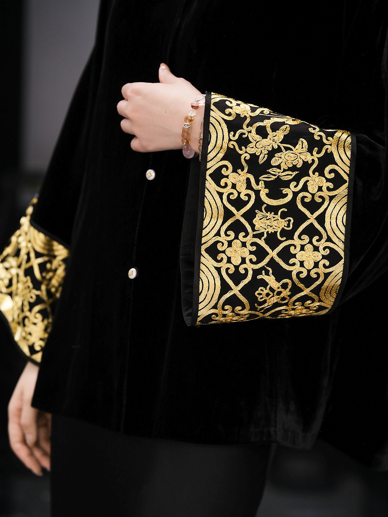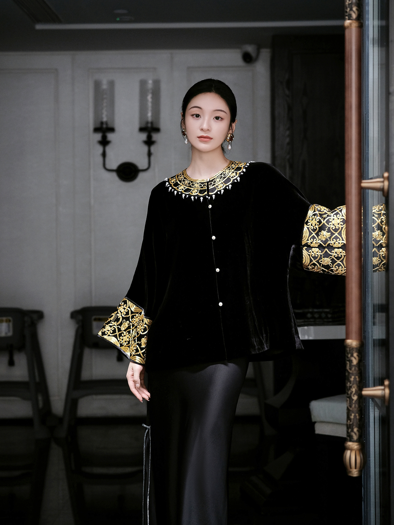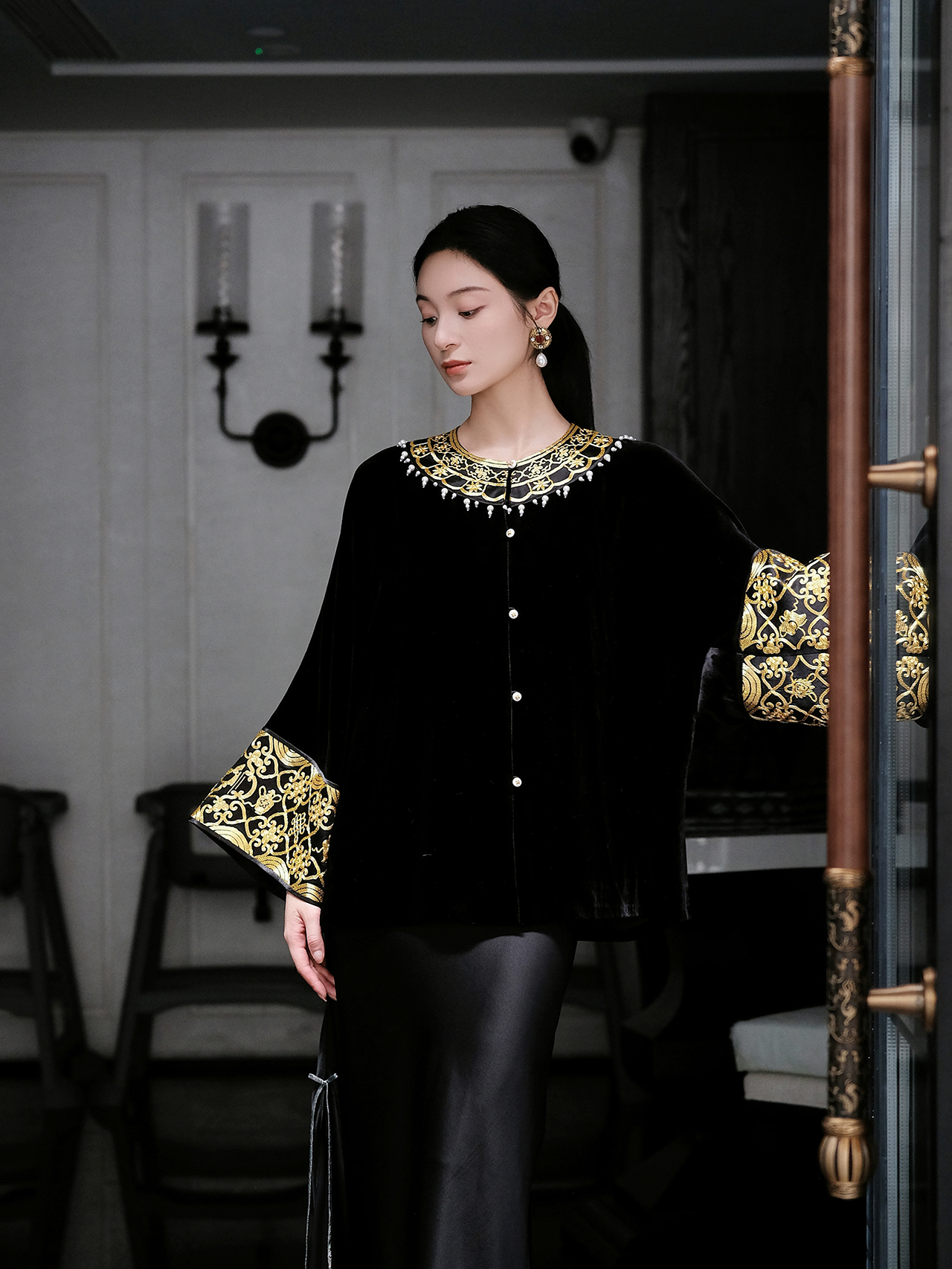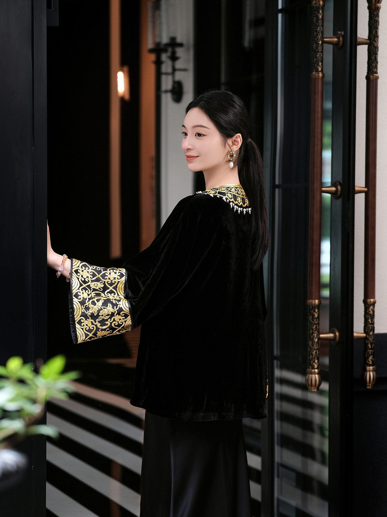 盛唐牡丹大师系列-卢梅红| 盘金绣真丝丝绒对襟外套