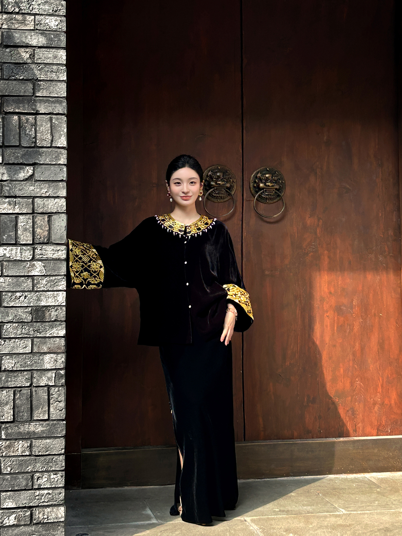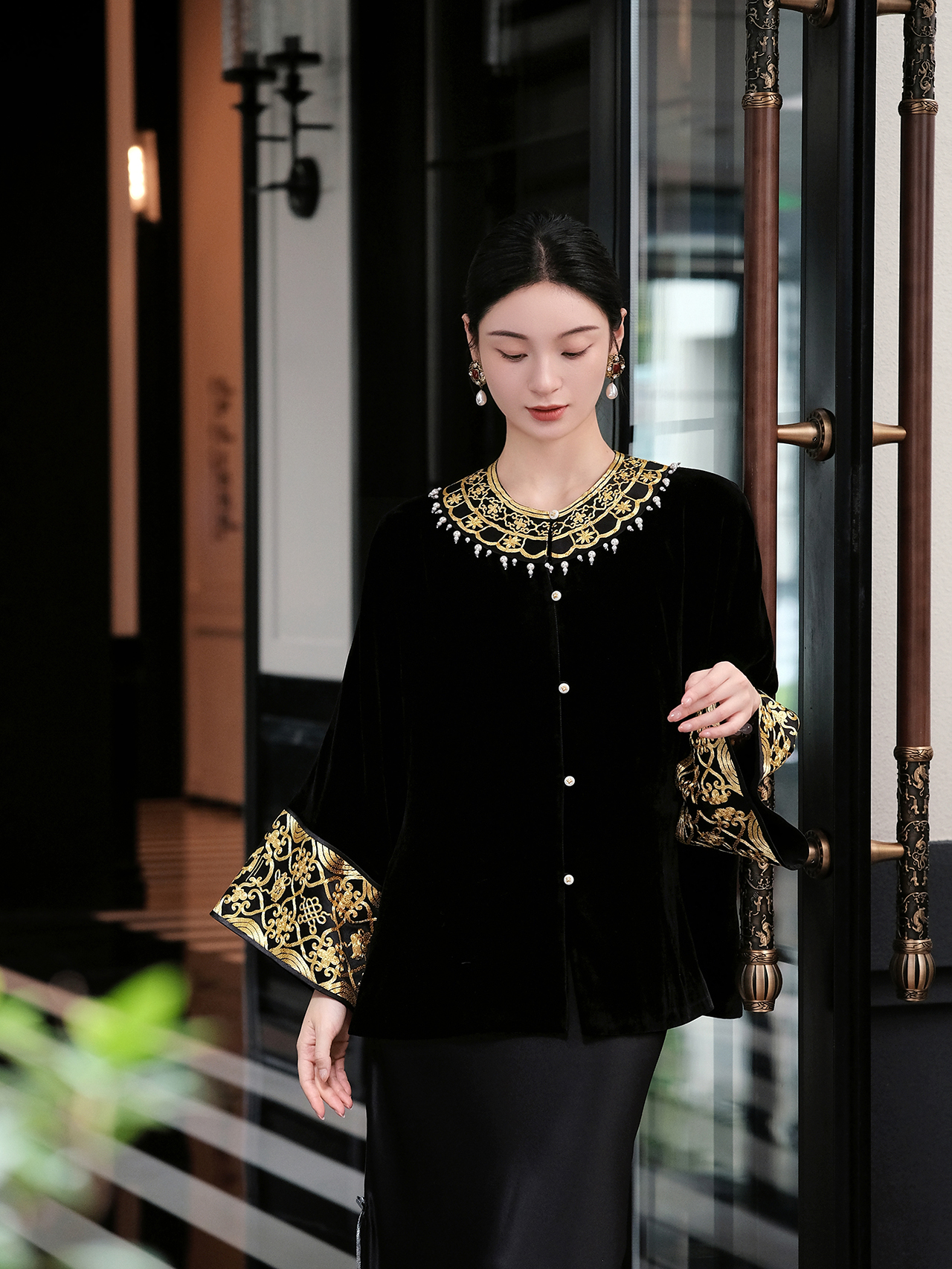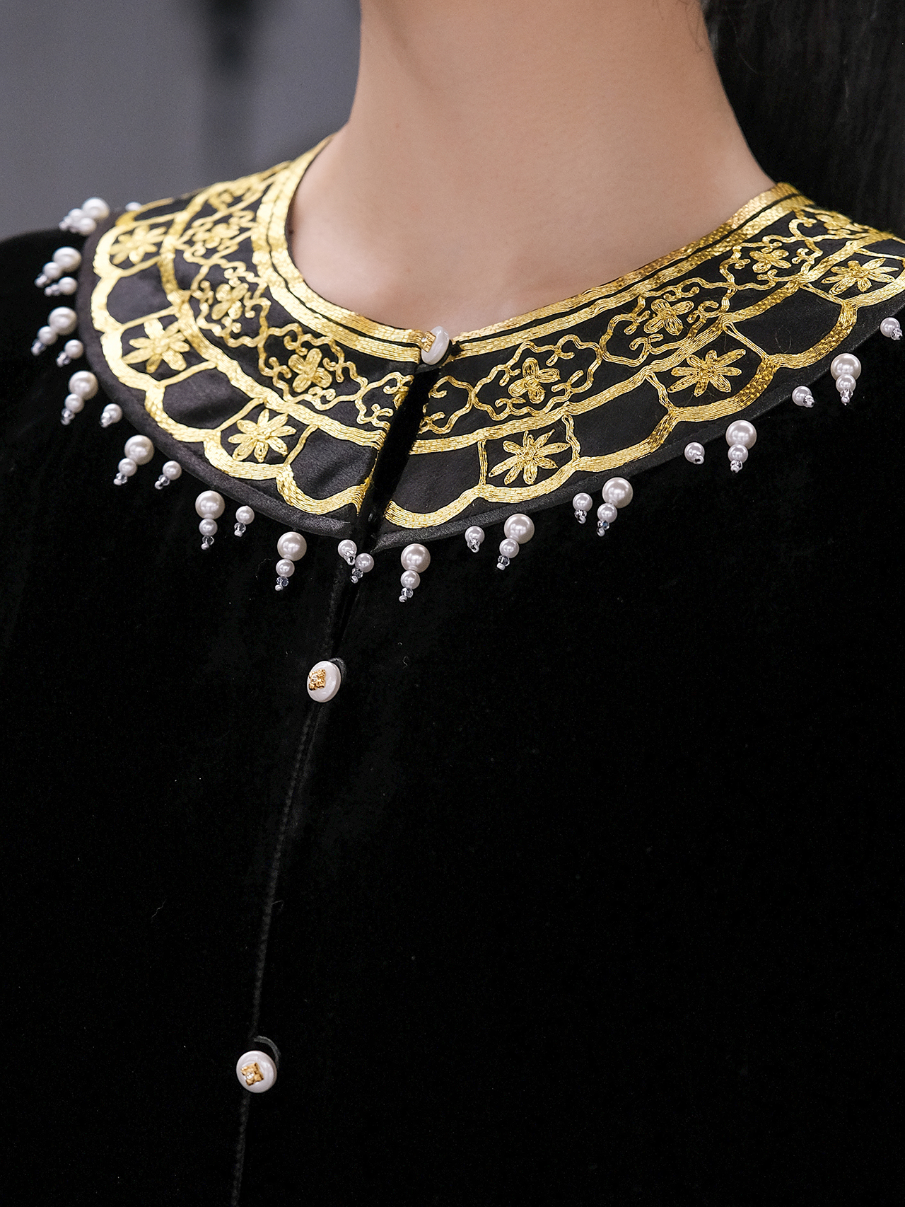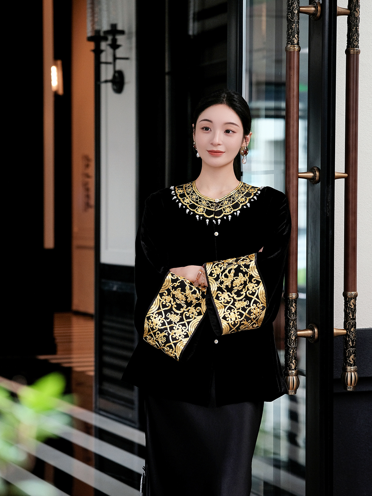 盛唐牡丹大师系列-卢梅红| 盘金绣真丝丝绒对襟外套