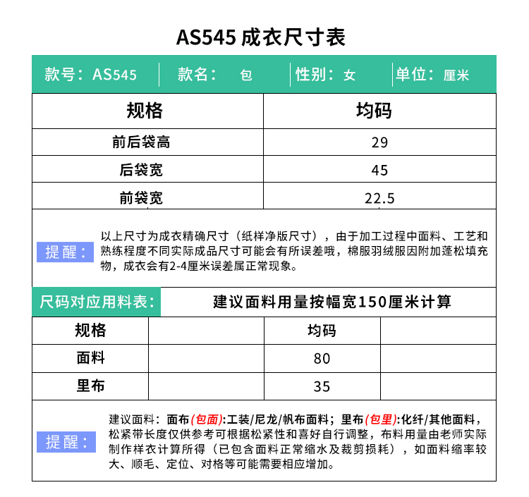 裁缝学苑AS545工装多口袋实用腰包纸样女装男款围裙包工具包样板