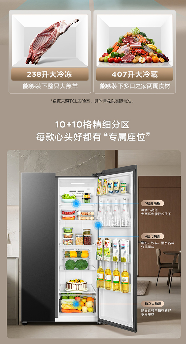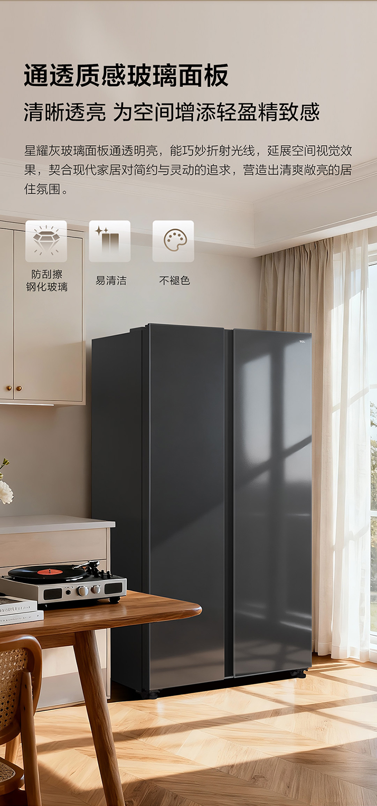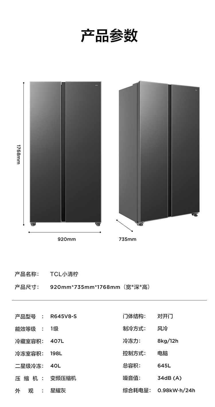 【新品上市】TCL 645升对开门双开门大容量大冷冻冰箱 玻璃门 双净味 双循环 R645V8-S