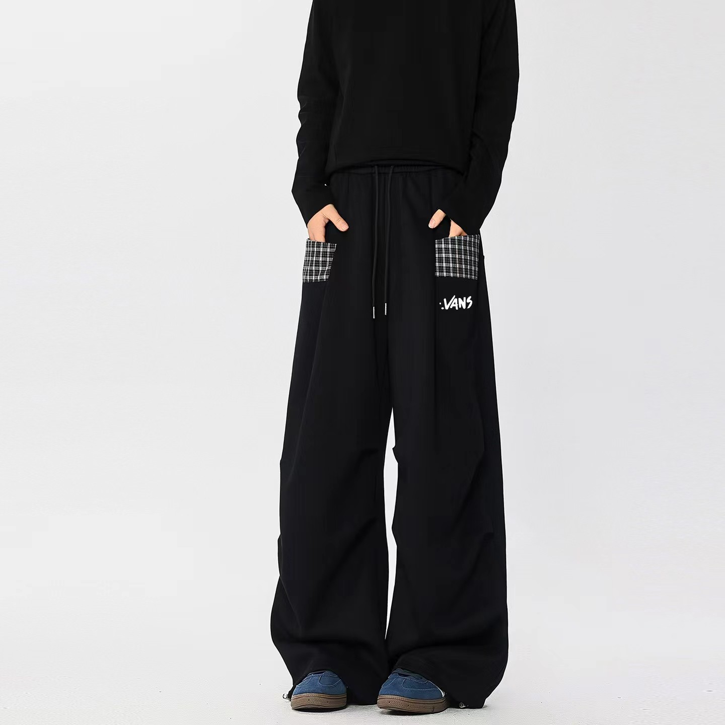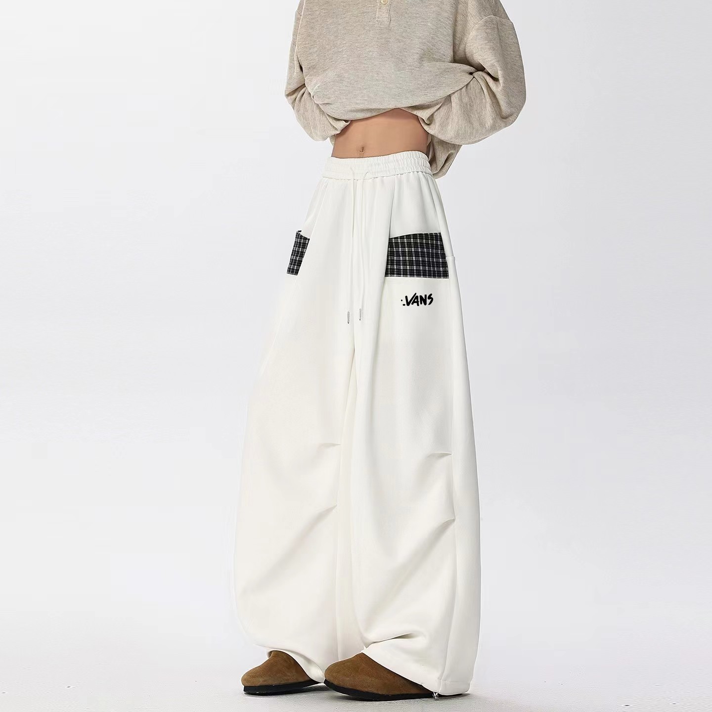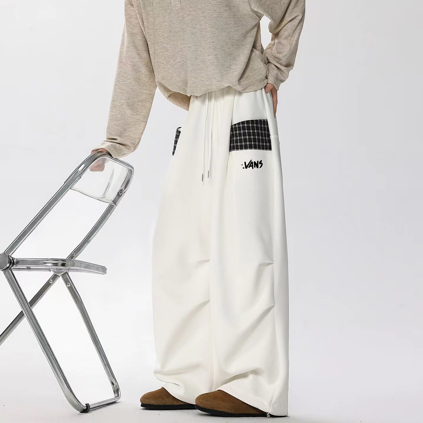 情侣休闲小众拼接格子直筒阔腿裤 ,格子休闲阔腿裤,啥上衣都可以搭主要穿着舒服 !面料非非非常贵的一个色,整体淡淡的灰蒙蒙的感觉,日落黄昏接近夜幕降临那种feel。面料表面做了磨毛工艺,非起球质量问题,柔软度垂感也恰好。