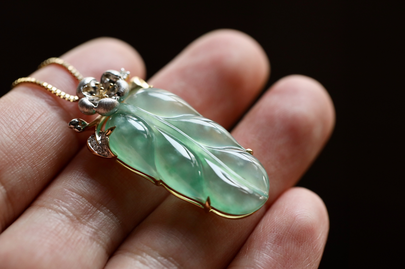 高冰种阳绿翡翠叶子设计师款18k白金黄金钻石镶嵌,30×18×4.8mm,镶嵌后38.4×18.1×7.9mm,高冰种阳绿雪花棉,丝绸般柔滑的质感,荧光四射,木那般甜美,厚实饱满的身材让人爱不释手呀,再加上翡翠禄来的原创设计,看那制作工艺的细节有多美,仅此一件,精品推荐