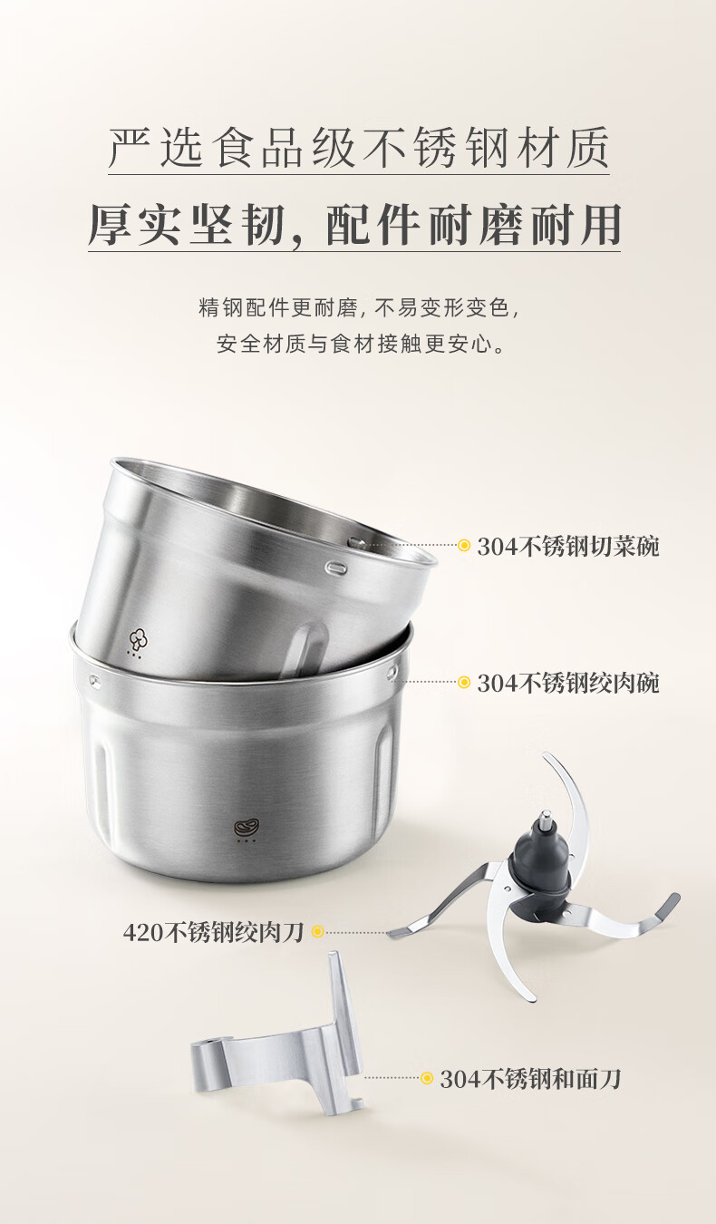 配件:304 不锈钢绞肉碗、切菜碗、和面刀,