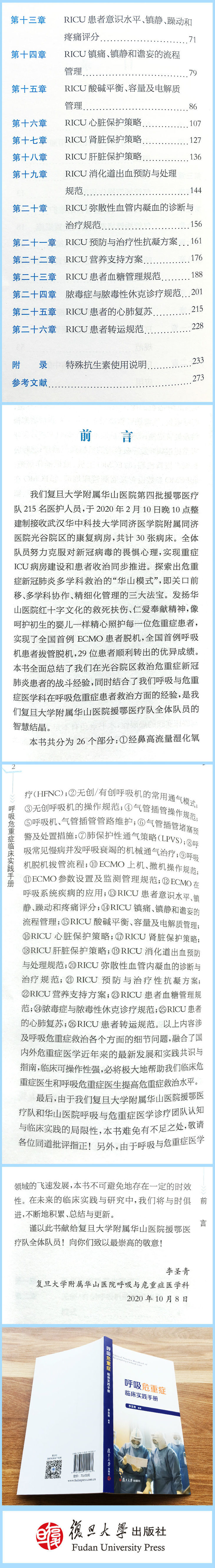本书总结了近2年来科室成功救治的疑难与危重病例,结合了我科在新冠救治期间的工作经验总结,写作本书,总计二十个章节。包括:气管插管管理、操作规范、预警处置、脱机流程, ECMO上机操作规范、参数及抗凝监测管理规范,RICU患者镇静镇痛、血糖、容量管理规范、营养支持方案、各脏器保护策略、经鼻高流量湿化氧疗、无创呼吸机的操作规范、呼吸机脱机拔管流程等,以期提高我国医师对于危重症的诊疗水平。本书内容丰富,写作严谨,专业性强。