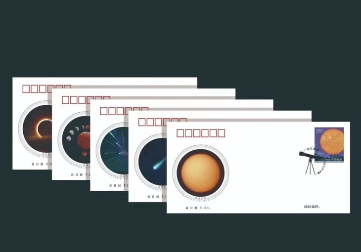 水星运行至地球和太阳之间,三者连成直线,太阳投射的光线被水星挡住。从地球观测,太阳上形成一个小黑点,即为“水星凌日”现象。邮票第五枚“水星凌日”以望远镜的视角观测水星黑影,再现水星掠过太阳的过程。
