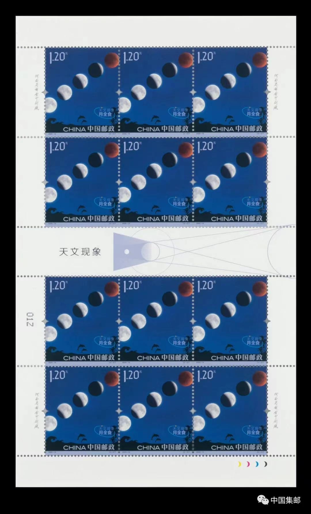 月全食邮票中,夜光墨的使用来表现满月到月全食过程中不同亮度的月光效果。