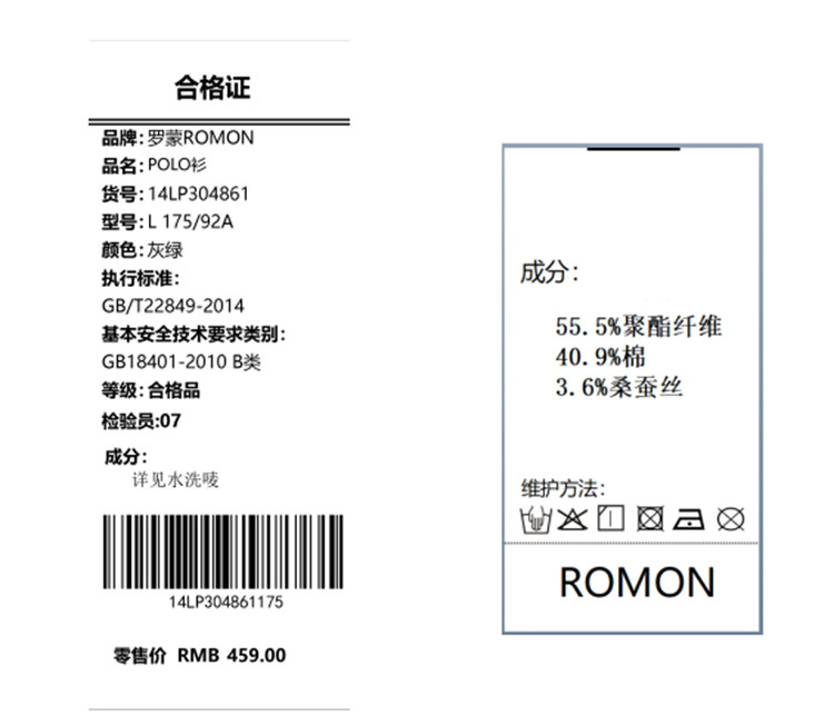 面料:55.5%聚酯纤维 40.9%棉 3.6%桑蚕丝