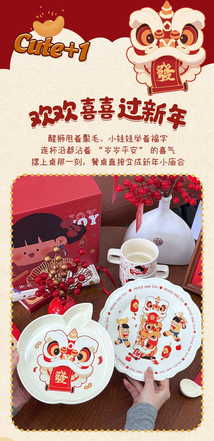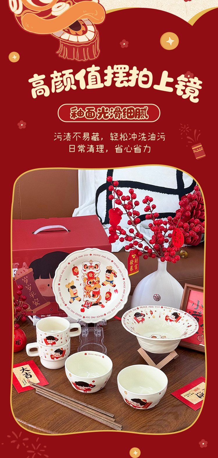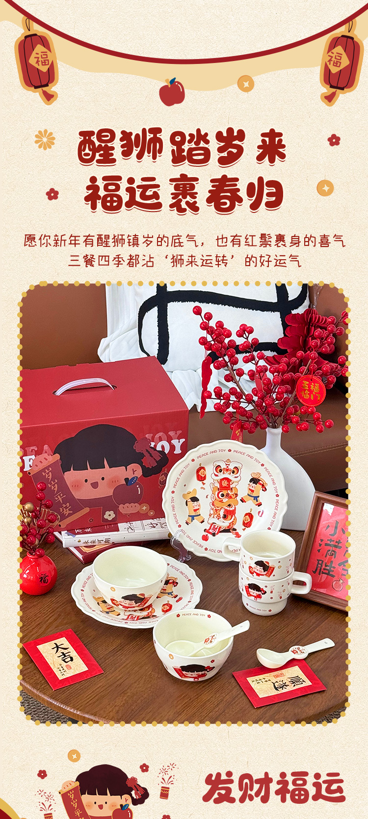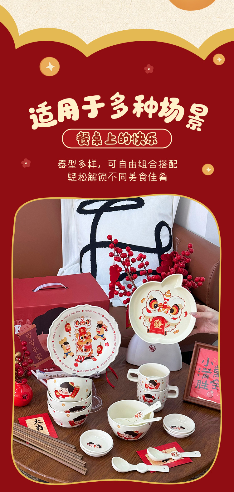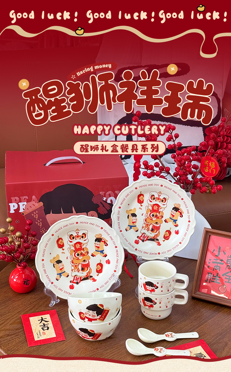 【醒狮礼盒餐具】喜庆醒狮餐具碗盘勺家庭套装送礼好看碗碟家用