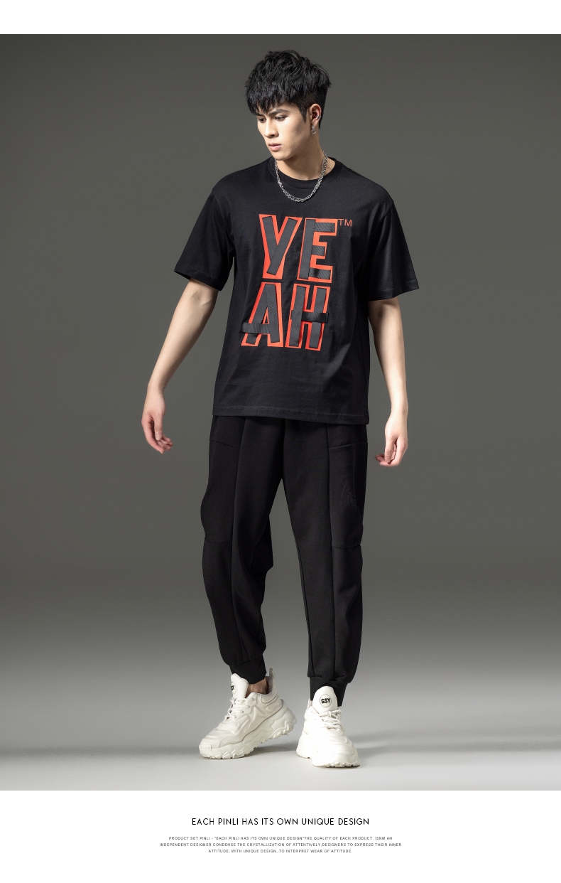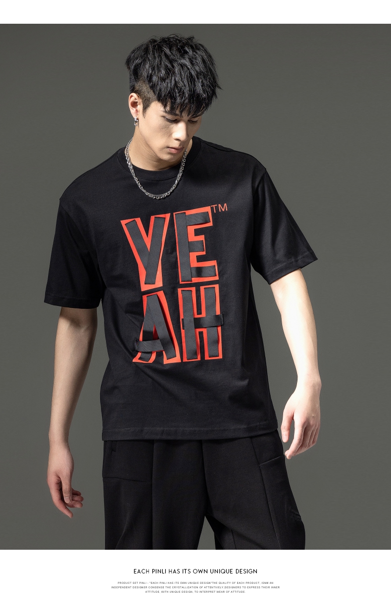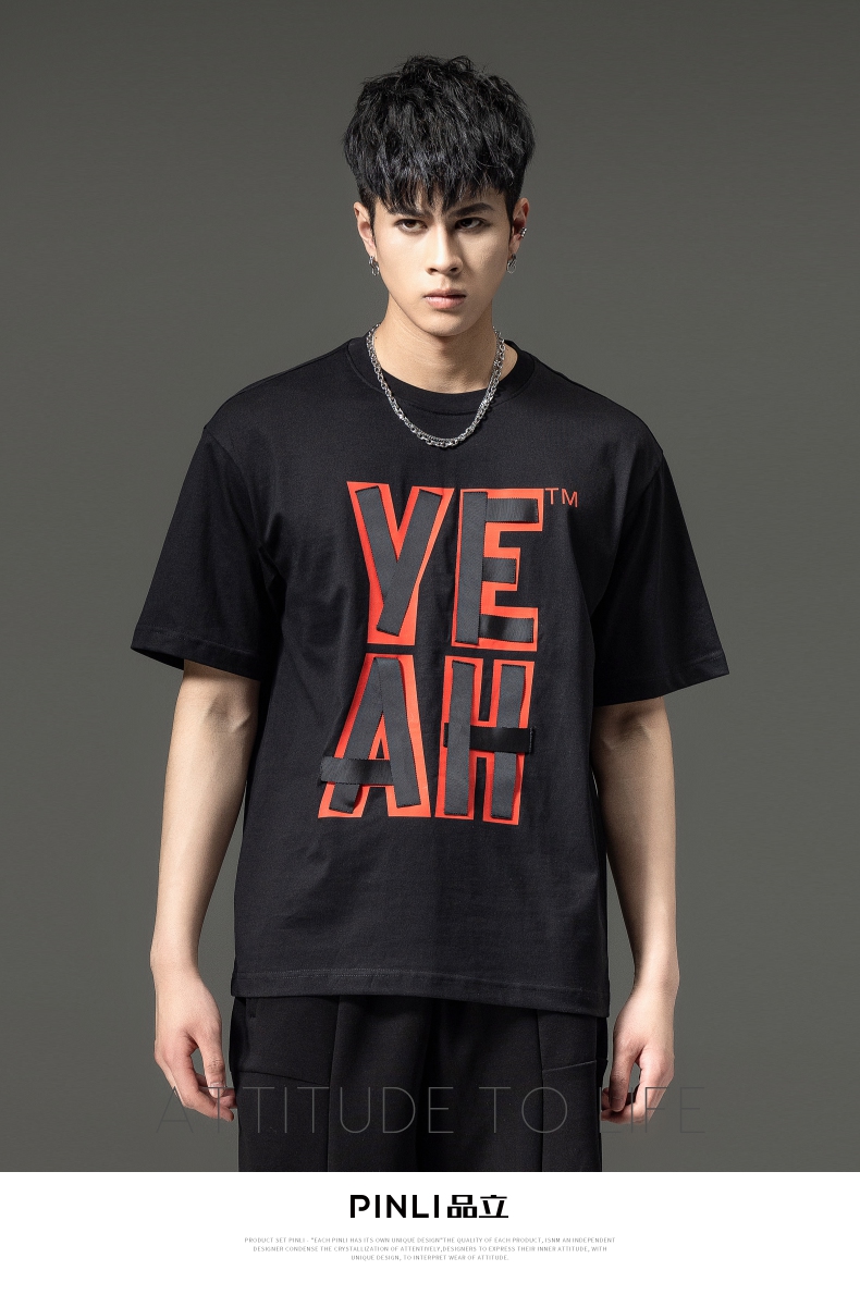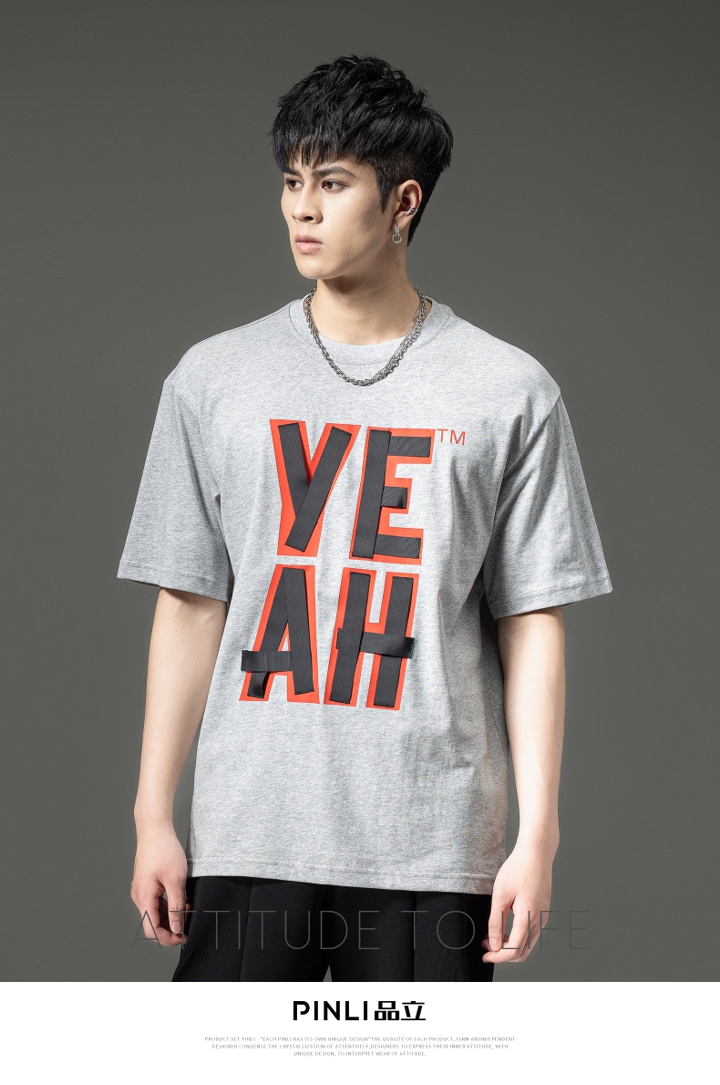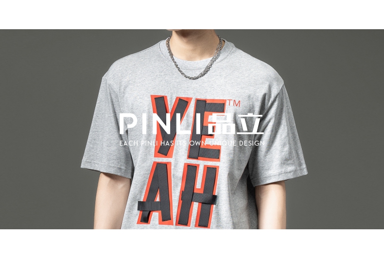 PINLI品立夏季新款男士印花拼接织带圆领短袖T恤BG231111063