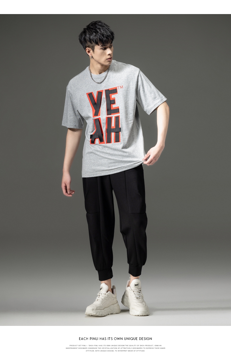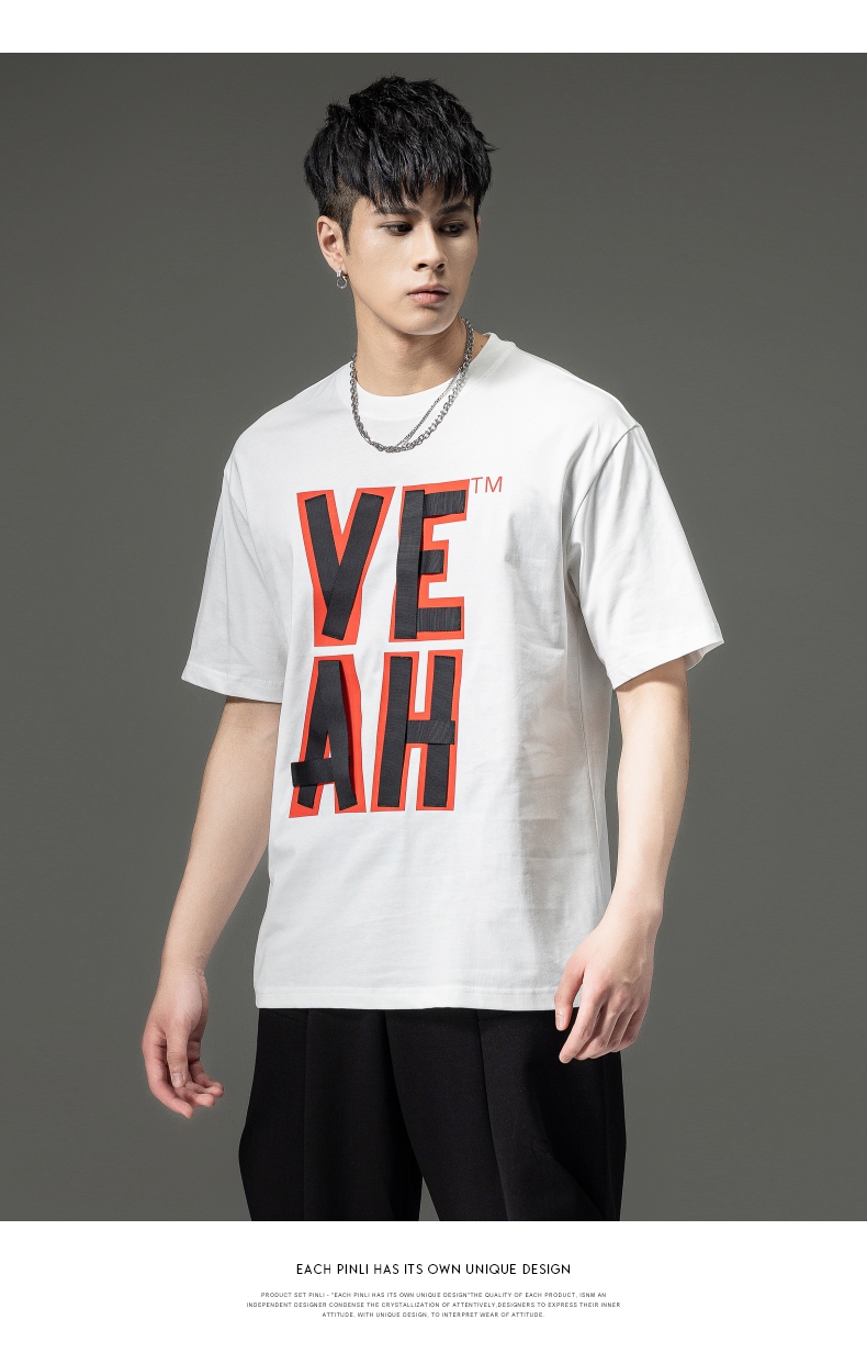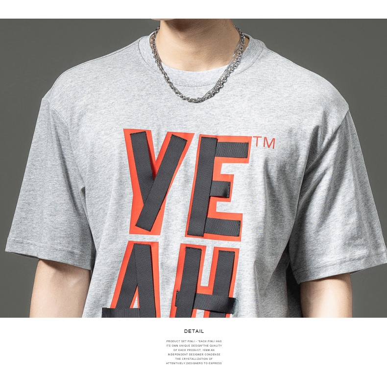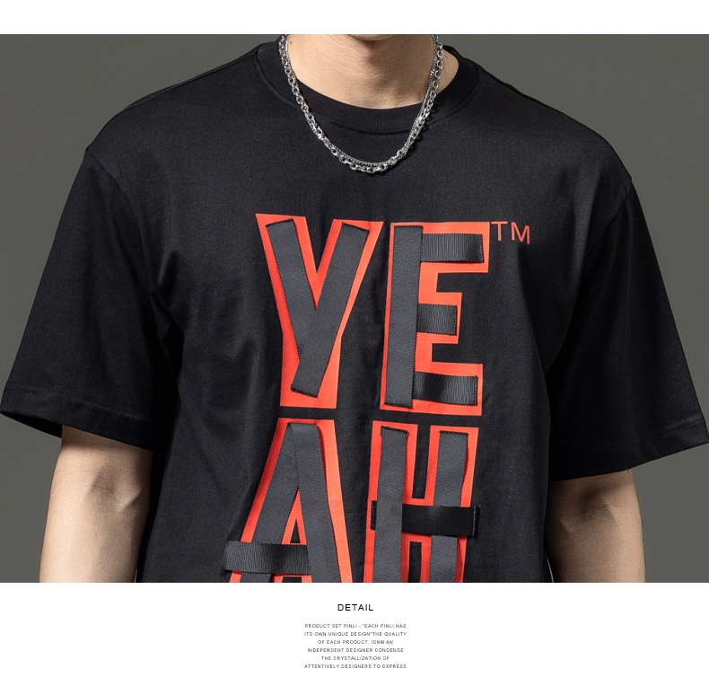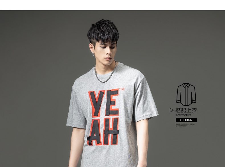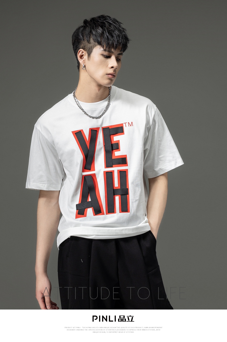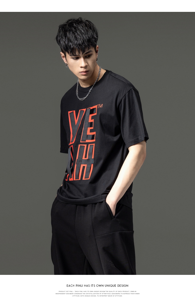 PINLI品立夏季新款男士印花拼接织带圆领短袖T恤BG231111063