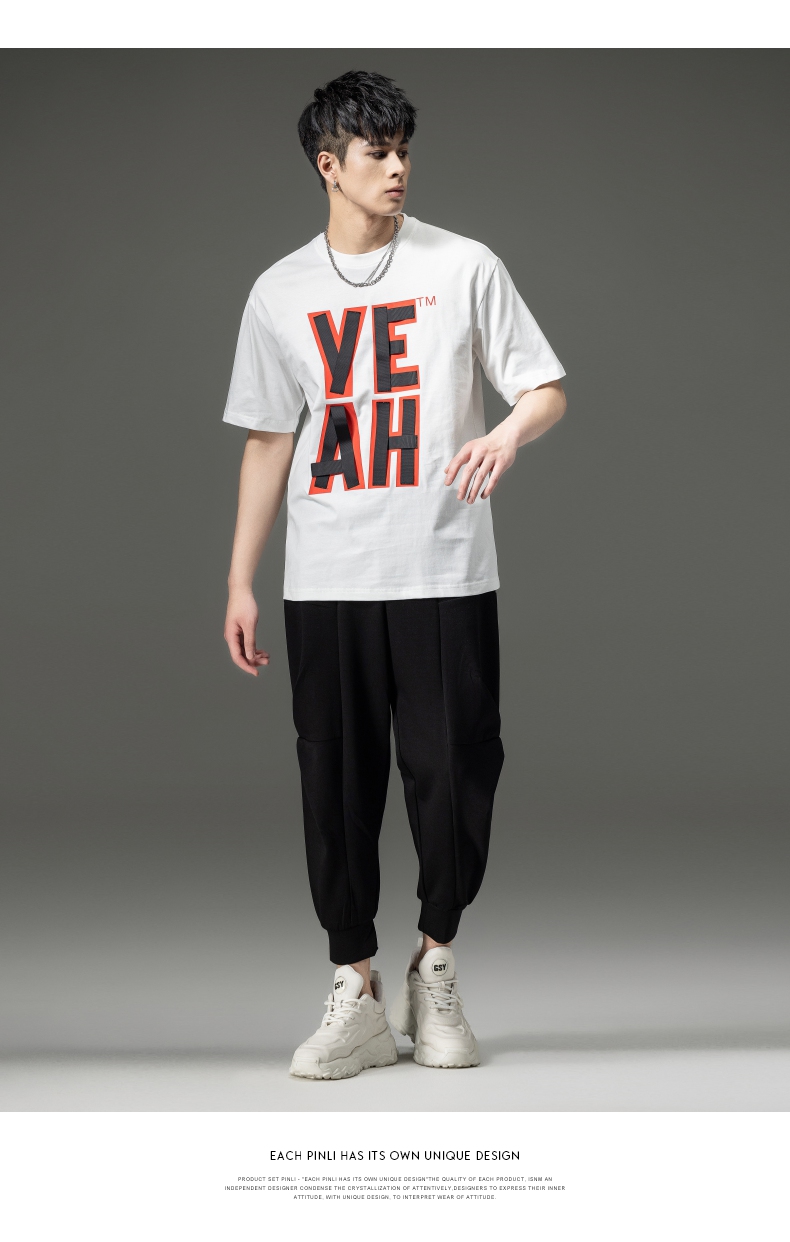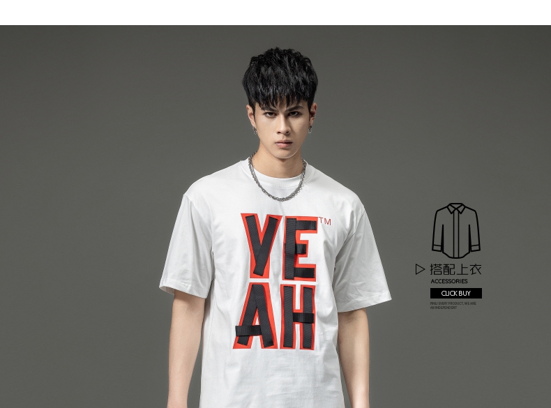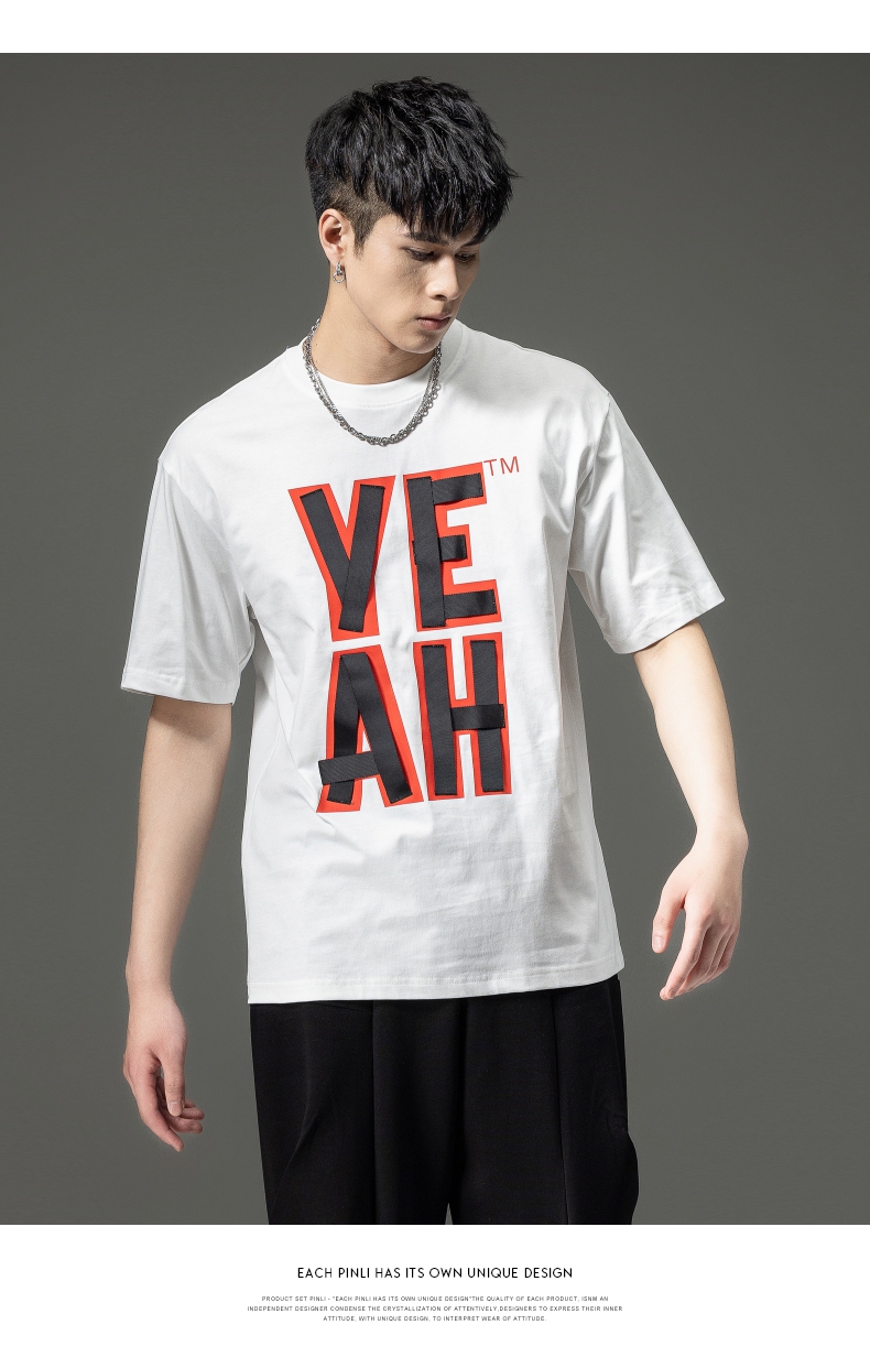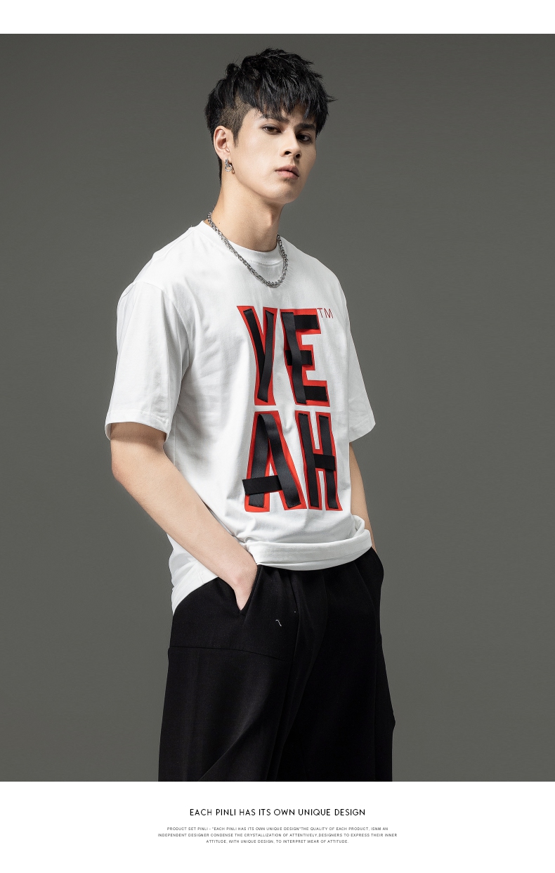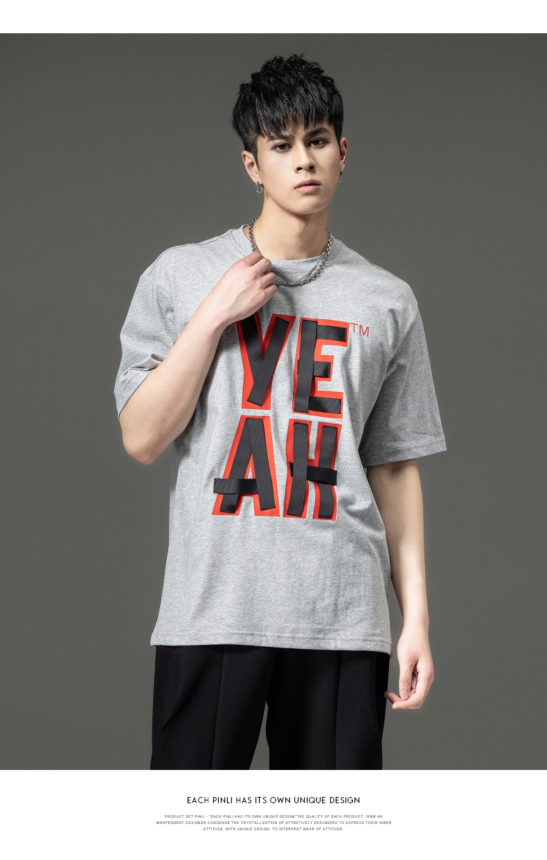 PINLI品立夏季新款男士印花拼接织带圆领短袖T恤BG231111063