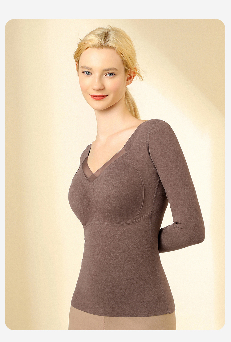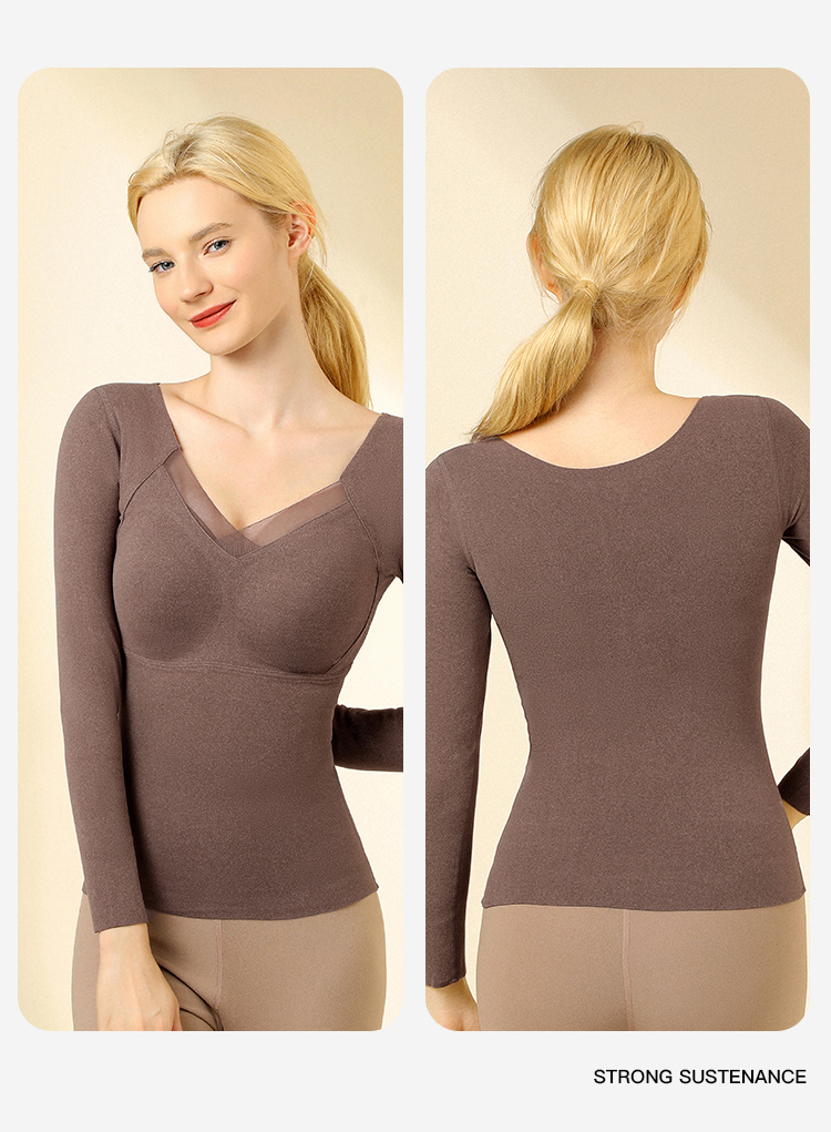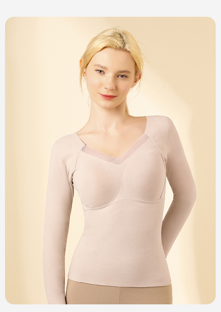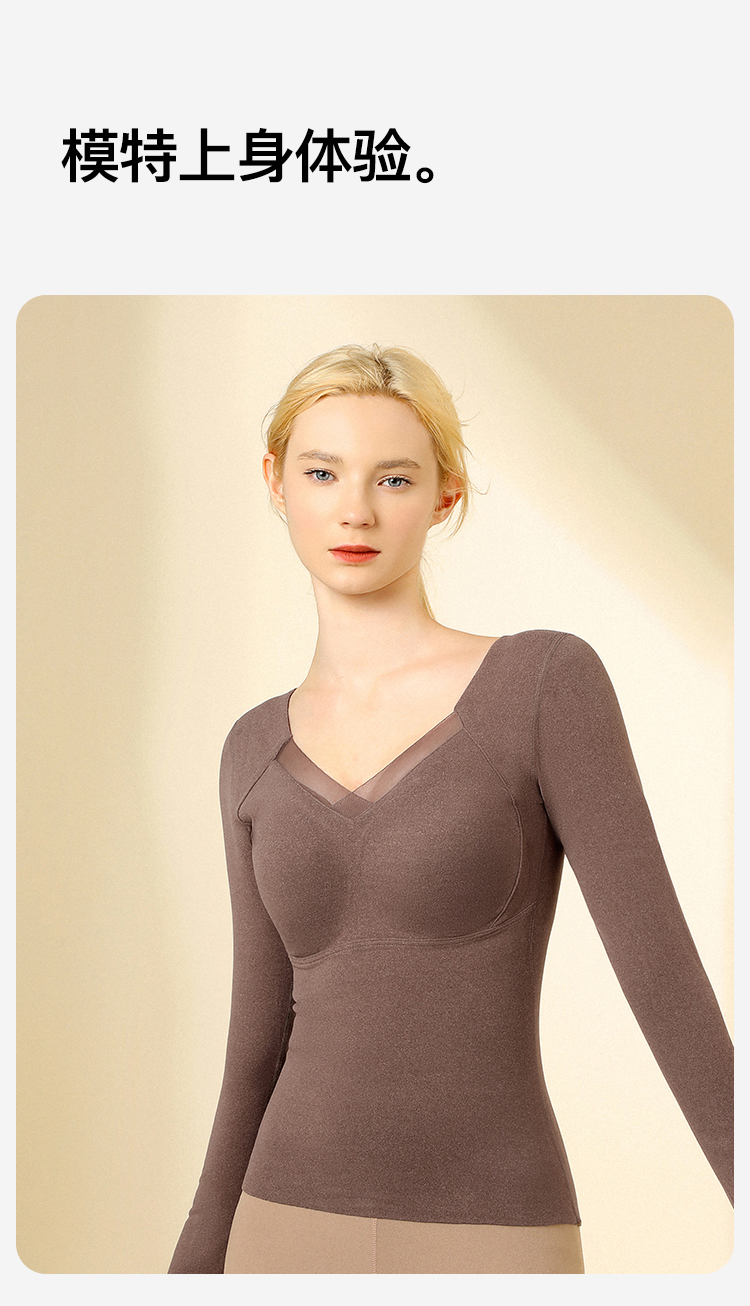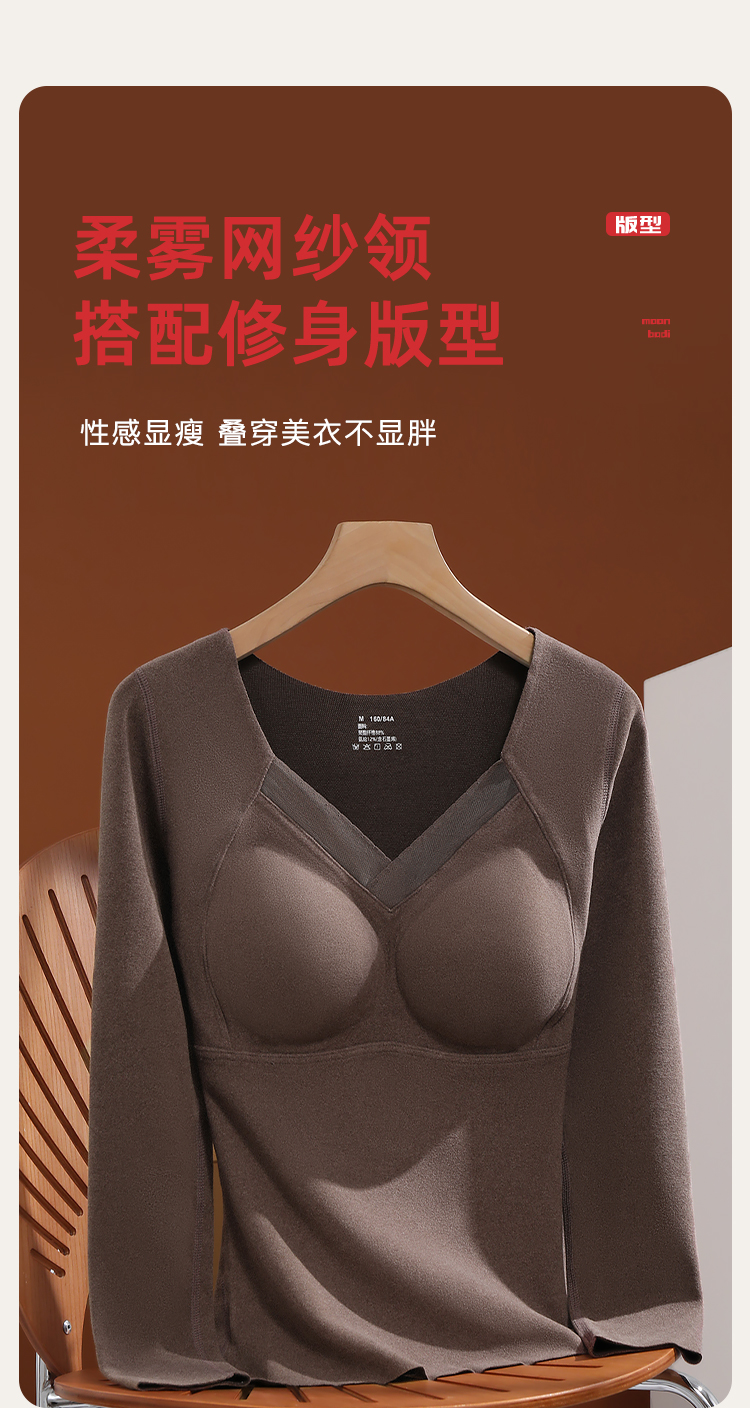 【免穿文胸】带胸垫秋冬女式保暖上衣隐形秋衣打底上衣高弹亲肤交叉网纱保暖上衣