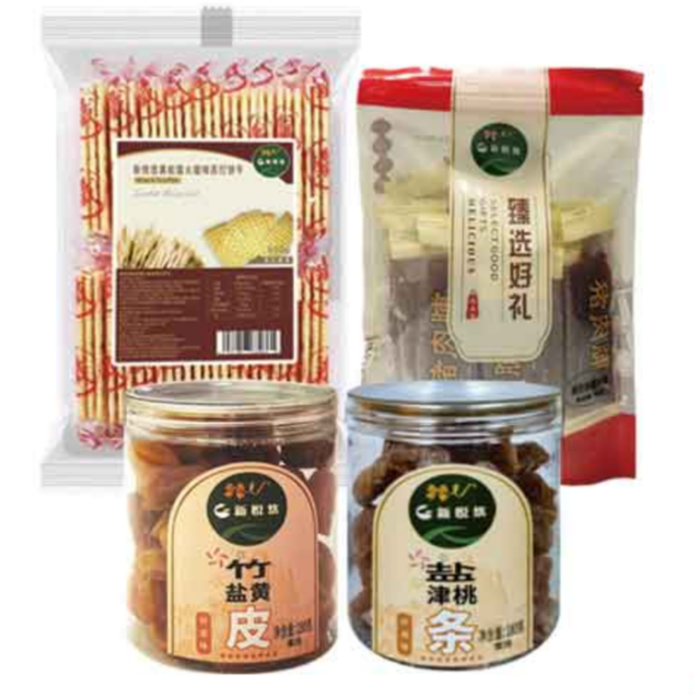 【组合】新悦悠零食系列(黑松露味饼干500g+竹盐黄皮+盐津桃条+蜜汁猪肉脯90g)