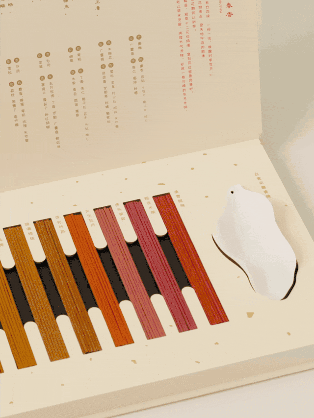 从右至左地还原古人的阅读方式,12味线香依次排开,给人一种古朴、文艺的感觉。