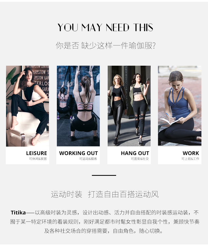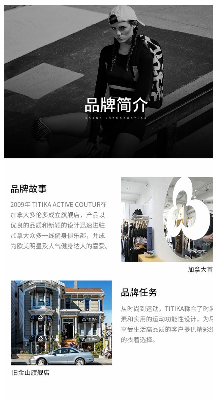 - 2009年,Titika Active Couture诞生于北美时尚之都,重新定义运动服饰,让运动时尚,前卫、性感,更宣扬一种无畏自由的生活态度。TITIKA缇缇卡不断求变,为品牌添加多种元素