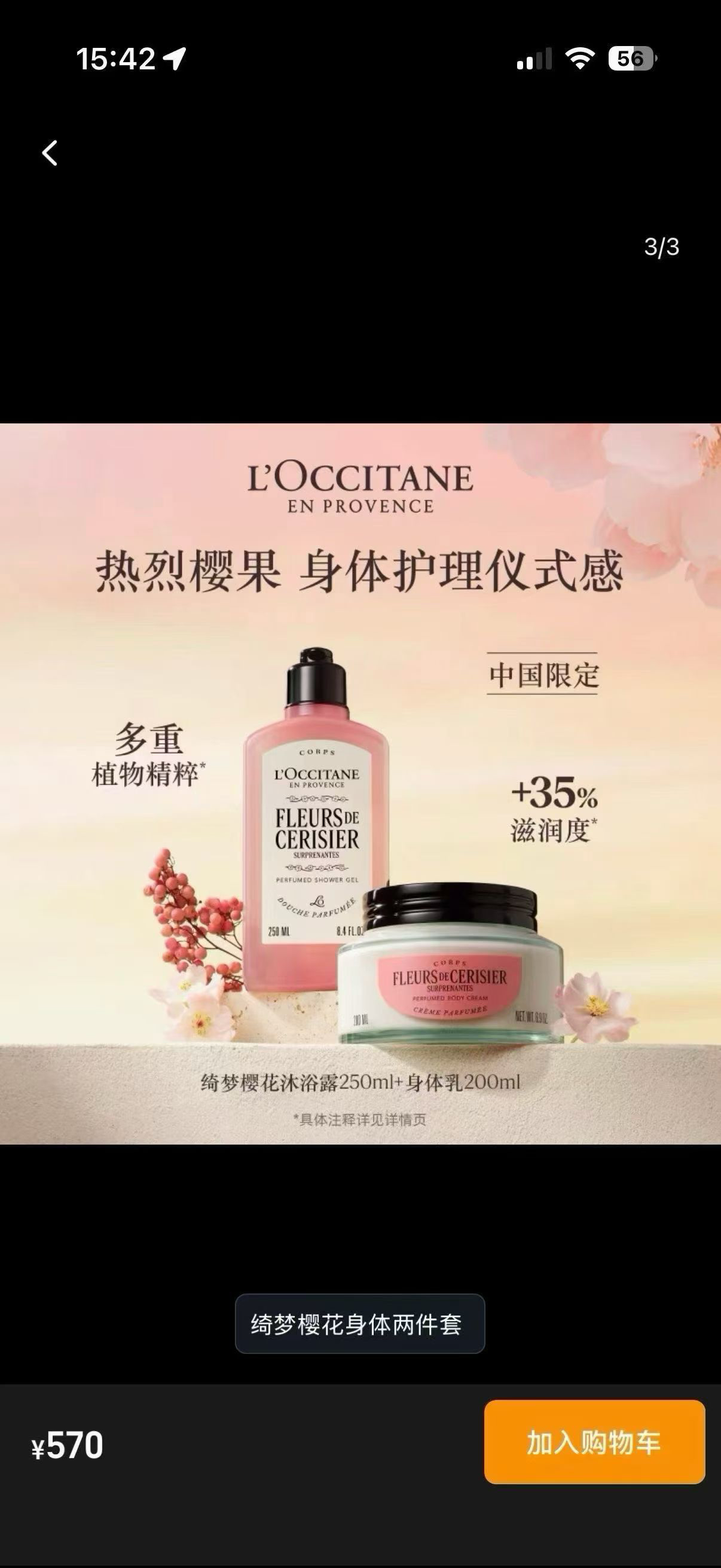 原价570 欧舒丹绮梦樱花两件套 沐浴露250ml+身体乳霜200ml 花果香调