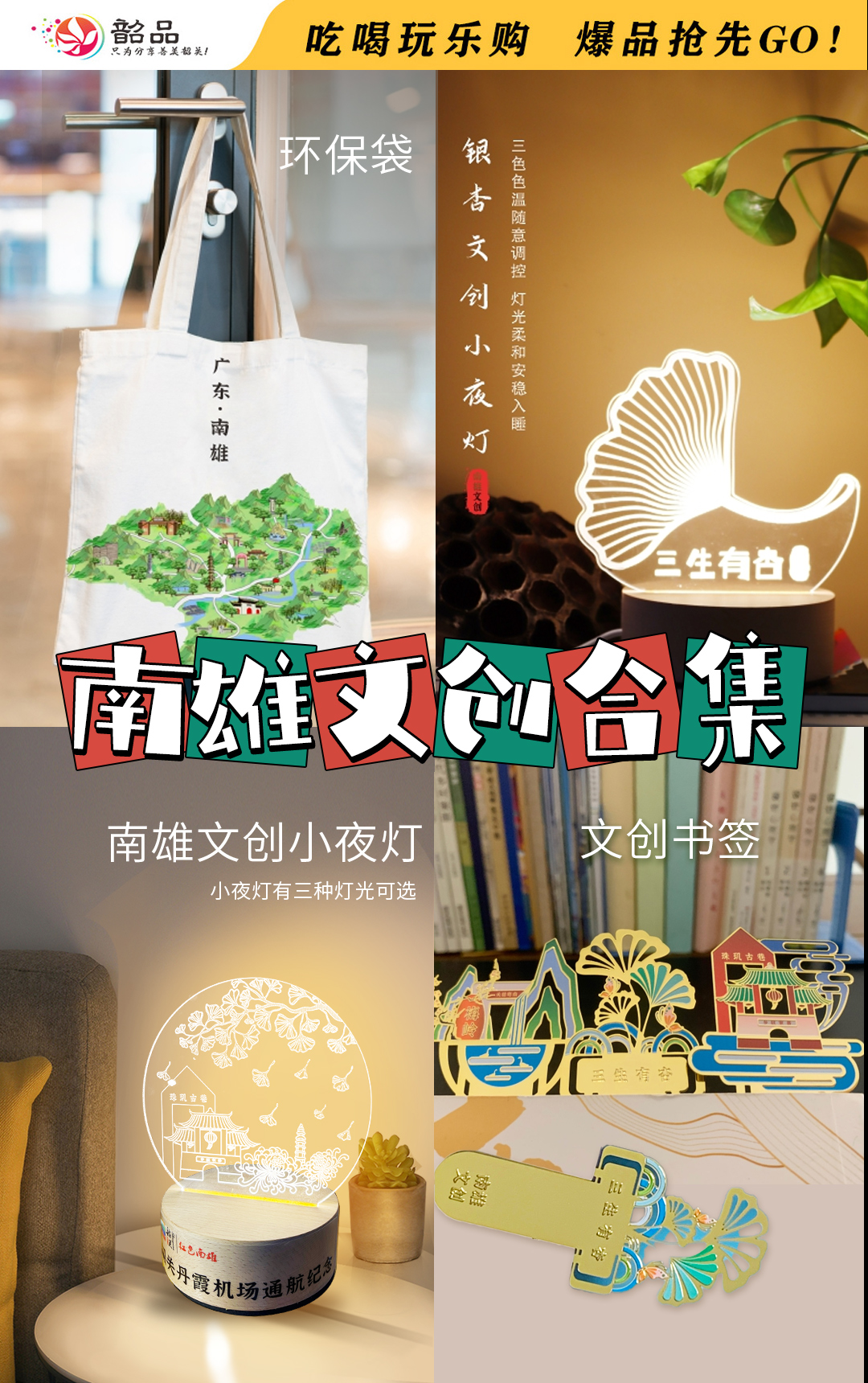 南雄文创小夜灯:<珠玑古巷款>以珠玑古巷门楼、菊花、南雄标志性建筑三影塔以及漫天飞舞的南雄银杏为元素设计的一款实用性强的小夜灯,小夜灯有三种灯光可选;以及银杏为主题原色的<三生有杏>款文创小夜灯。