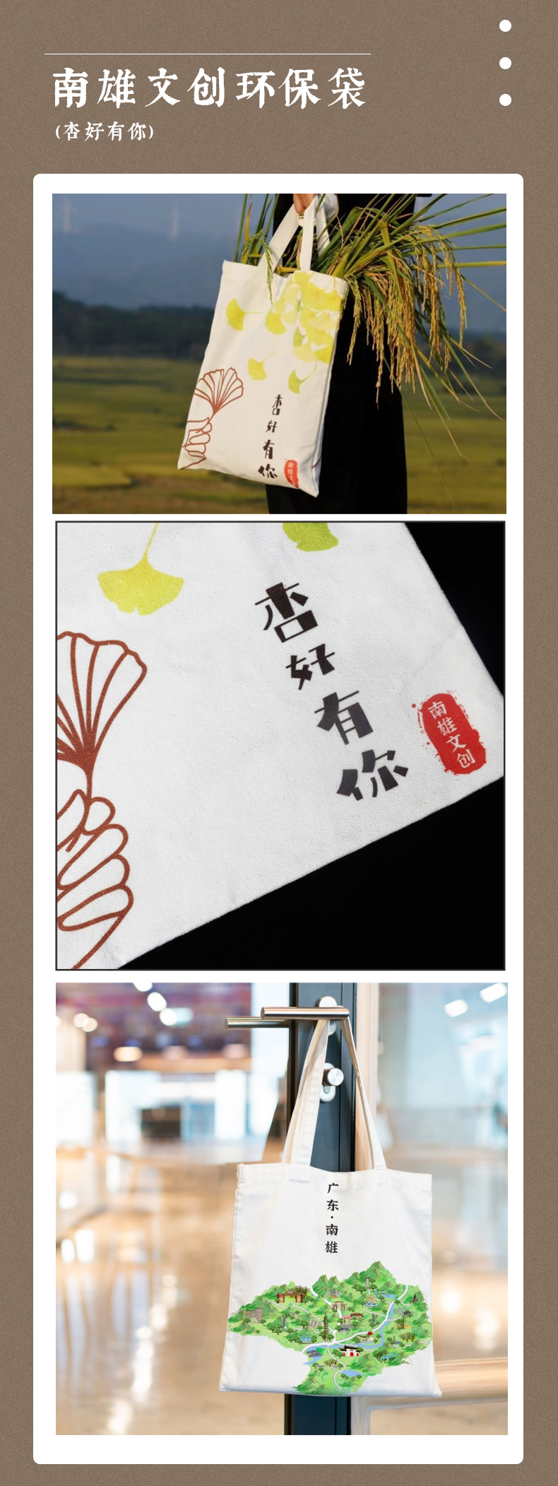 南雄环保袋:设计灵感来源于南雄代表性的银杏,银杏象征着秋,温柔而治愈,经过设计成帆布袋,将这份美好和温柔传递。整体设计借助银杏寓意美好,三生有杏,杏好有你。杏好在南雄遇见你,让更多的人了解银杏文化,了解南雄。