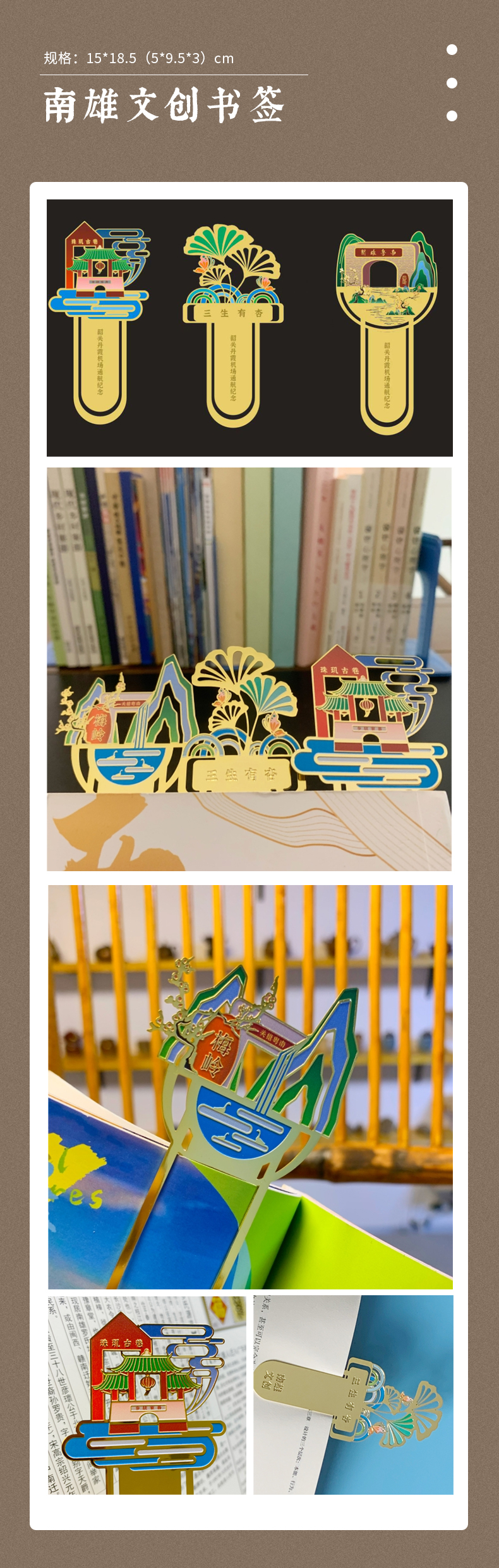 梅关古道景区里标志性建筑和元素为设计灵感,以观赏性与实用性相结合做成的文创。其中珠玑古巷书签以南门楼牌坊和古楼加祥云点缀,梅关古道以古道旁的崇山峻岭和梅花,银杏以寓意美好的镂空设计代表南雄的金色。
