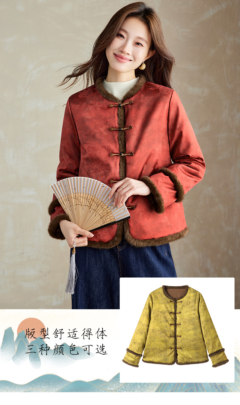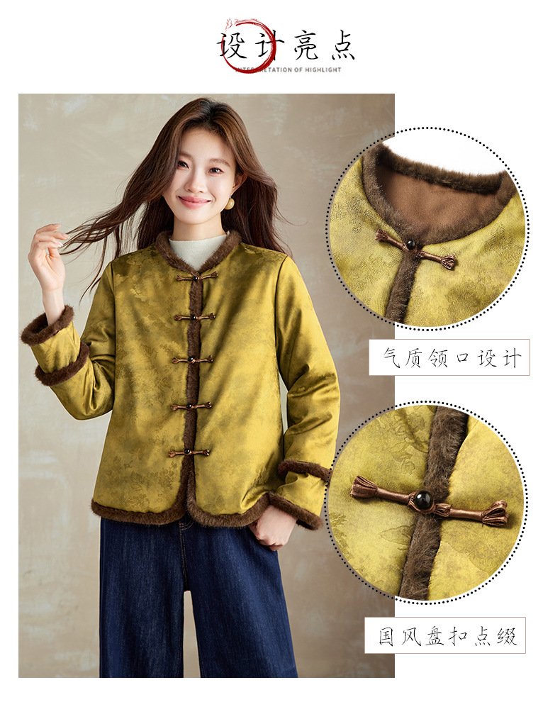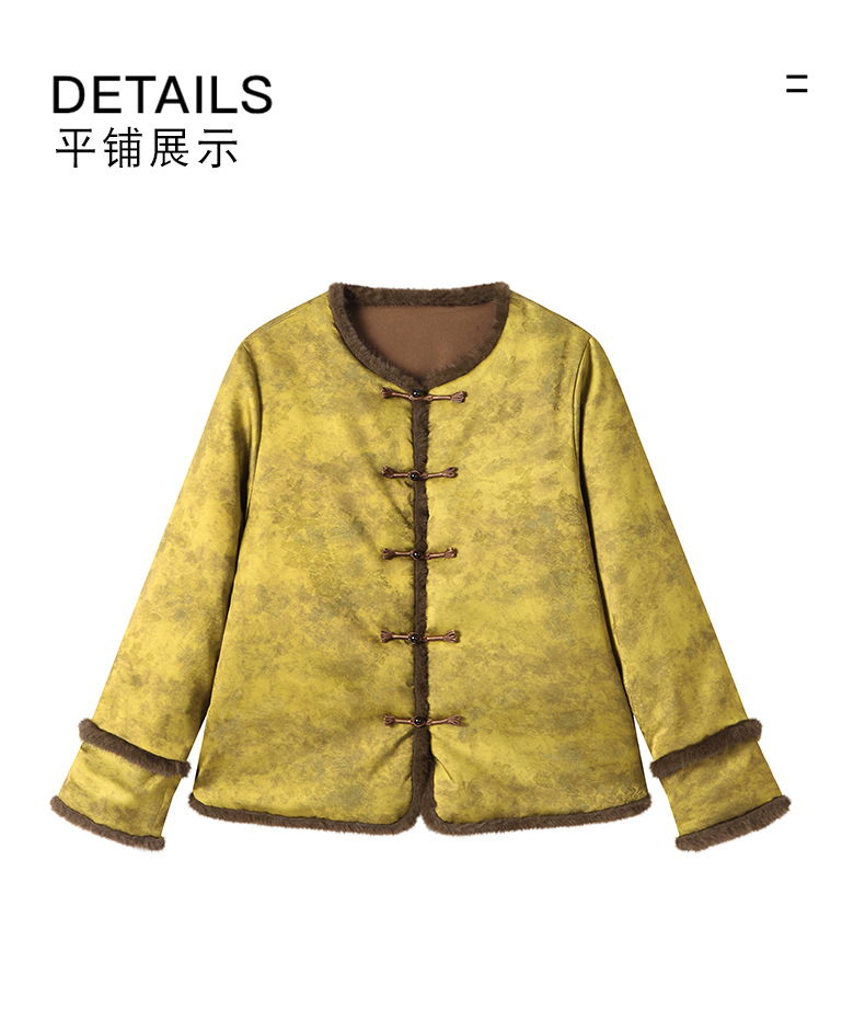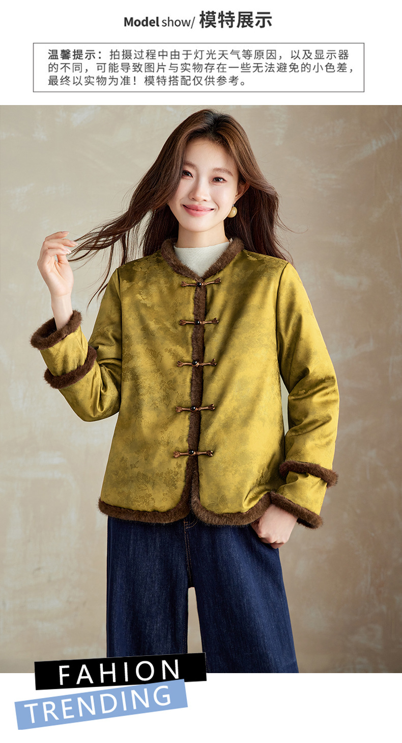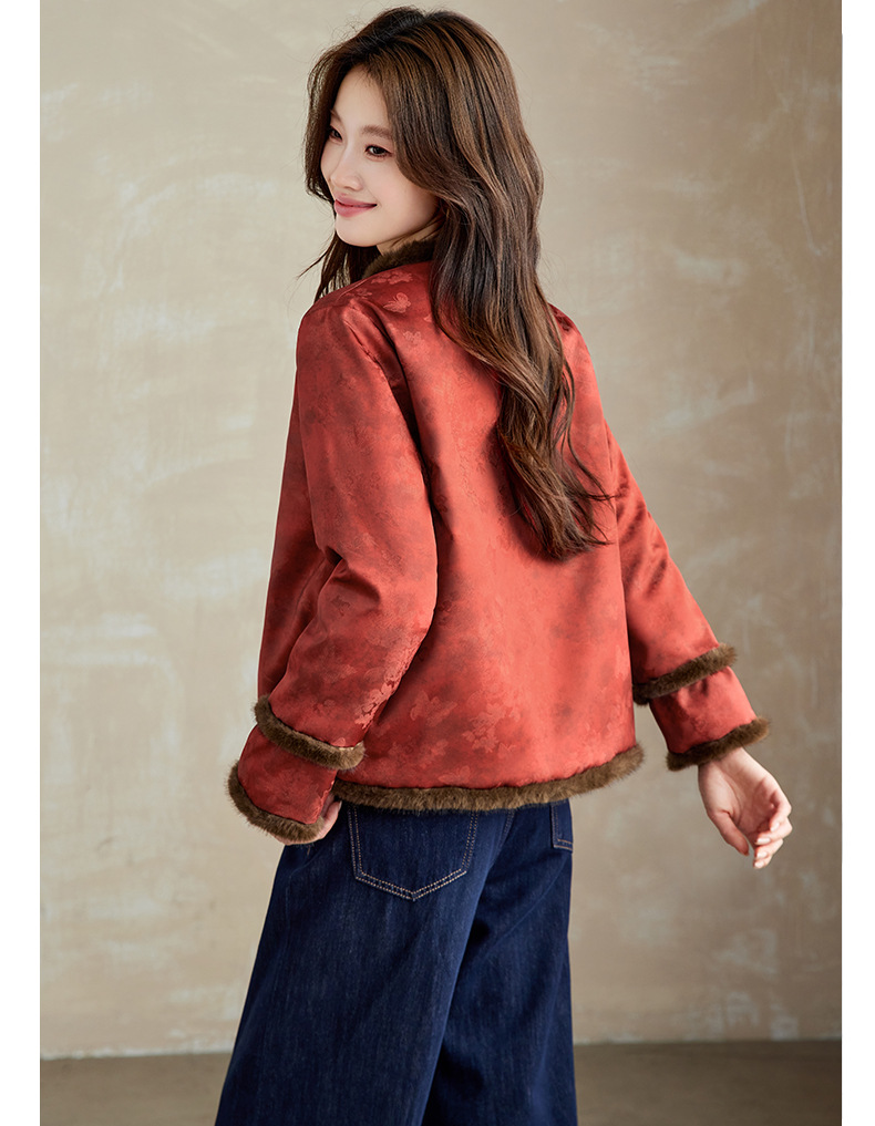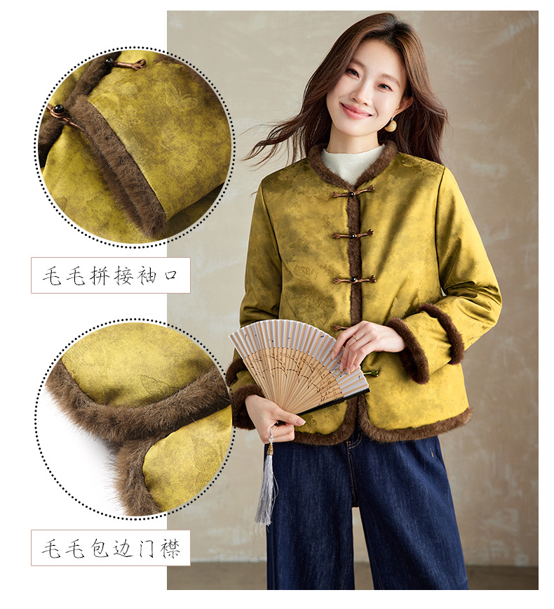 百媚生 提花夹棉拼接貂毛保暖加厚棉服国风时尚百搭小棉袄66095 商品图0