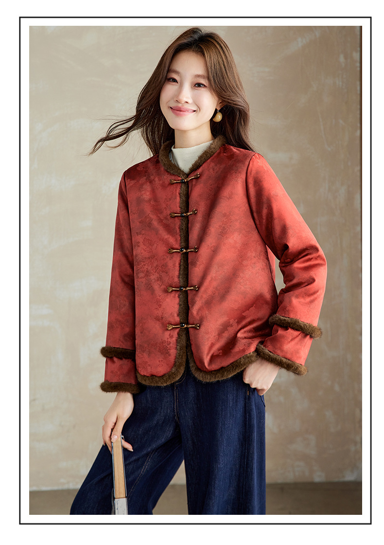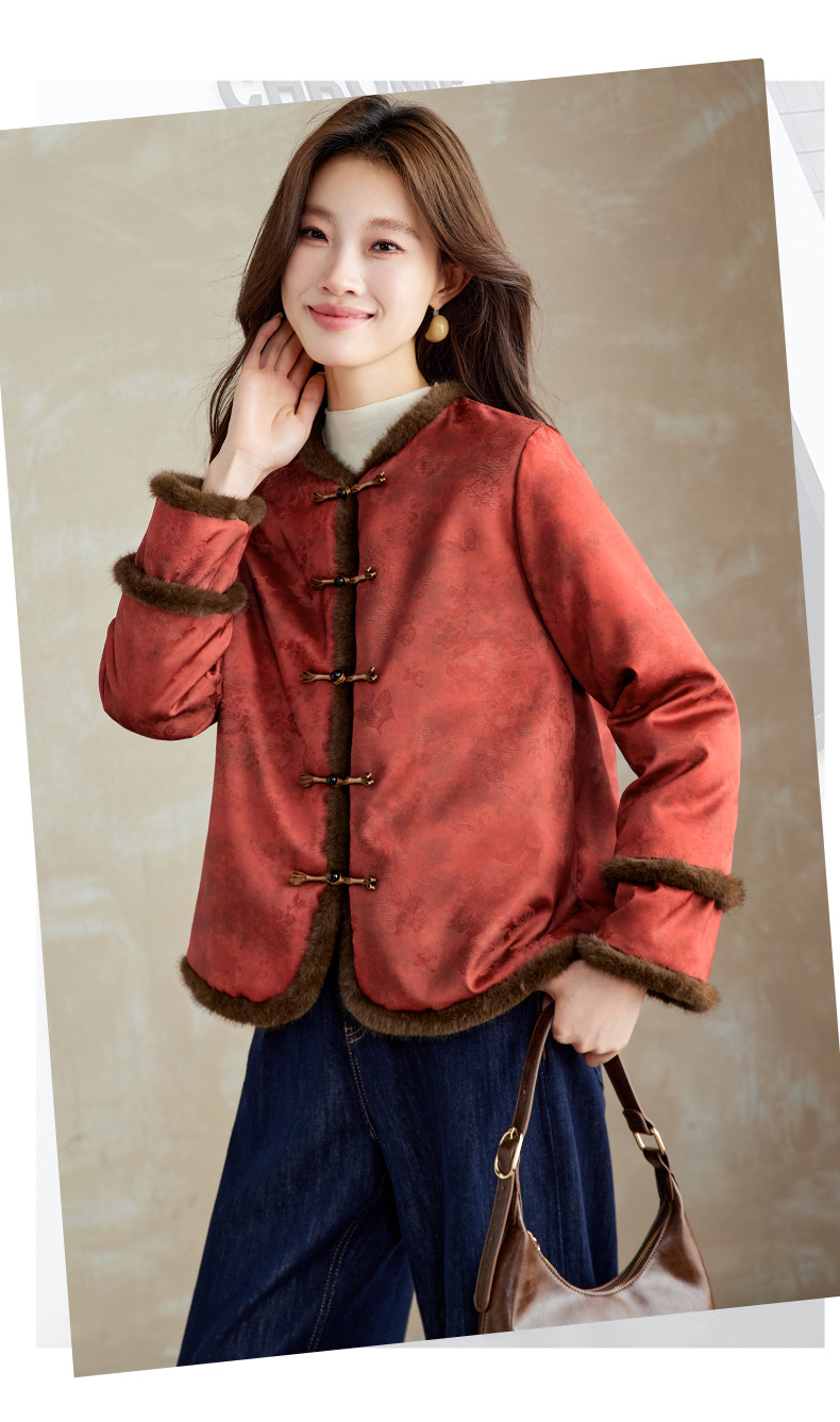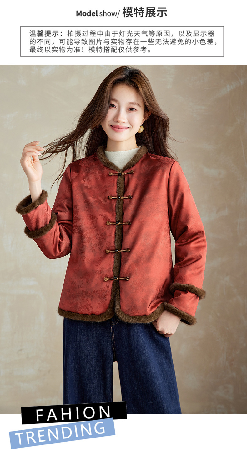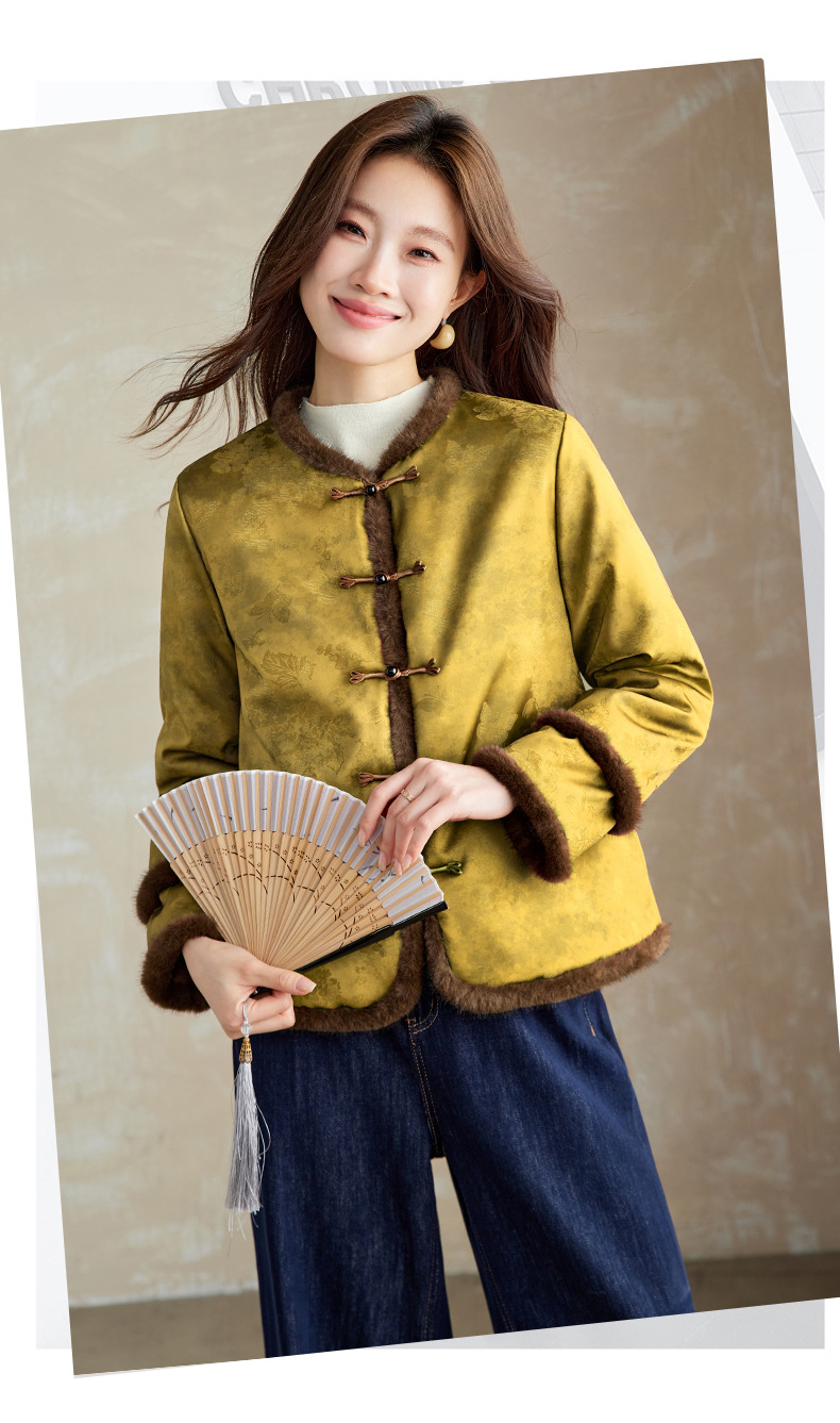 百媚生 提花夹棉拼接貂毛保暖加厚棉服国风时尚百搭小棉袄66095 商品图0