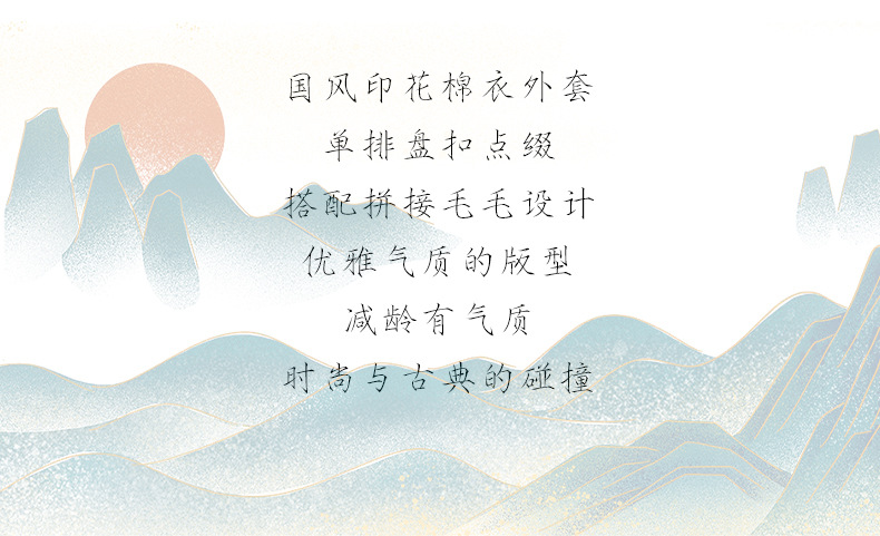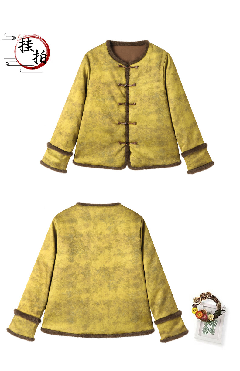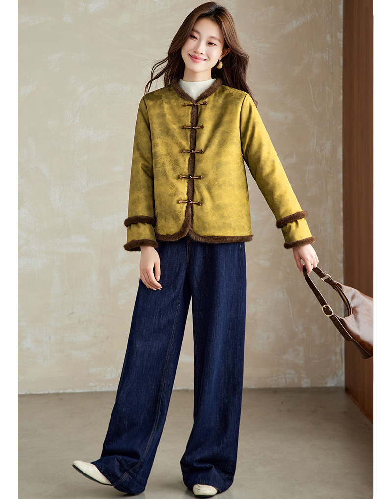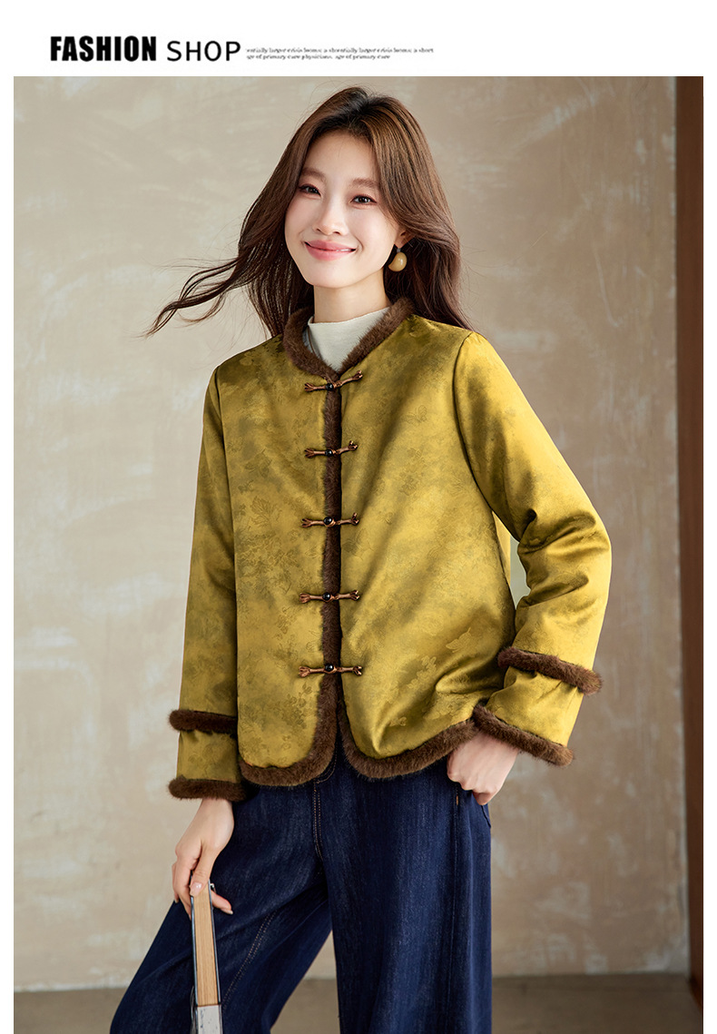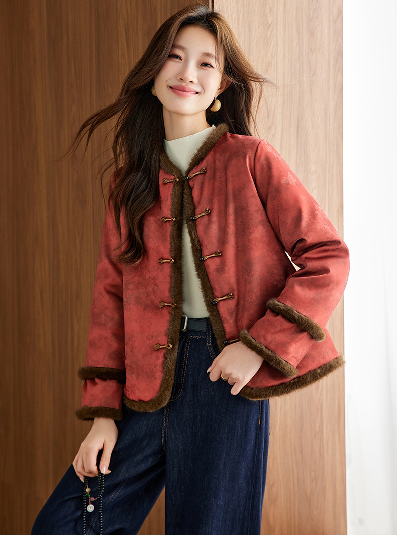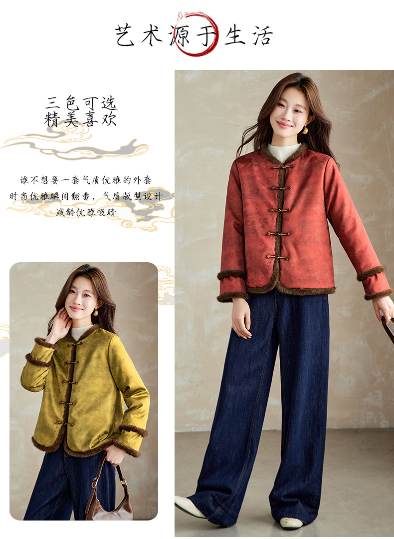 百媚生 提花夹棉拼接貂毛保暖加厚棉服国风时尚百搭小棉袄66095 商品图0