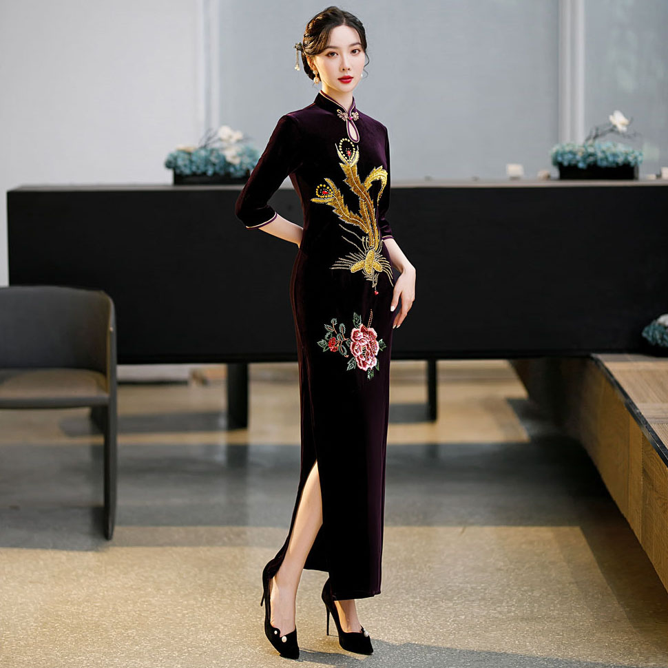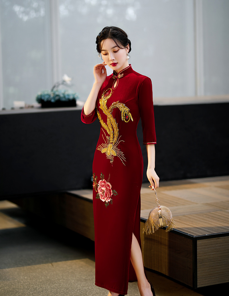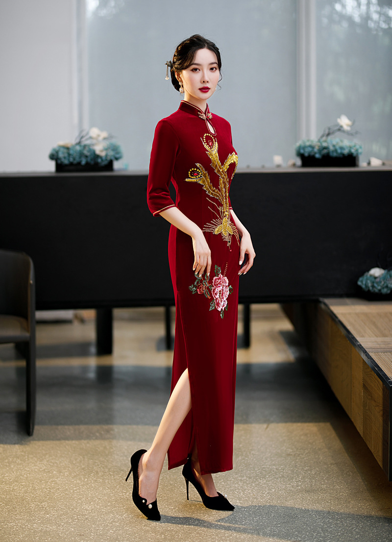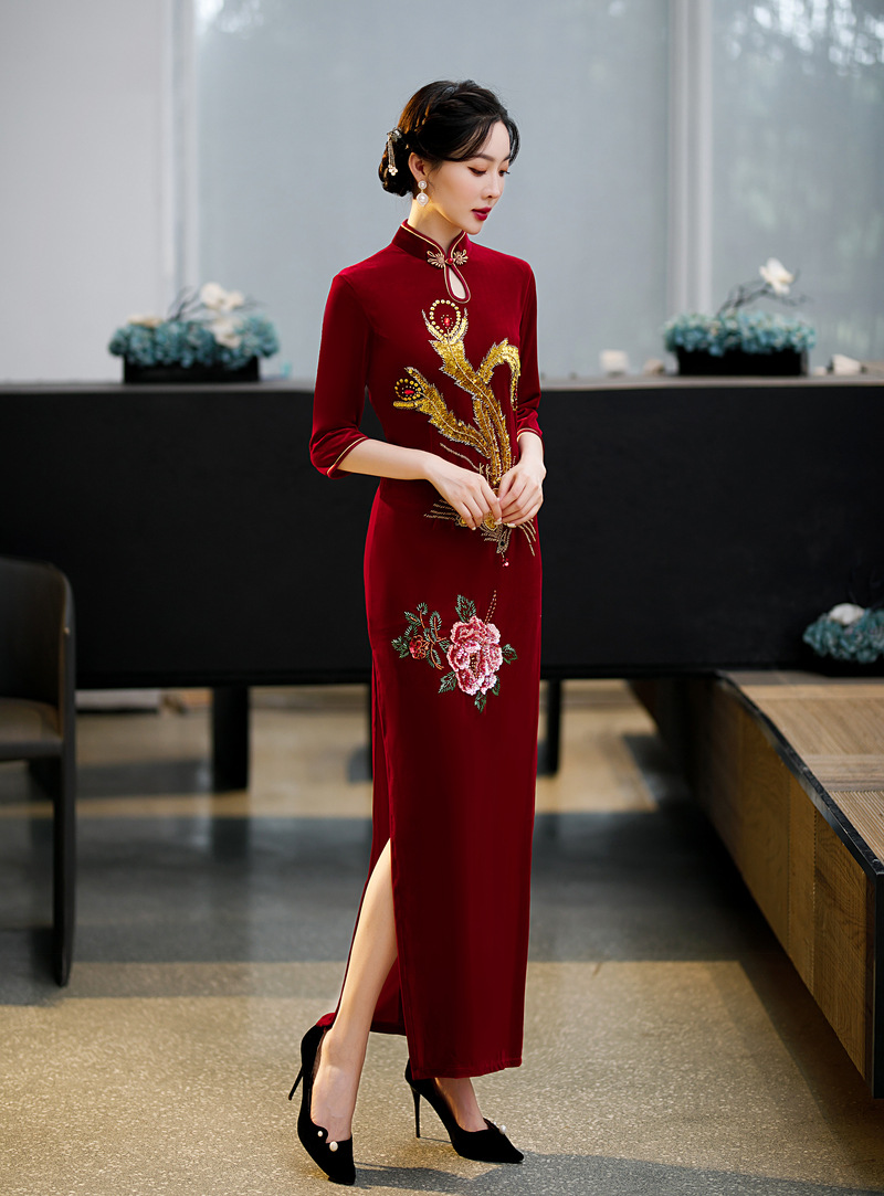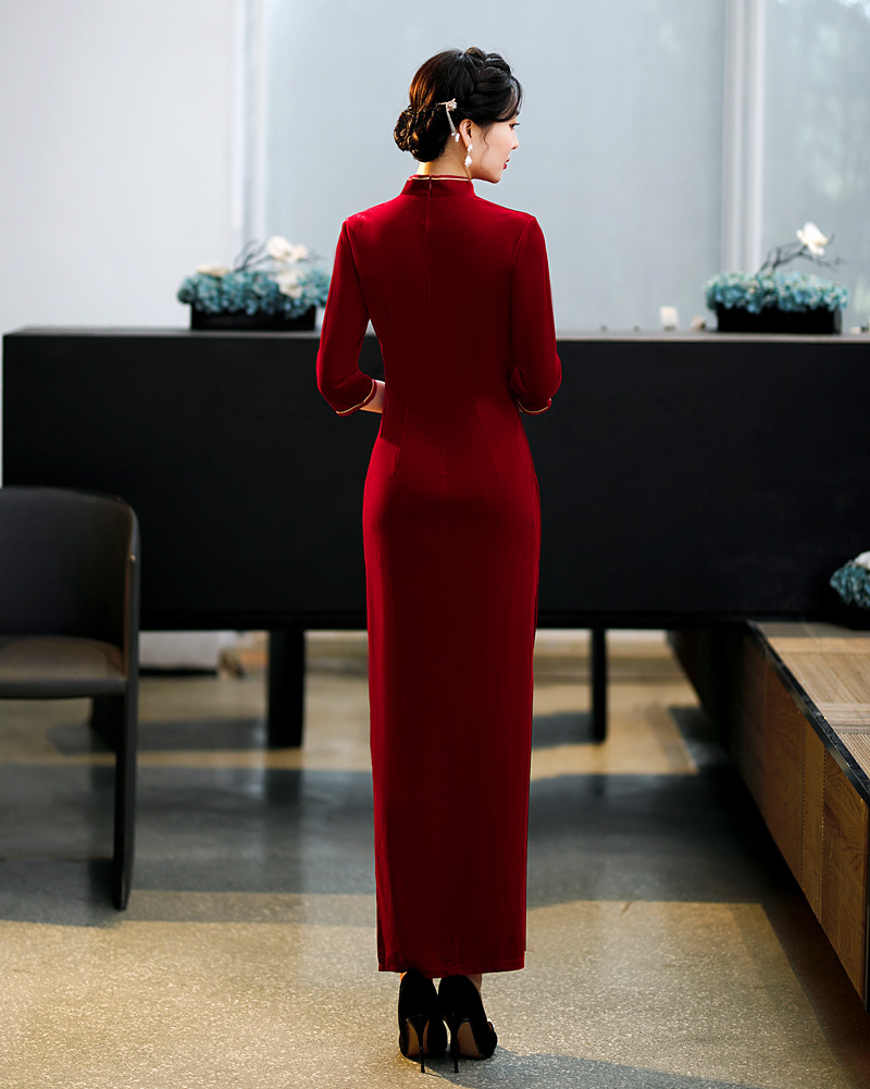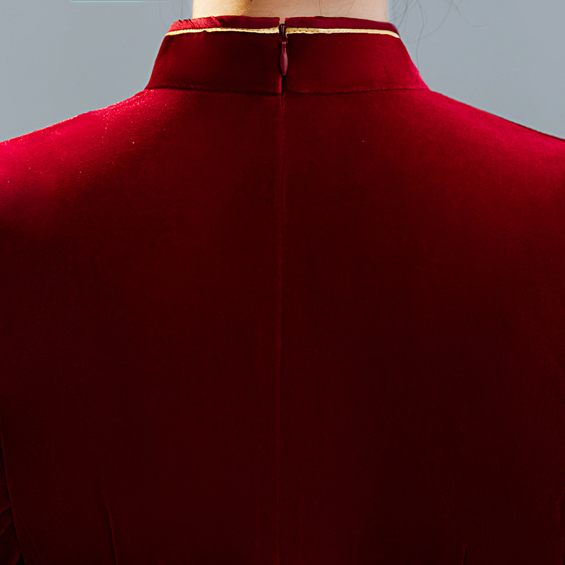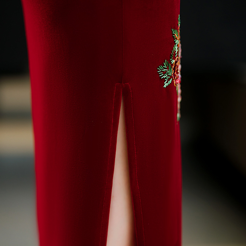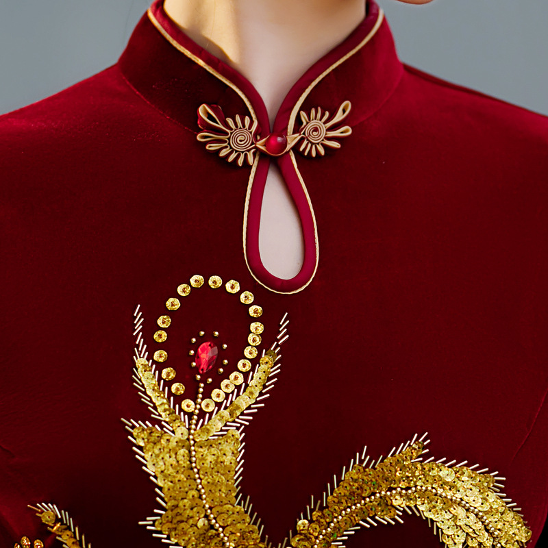 上海旗袍厂ZAYS-9108红秋冬金丝绒长款手工钉珠旗袍日常婚宴礼服红色妈妈装旗袍