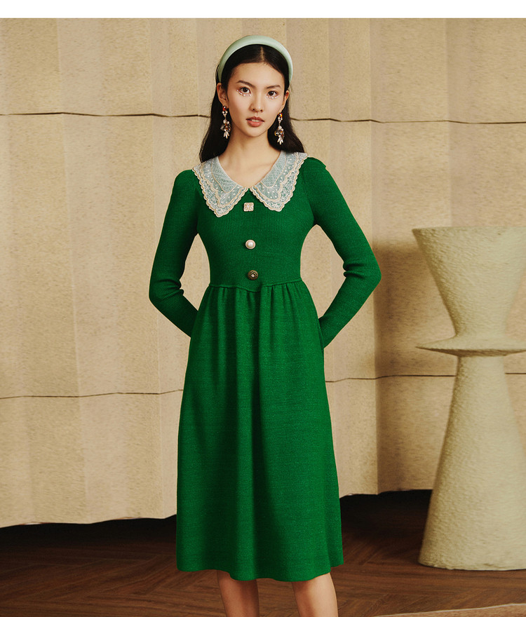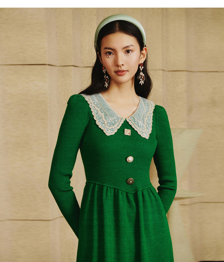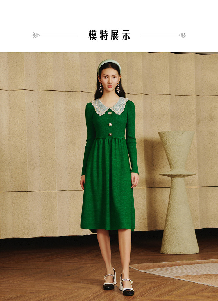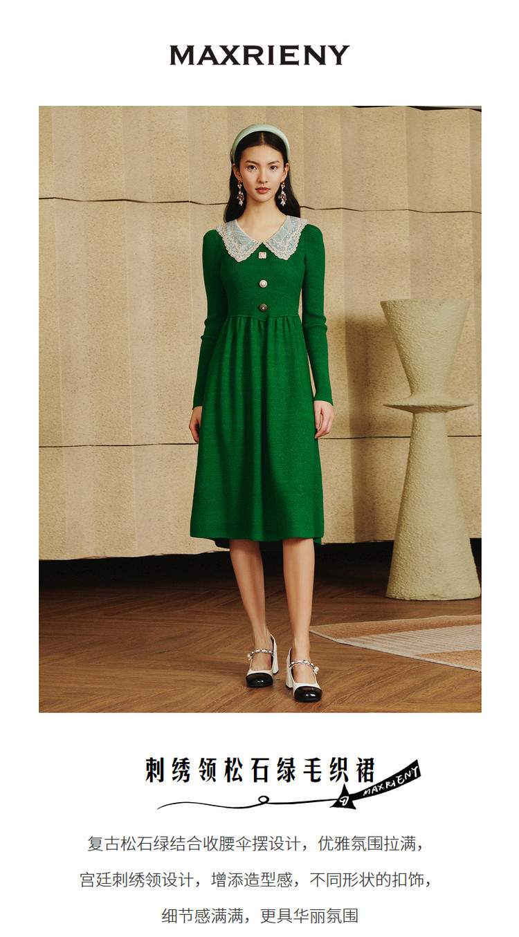 法式复古刺绣领松石绿毛针织连衣裙秋季裙子