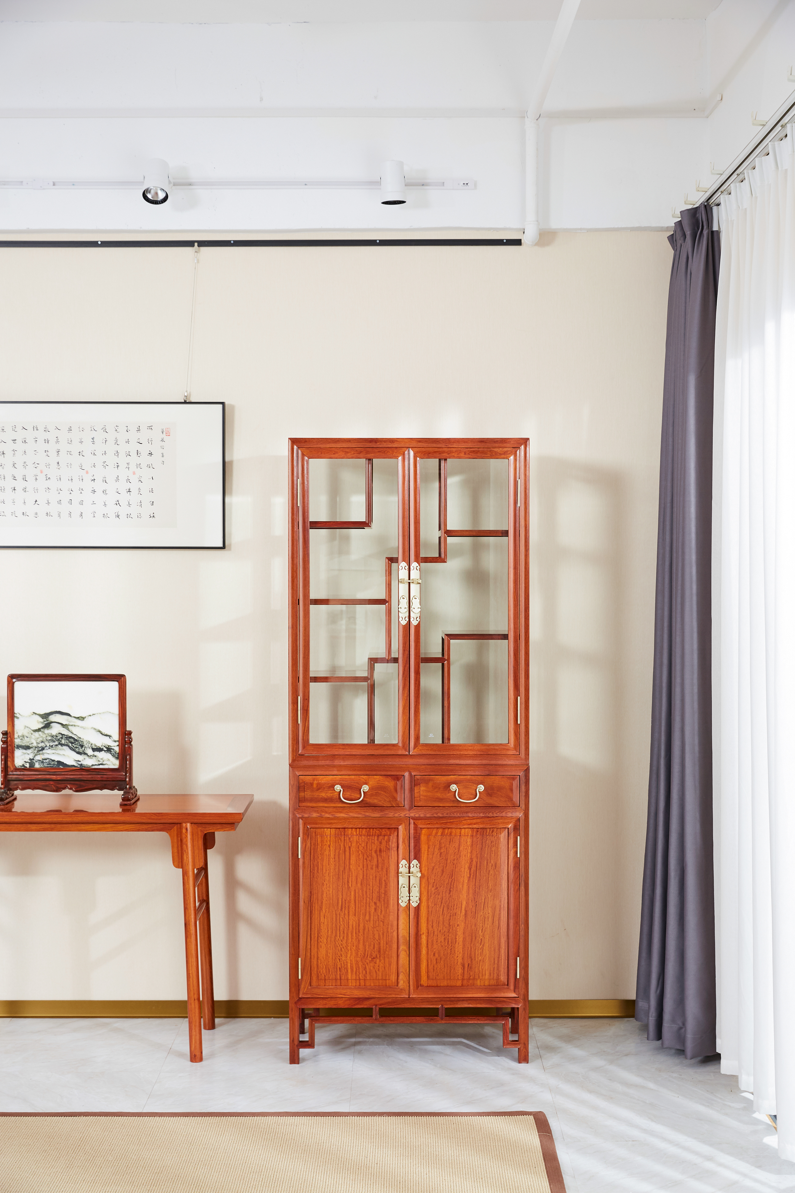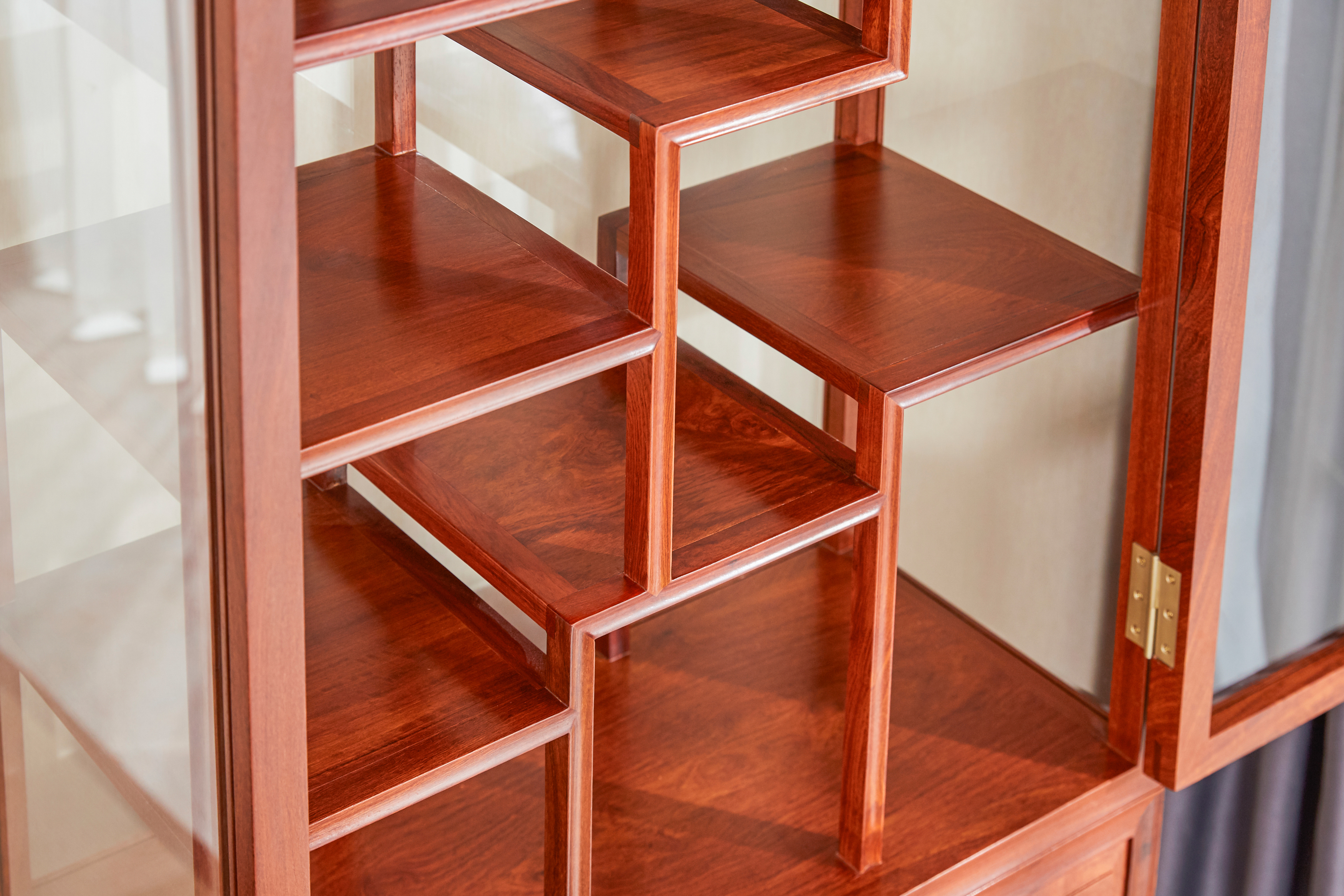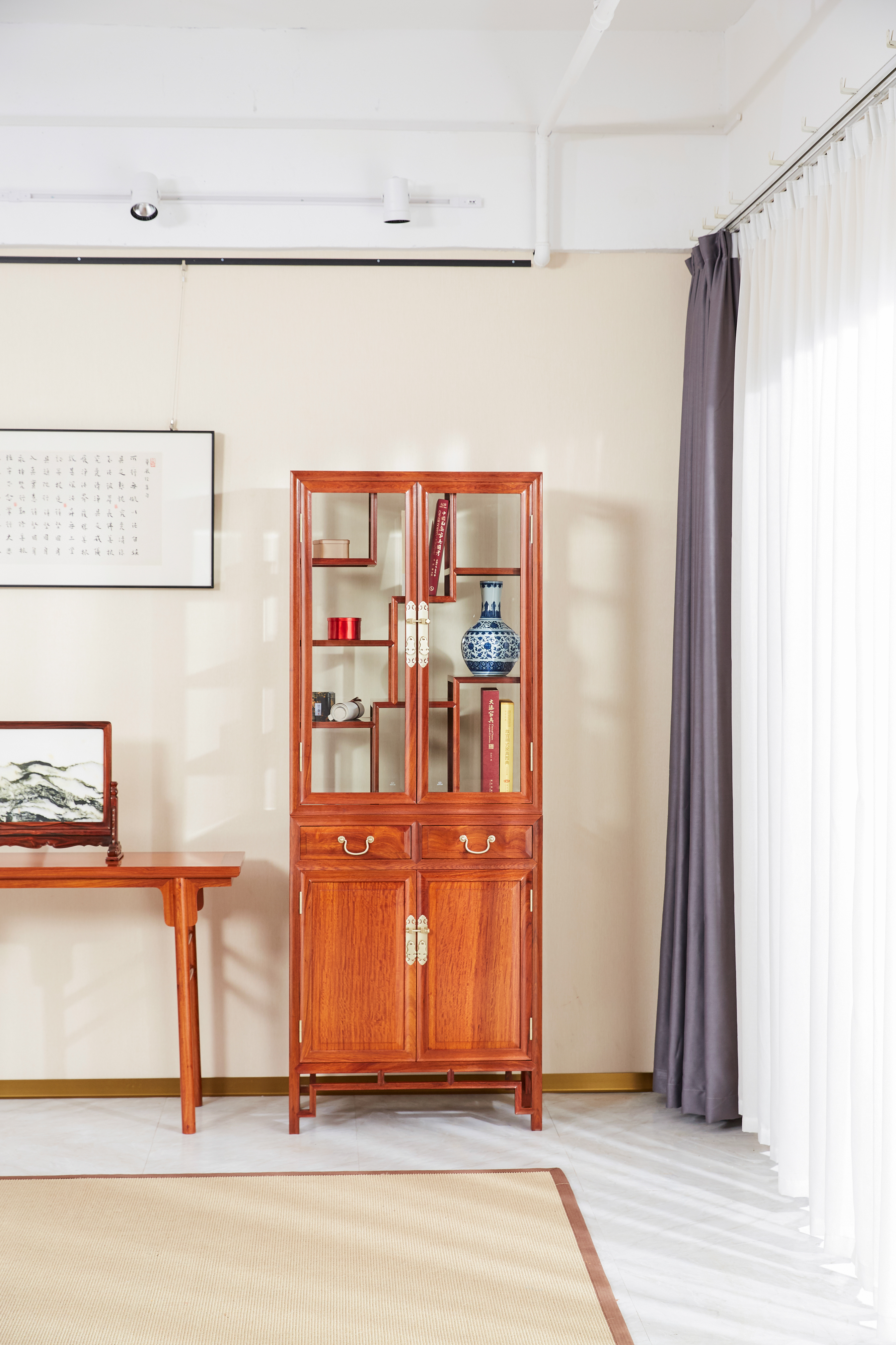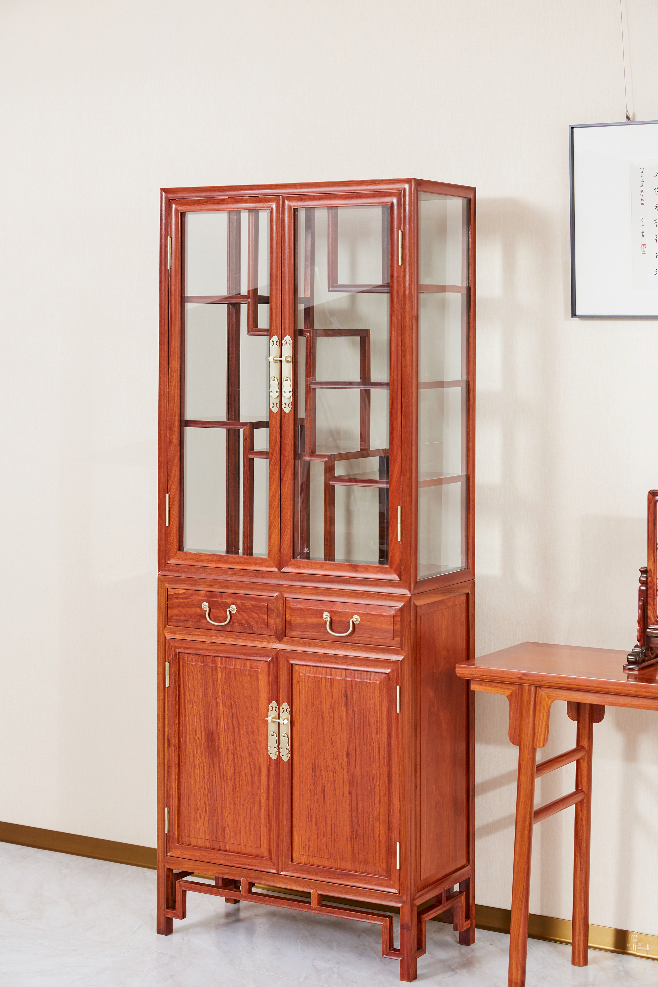 多宝阁形玻璃展示柜,是一种具备承置物品展示和储藏物品双重功能的家具。展示柜造型高挑,占地不多,采用上下分层设计,上层透明玻璃柜展示,博古架式内构,错落有致,层次丰富,下层柜子正面为对开门,储物空间大,容量大,大件物品也可轻松容纳,整器一柜多用,展示收纳一应俱全。
