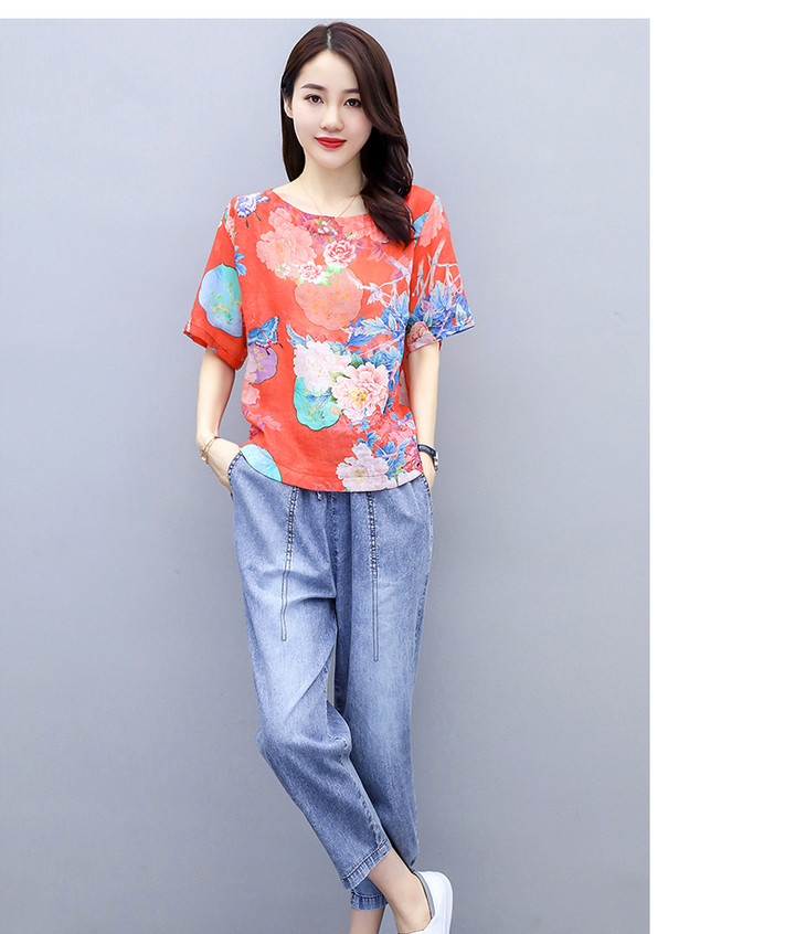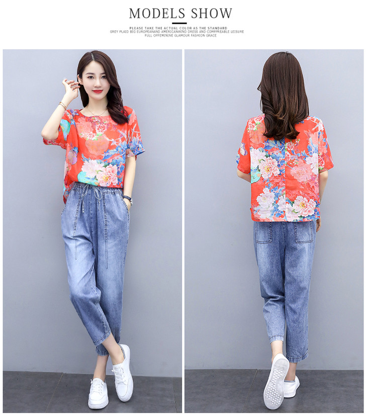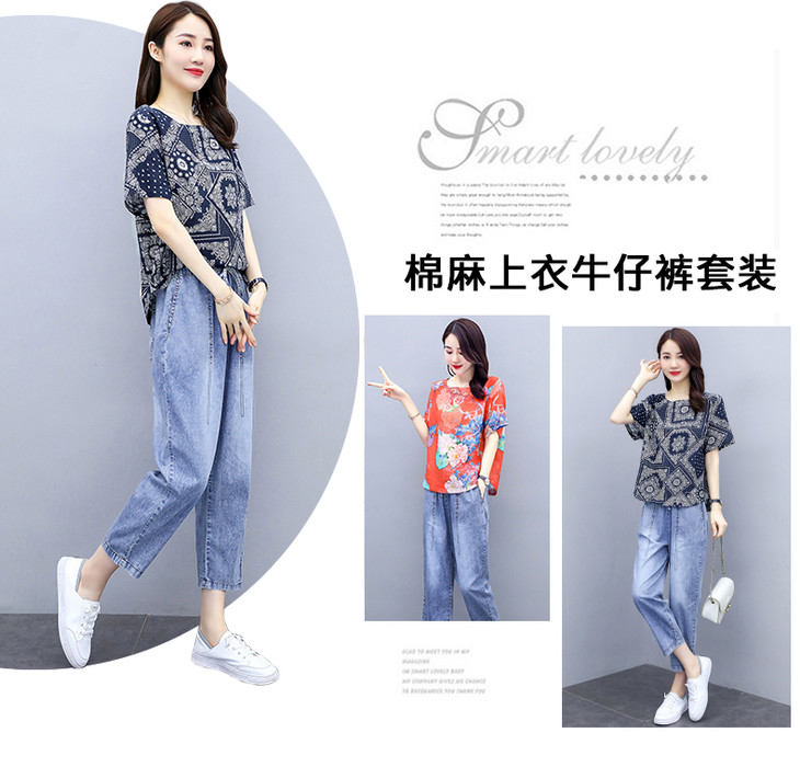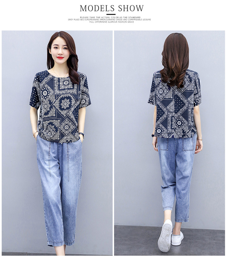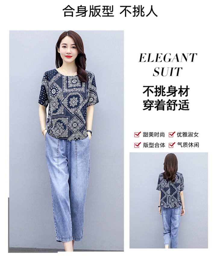 Q-ASG2028时尚休闲,印花上衣牛仔裤套装