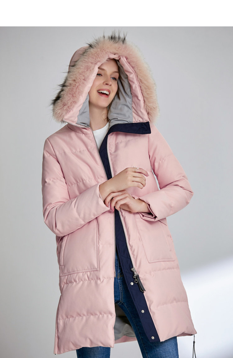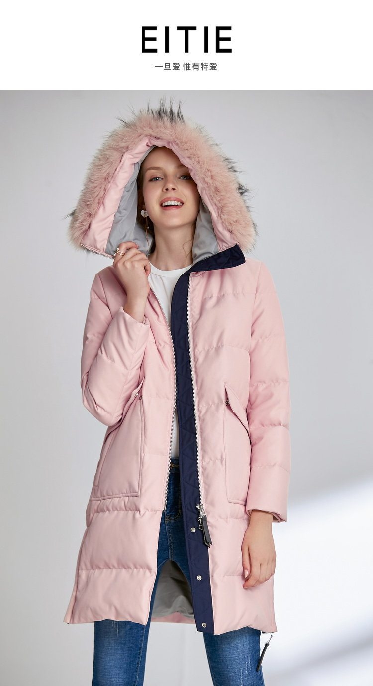 EITIE爱特爱女装冬新品加厚狐狸毛领中长款直筒连帽羽绒服D1911317