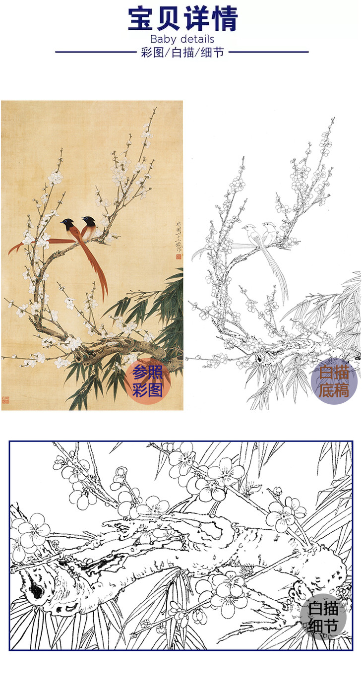于非闇竖幅工笔花鸟白描底稿-梅花梅竹绶带《绶带双清》-多种白描尺寸可选-YF13