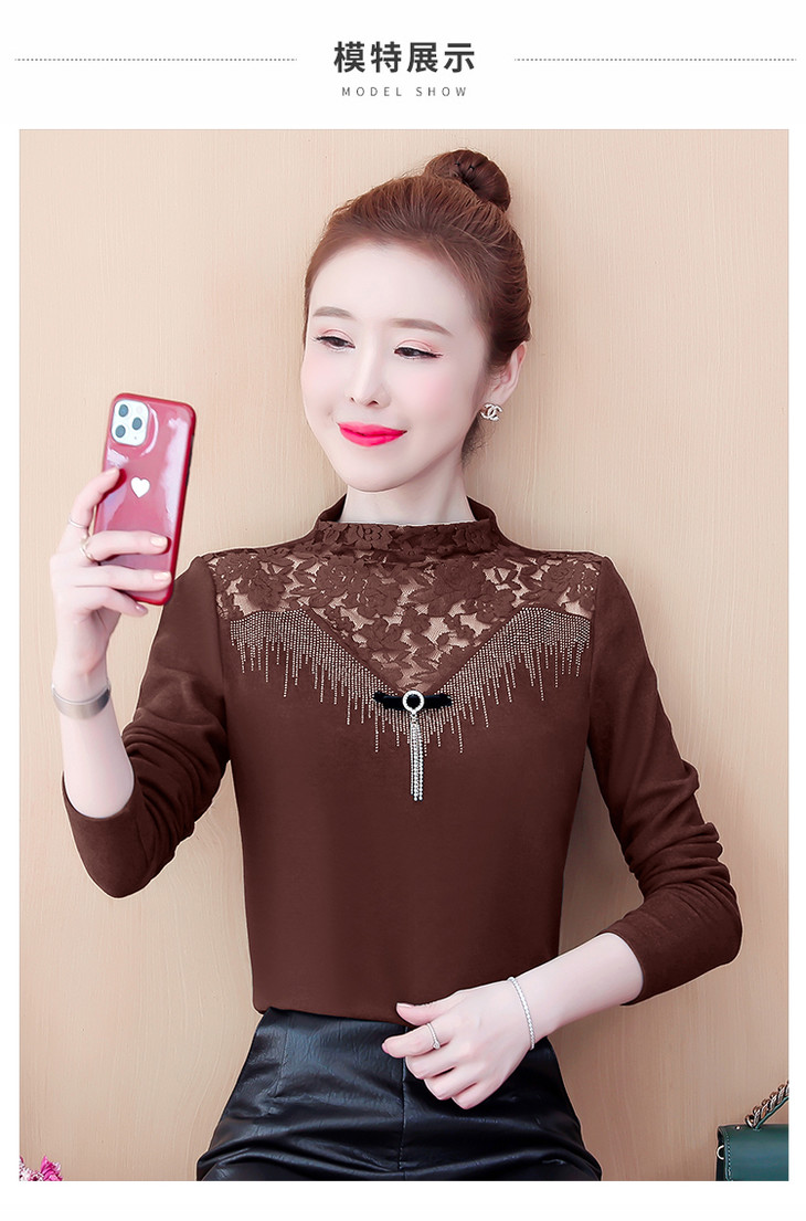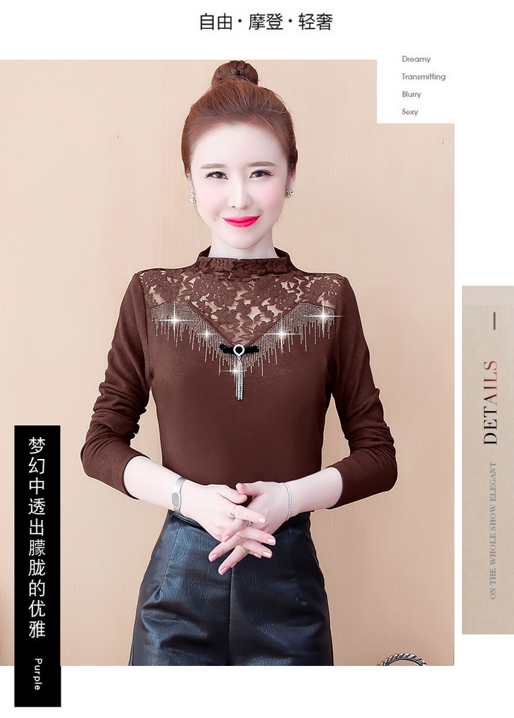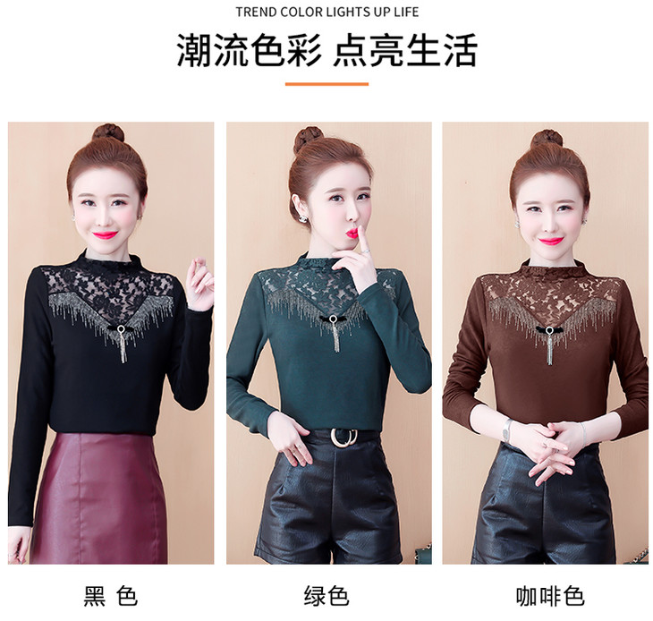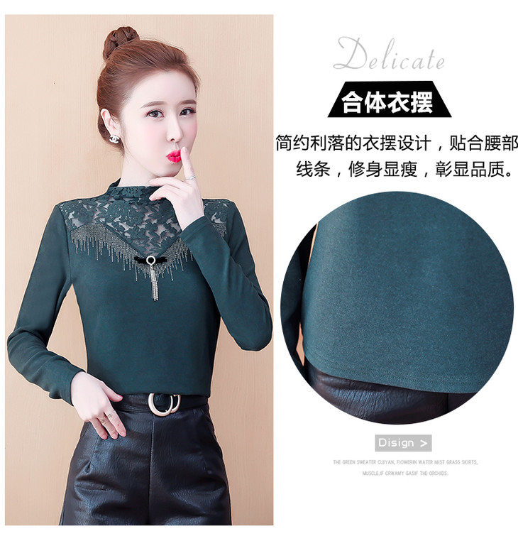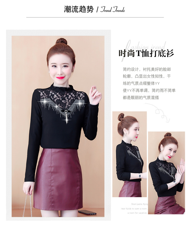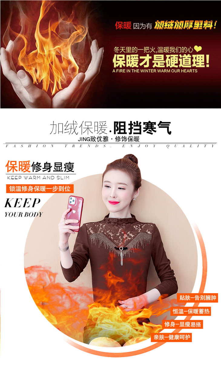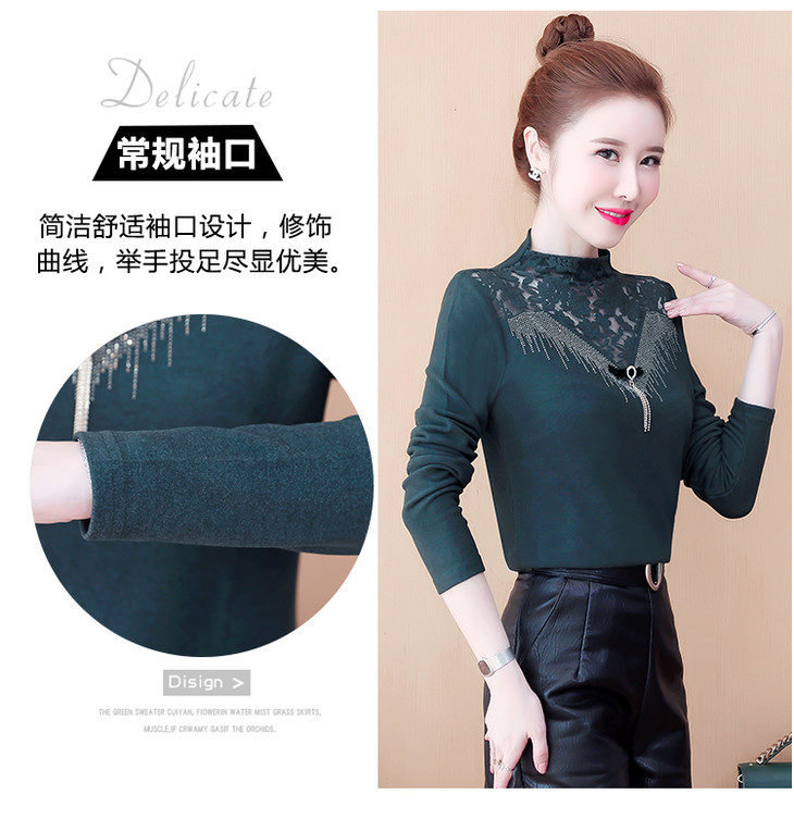KQL-320H1750 秋冬蕾丝拼接加绒加厚高领打底衫女T恤2020新款洋气烫钻长袖上衣